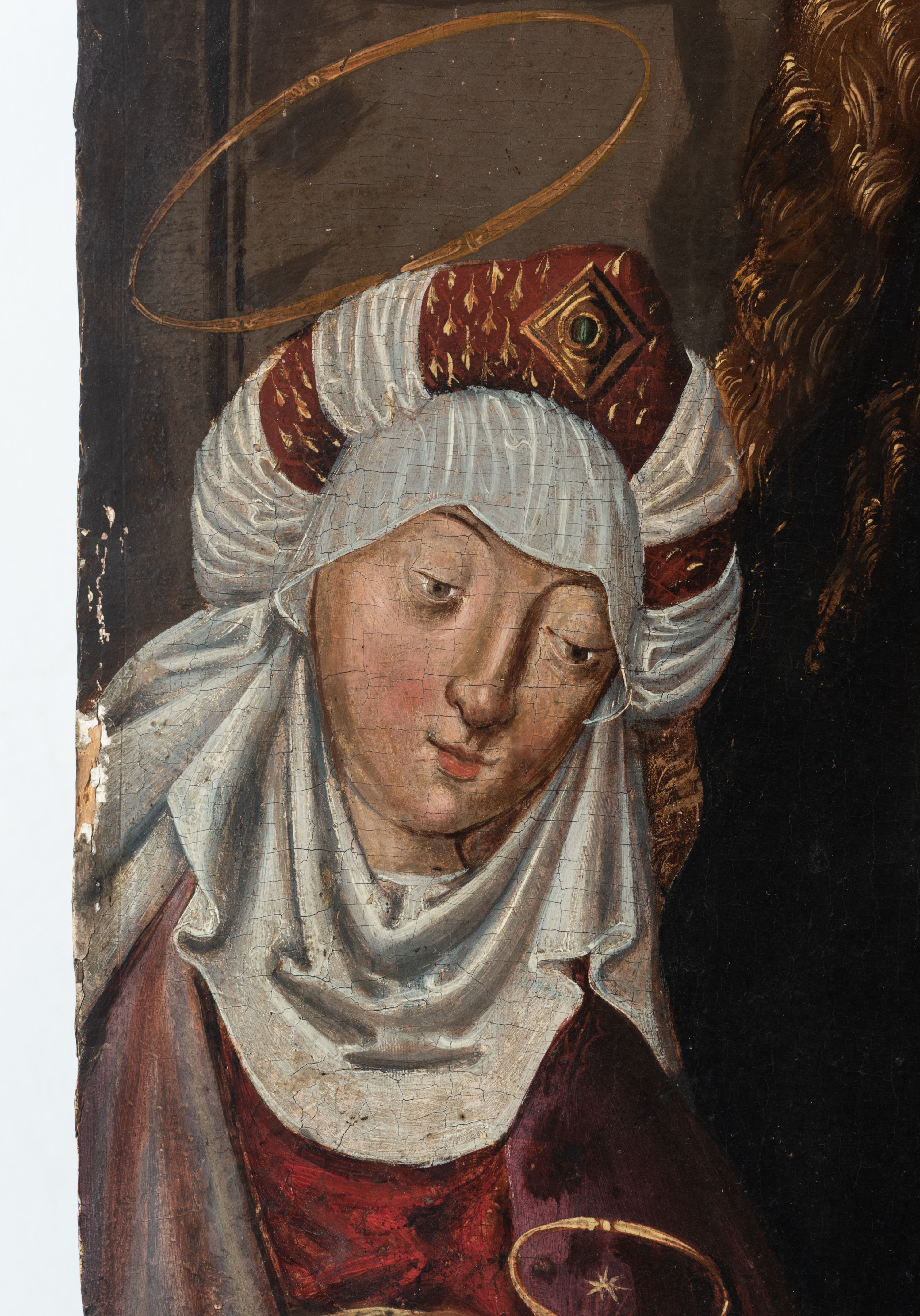 Ślady po drewnojadach, ubytki warstwy malarskiej, zwłaszcza na brzegach. Obraz odnawiany w latach 1638, 1825, 1921.
