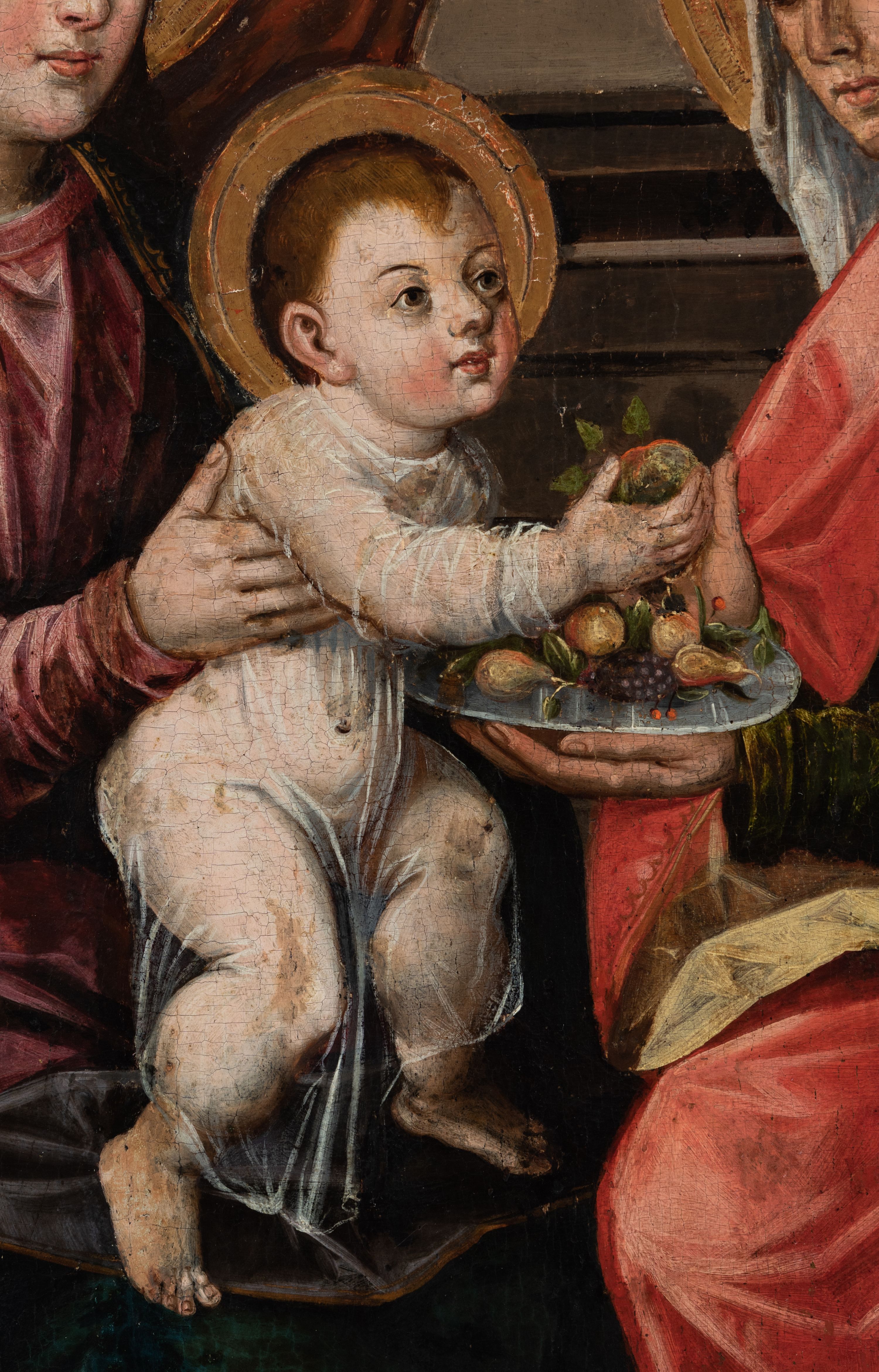 W centrum siedzące Maria i św. Anna zwrócone ku sobie. Maria dwiema wyciągniętymi przed siebie rękami przytrzymuje stojące na jej kolanach Dzieciątko. Matka Boska ma owalną twarz z wysokim czołem, małymi oczami, prostym nosem i małymi ustami; okoloną długimi, kręconymi włosami opadającymi na ramiona, z opaską nad czołem. Ubrana jest w różową suknię oraz granatowy płaszcz ze złoconą lamówką zarzucony na ramiona i kolana. Dzieciątko zwrócone jest w trzech czwartych w lewo, dłońmi sięga po owoce, które na półmisku trzyma św. Anna, ma ugięte nóżki. Twarz okrągła o pełnych policzkach z wyraźnie zaznaczonym podbródkiem, o dużych oczach, zadartym nosie i pełnych ustach; okolona krótkimi włosami z lokiem na czole. Ubrane jest w długą, przezroczystą tunikę. Święta Anna lewą ręką trzyma półmisek z owocami, prawą podaje jeden Dzieciątku. Twarz o starczych rysach, dużych oczach skierowanych w dół, prostym nosie i małych ustach. Ubrana jest w zieloną suknię, czerwony płaszcz z żółtą podszewką, zarzucony na ramiona i kolana. Na głowie ma biały welon. Cała trójka ma wokół głów złocone i tłoczone w zaprawie nimby.