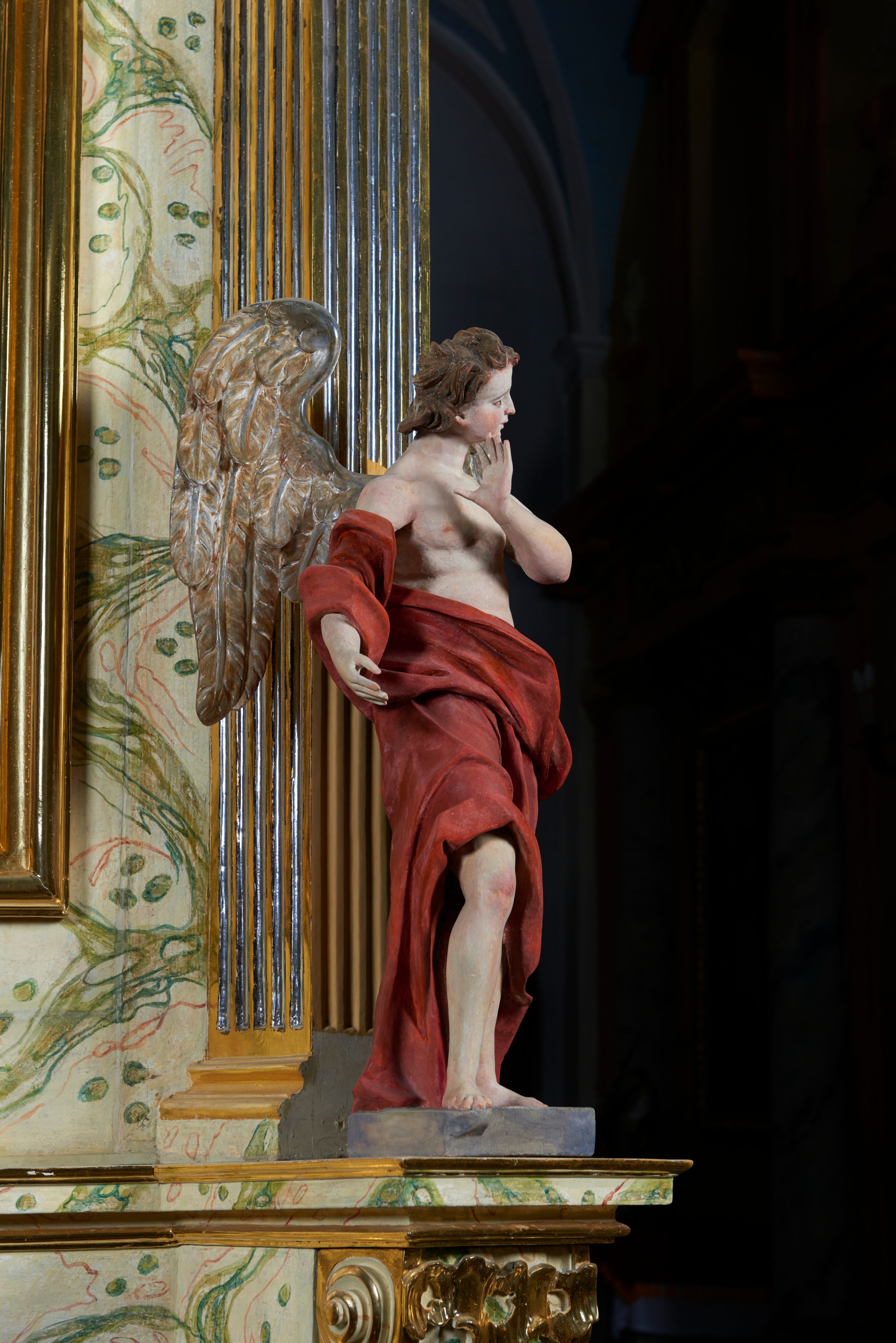 Rzeźba anioła, przyścienna, drewniana, polichromowana, złocona, ścięta i wydrążona od tyłu. Anioł przedstawiony frontalnie, w pozycji stojącej, w kontrapoście. Prawa ręka lekko zgięta wyciągnięta ku przodowi. Lewa dłoń uniesiona ku twarzy. Głowa osadzona na długiej szyi, lekko uniesiona ku górze, przechylona w kierunku prawego ramienia i zwrócona w ¾. Twarz o młodzieńczych rysach, pociągła, dość szczupła, z prostym nosem, drobnymi, lekko rozchylonymi ustami, prostym nosem i wystającym podbródkiem. Głowa okolona jasnobrązowymi, falowanymi wlosami. U ramion anioła skrzydła. Anioł odziany w udrapowane szaty opadające swobodnie wzdłuż ciała i obnażające tors. Polichromia ciała naturalistyczna. Szaty koloru czerwonego. Skrzydła anioła złocone.