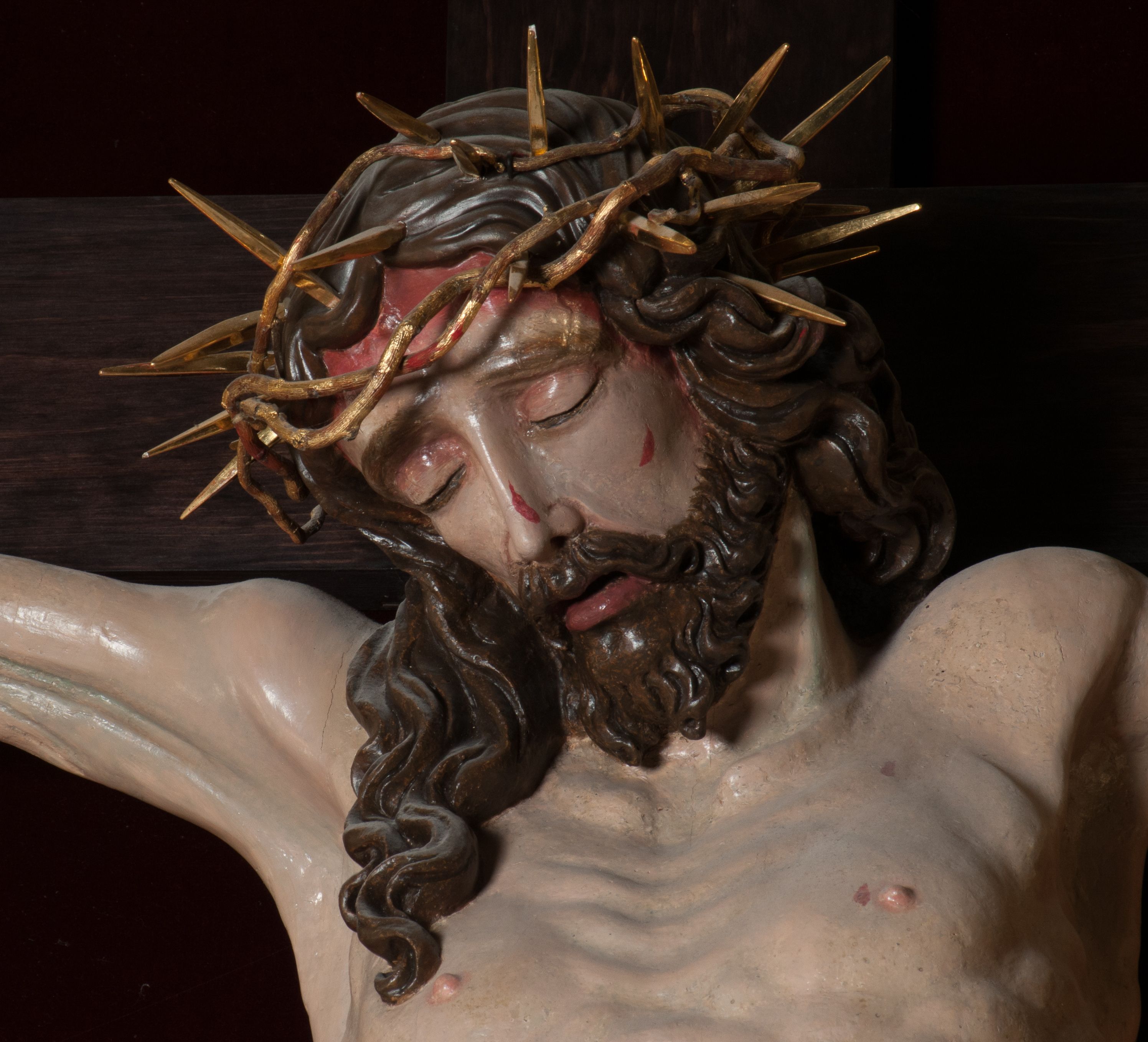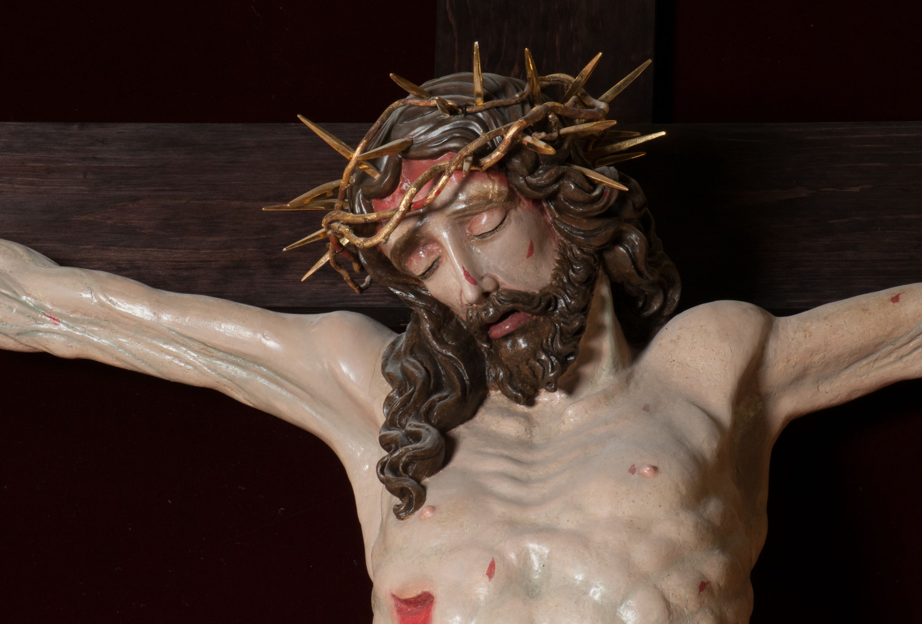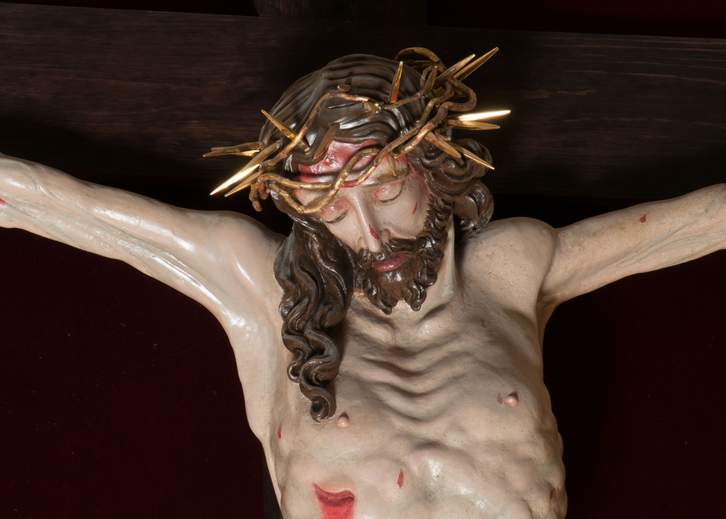 Chrystus, w typie Christo morto, rozpięty na drewnianym, prostym krzyżu łacińskim z titulusem z napisem INRI ujętym małżowiną. Chrystus przybity trzema gwoździami, w lekkim zwisie ciała i nogami ugiętymi w kolanach, ze stopami założonymi prawa na lewą. Na biodrach złocone, pofałdowane perizonium przytrzymywany sznurem; prawe biodro odsłonięte. Ciało smukłe, szczupłe, z wyraźnie zaznaczoną muskulaturą, ścięgnami i żebrami. Karnacja jasna ze strużkami krwi wypływającymi z ran. Głowa w koronie cierniowej, opuszczona i przechylona na prawy bark. Oczy zamknięte. Włosy brązowe, długie, kręcone, broda o rozdwojonych końcach. Na głowie korona cierniowa.