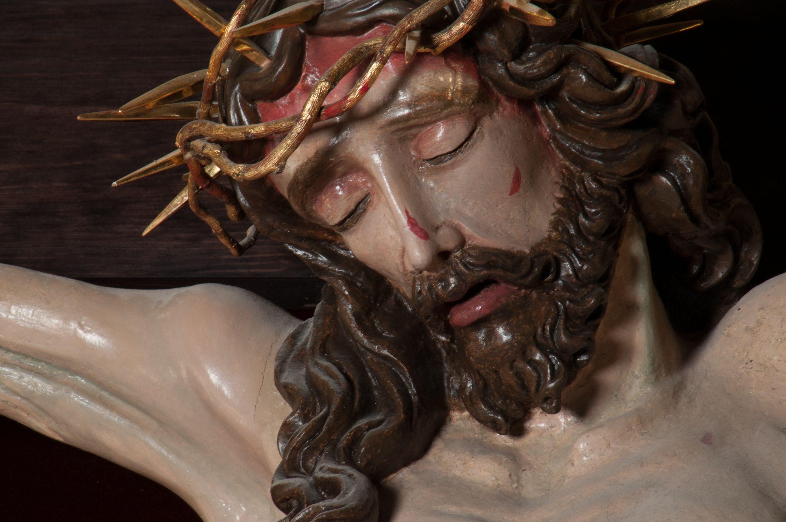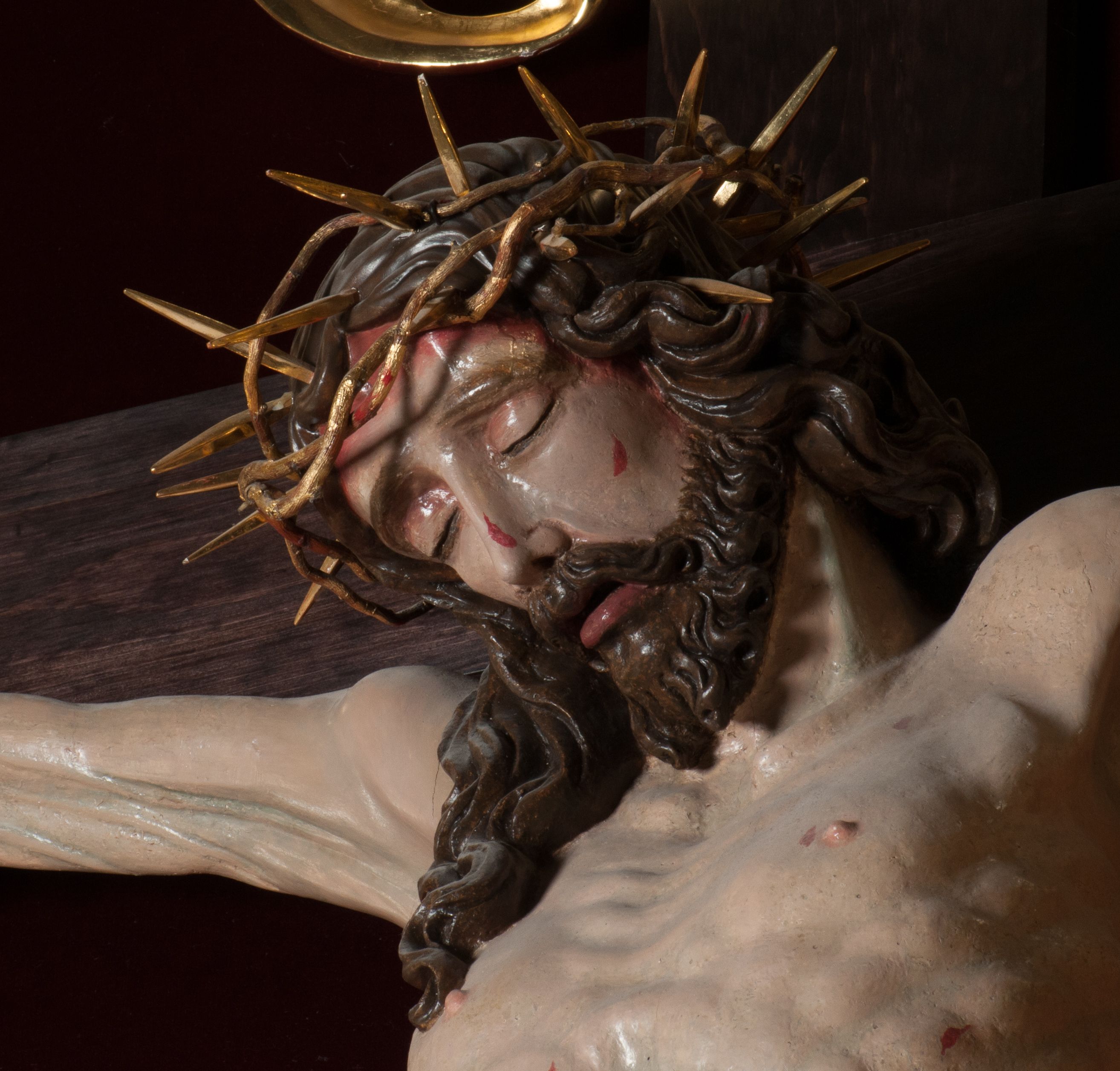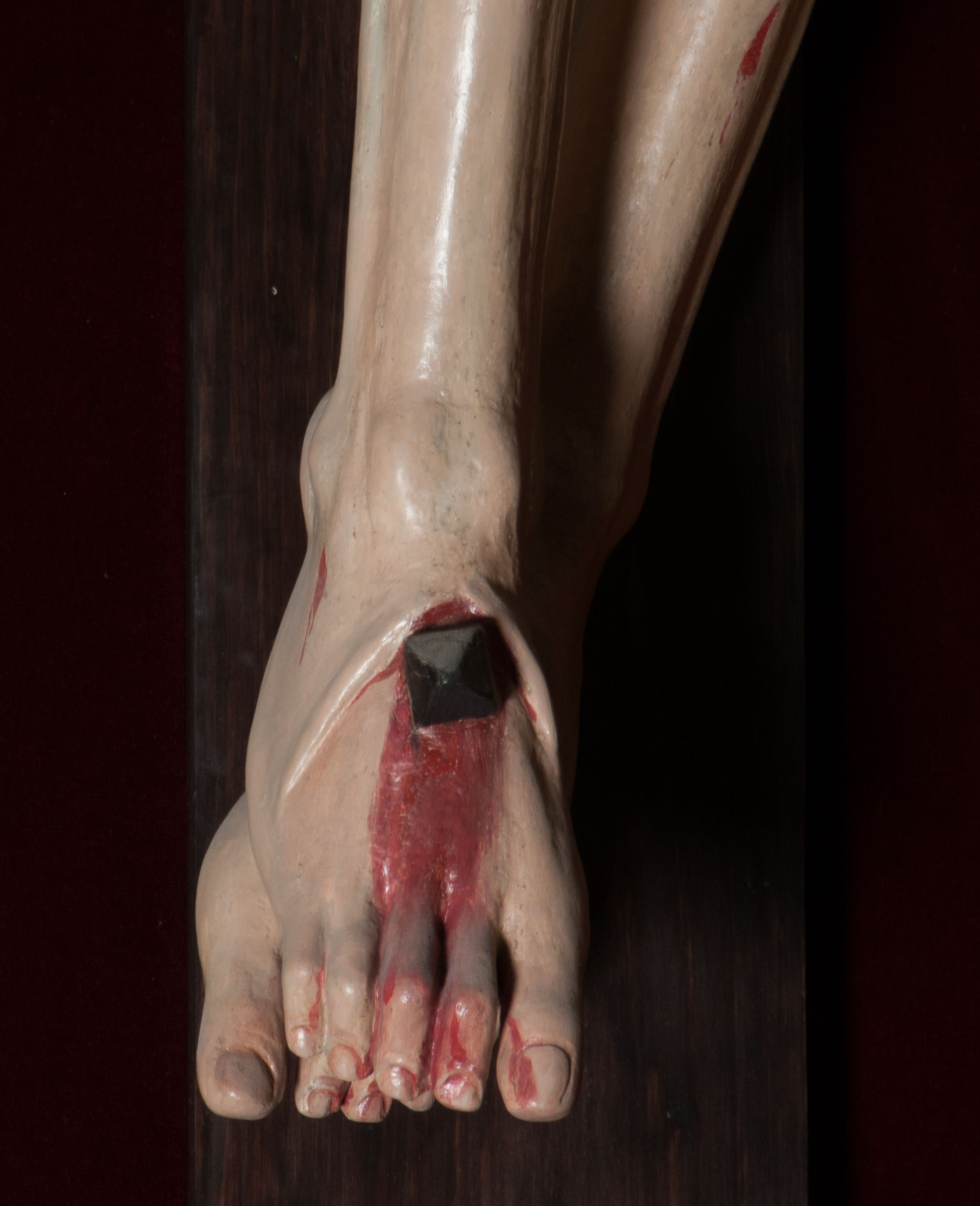 Chrystus, w typie Christo morto, rozpięty na drewnianym, prostym krzyżu łacińskim z titulusem z napisem INRI ujętym małżowiną. Chrystus przybity trzema gwoździami, w lekkim zwisie ciała i nogami ugiętymi w kolanach, ze stopami założonymi prawa na lewą. Na biodrach złocone, pofałdowane perizonium przytrzymywany sznurem; prawe biodro odsłonięte. Ciało smukłe, szczupłe, z wyraźnie zaznaczoną muskulaturą, ścięgnami i żebrami. Karnacja jasna ze strużkami krwi wypływającymi z ran. Głowa w koronie cierniowej, opuszczona i przechylona na prawy bark. Oczy zamknięte. Włosy brązowe, długie, kręcone, broda o rozdwojonych końcach. Na głowie korona cierniowa.