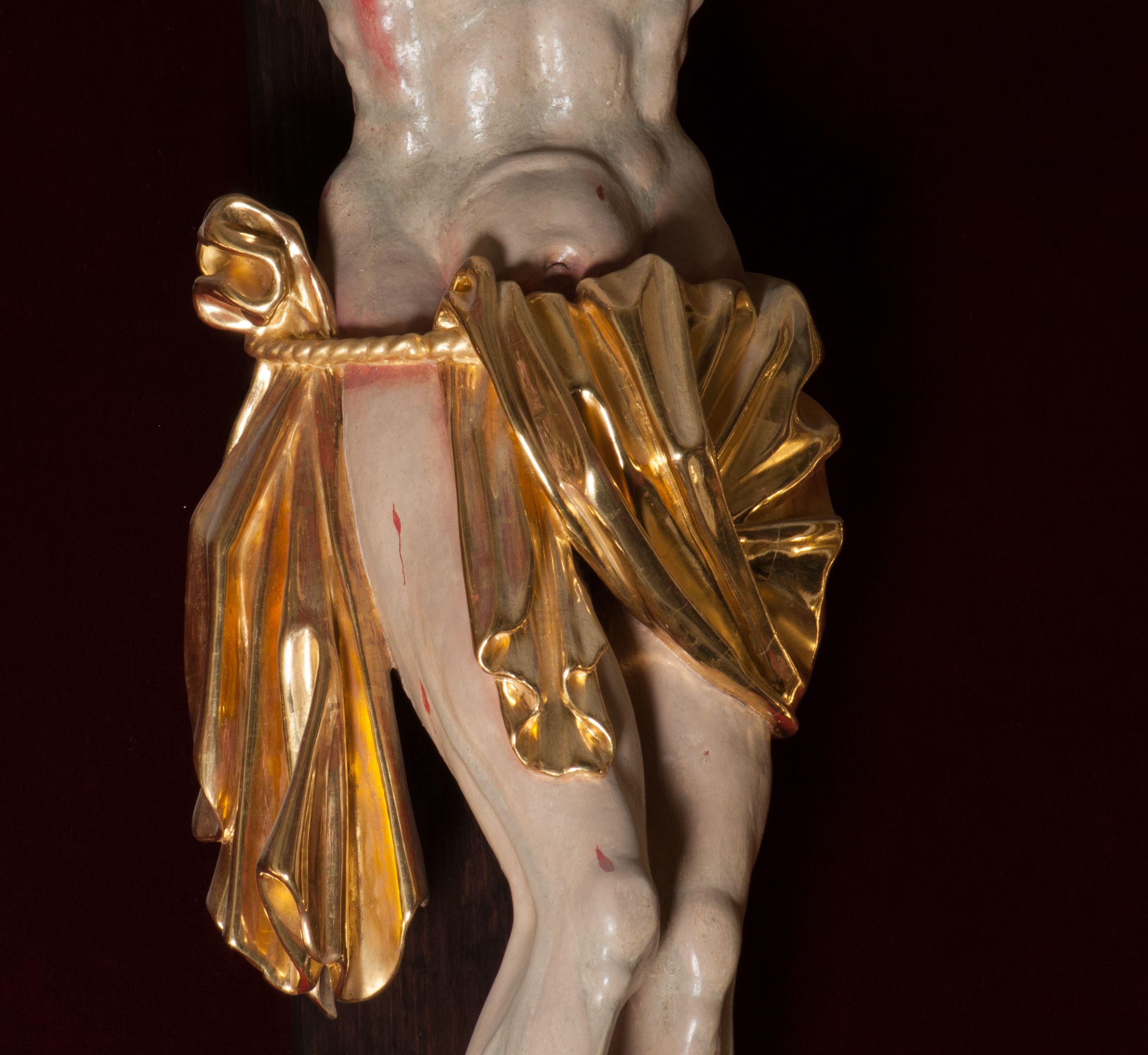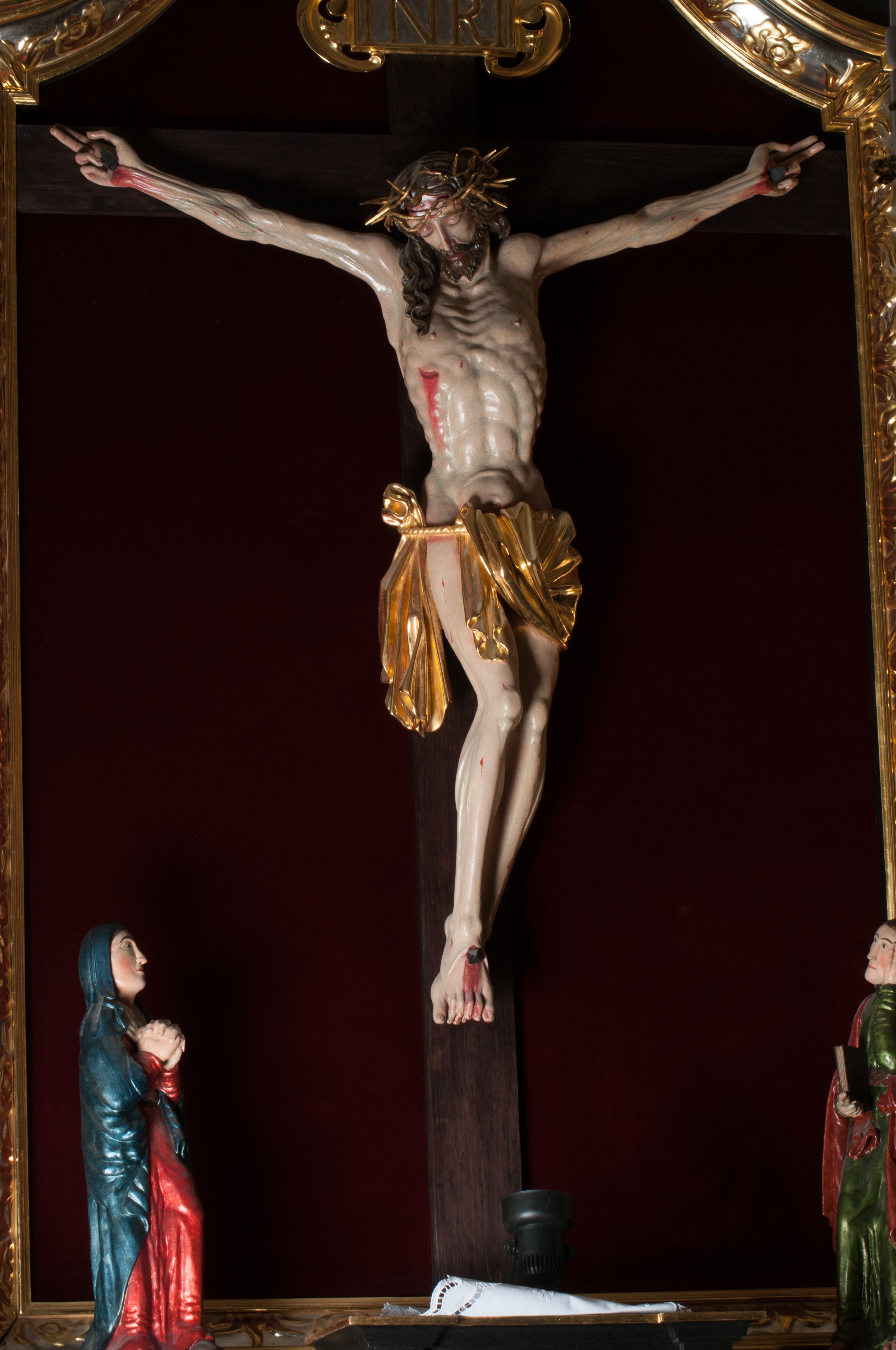 Chrystus ukrzyżowany na prostym łacińskim krzyżu, ukazany po śmierci, w lekkim zwisie ciała i nogami ugiętym w kolanach. Biodra osłania złocone perizonium podwiązane sznurem. Ponad głową Chrystusa titulus z literami IHS.