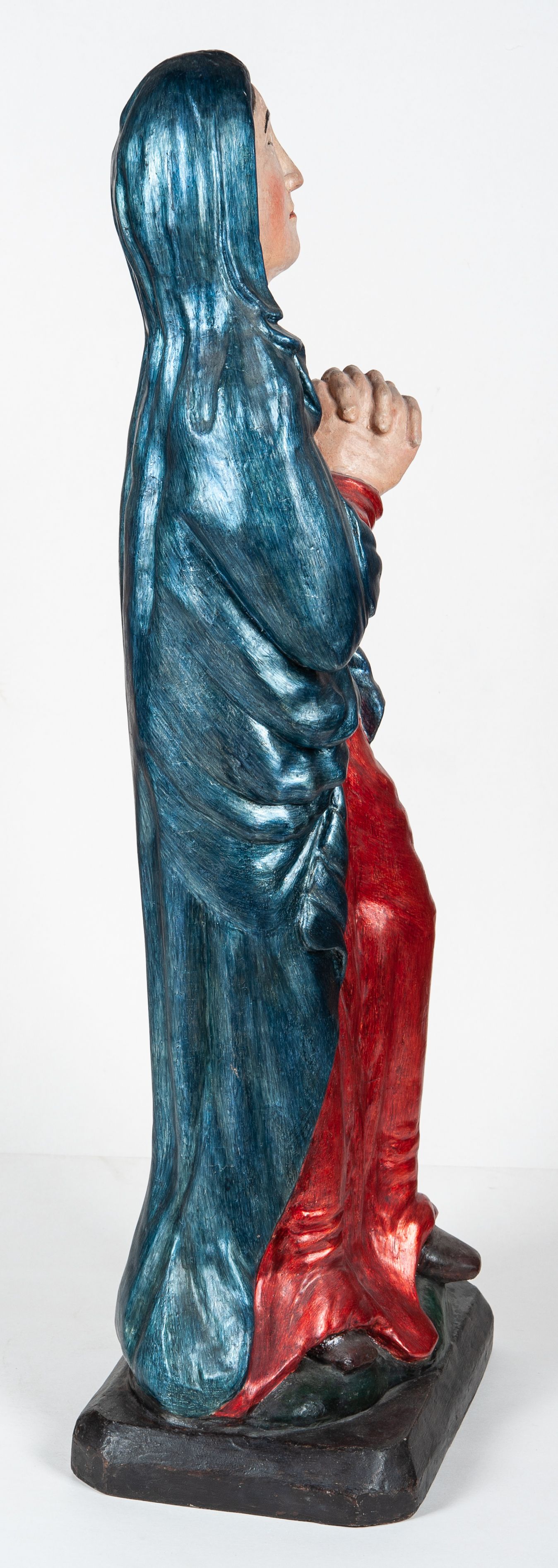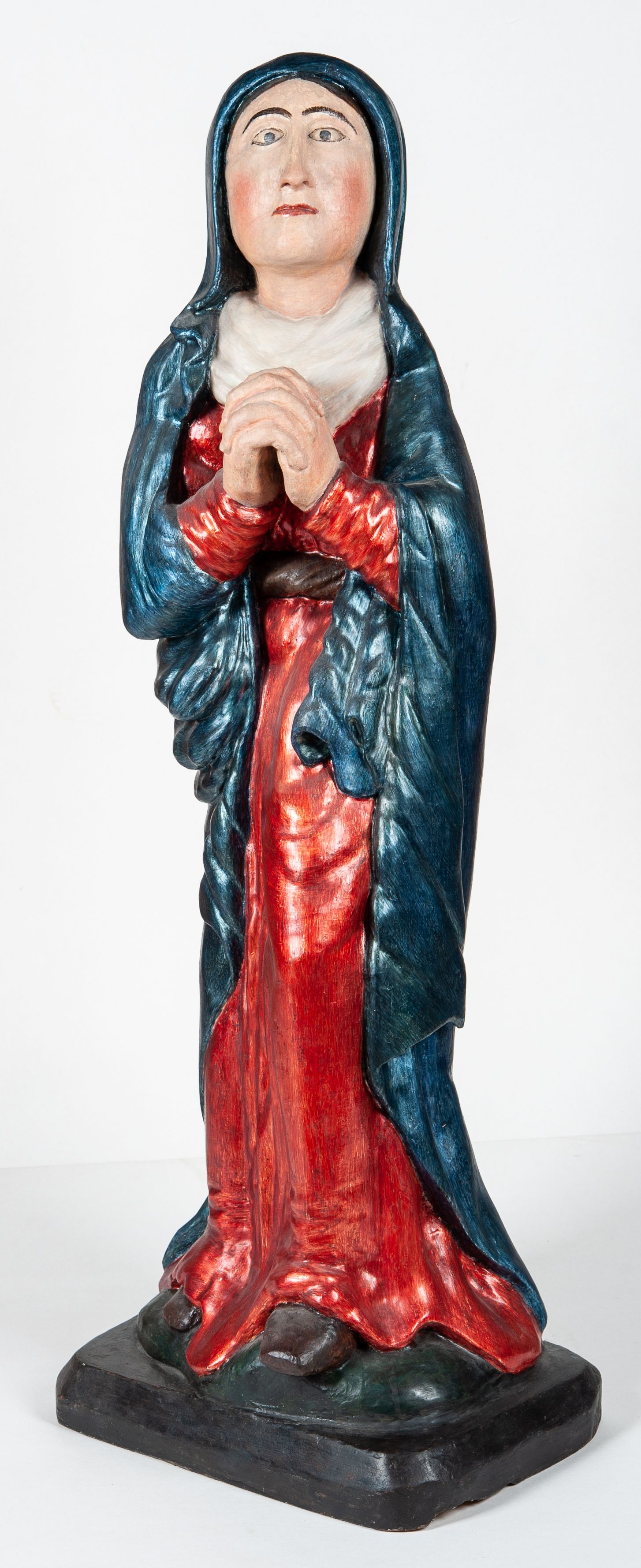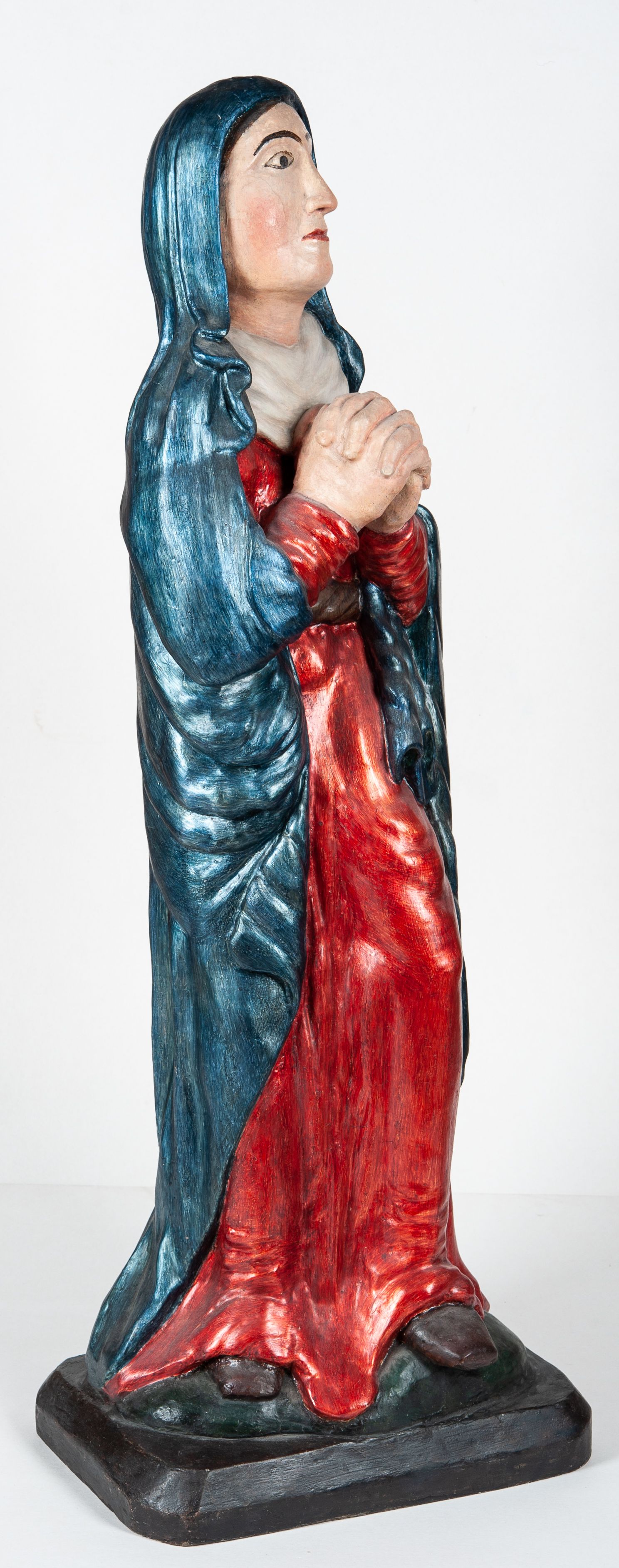 Całopostaciowe przedstawienie Matki Boskiej Bolesnej, stojącej w lekkim kontrapoście, z dłońmi splecionymi na wysokości piersi i wzrokiem skierowanym ku górze.