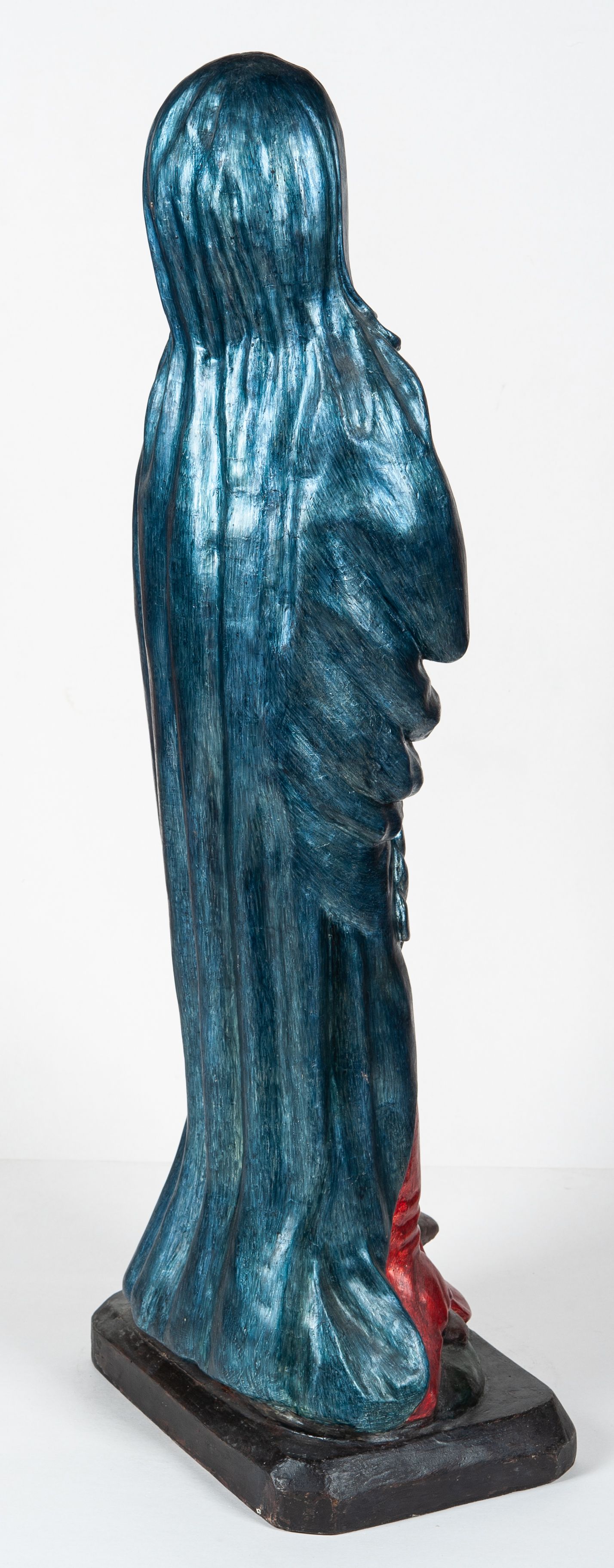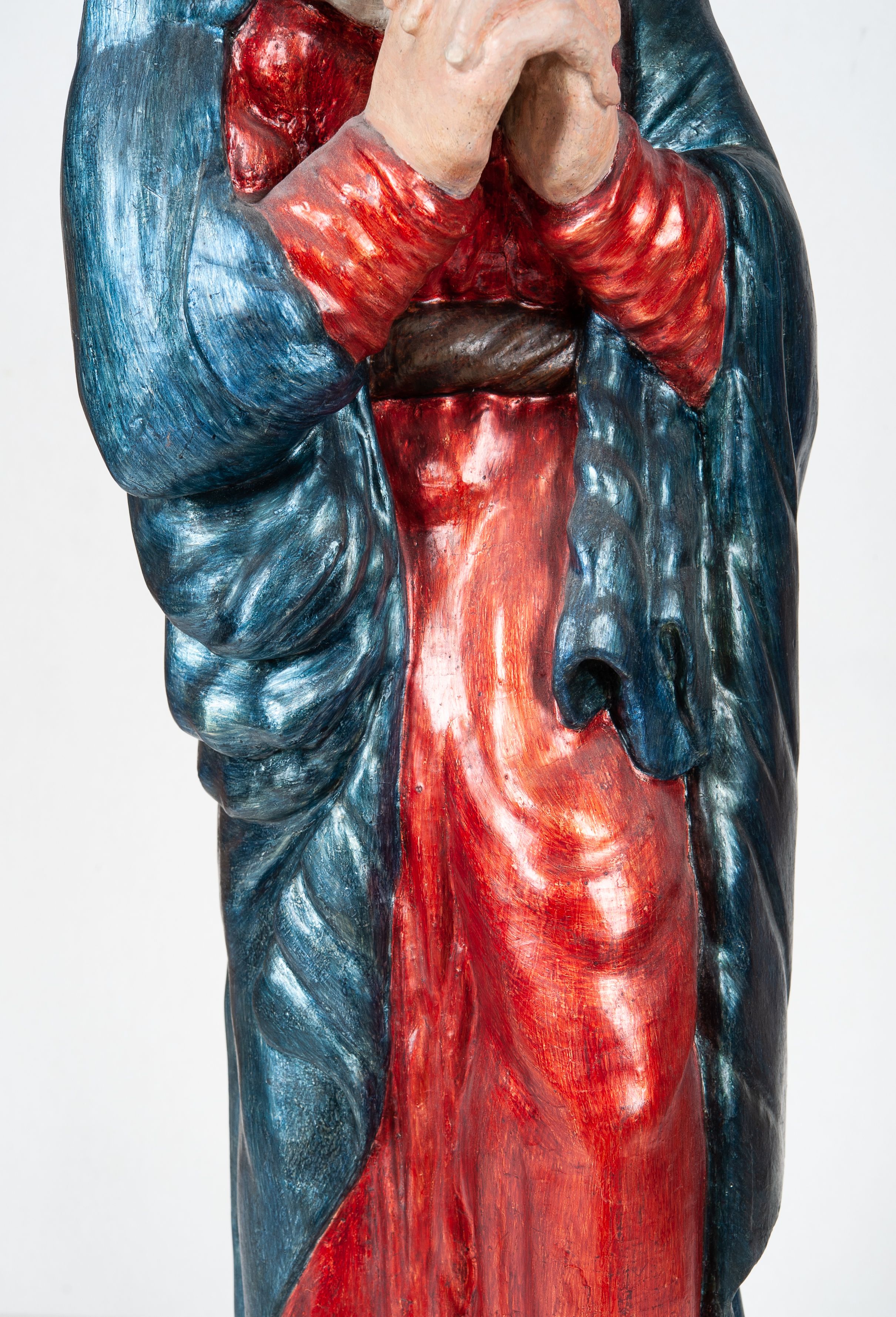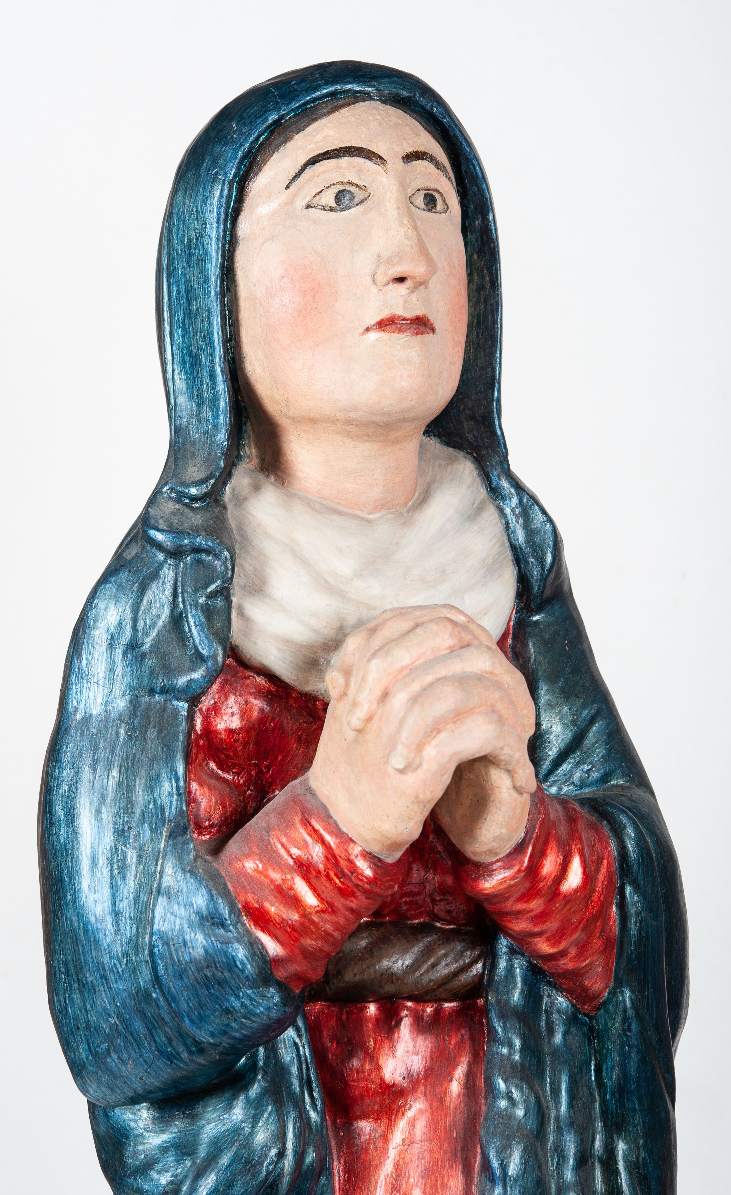 Całopostaciowe przedstawienie Matki Boskiej Bolesnej, stojącej w lekkim kontrapoście, z dłońmi splecionymi na wysokości piersi i wzrokiem skierowanym ku górze.