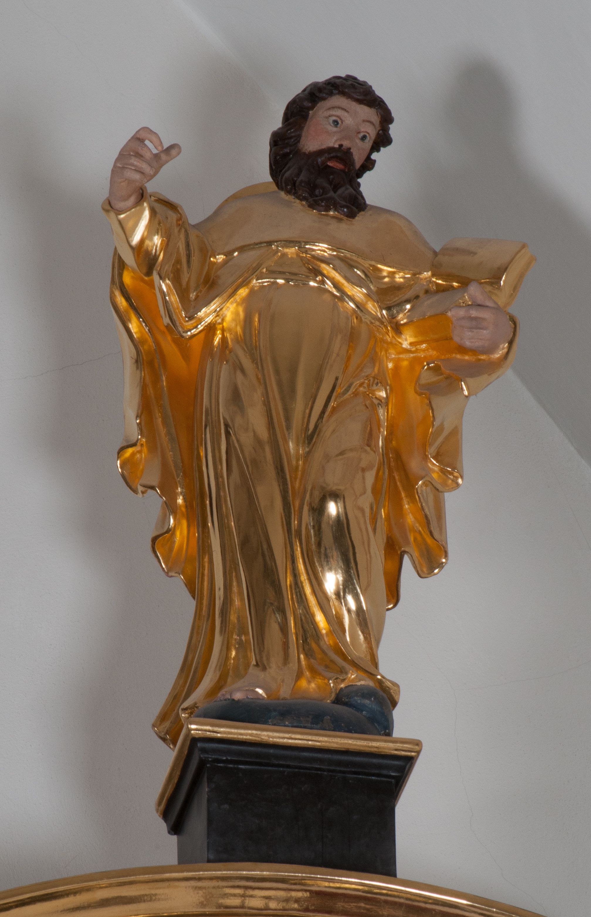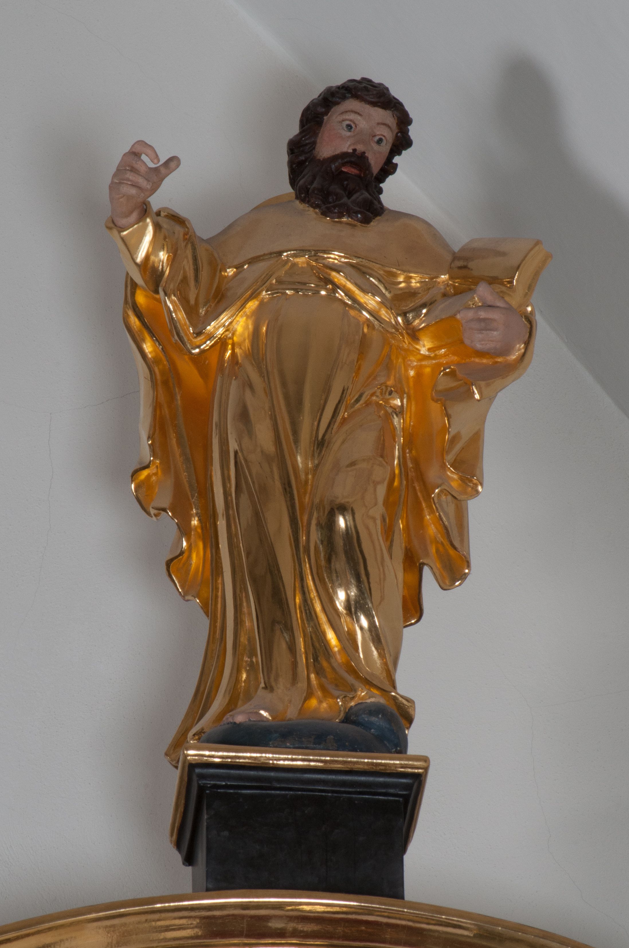 Całopostaciowe przedstawienie świętego apostoła, w rozwianych szatach i w ożywionej pozie - z jedną ręką odwiedzioną od tułowia i z otwartą księgą w drugiej.