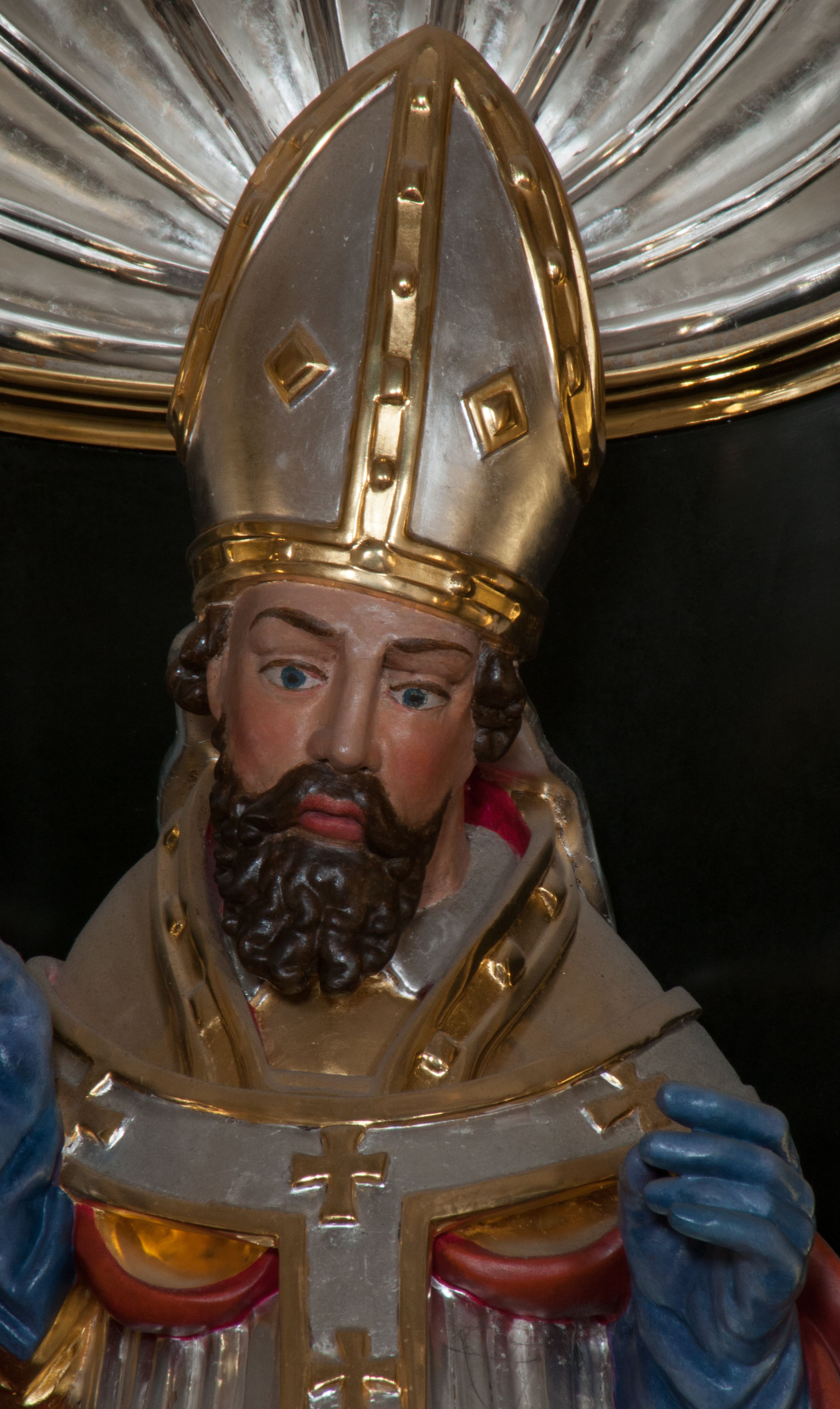 Całopostaciowe reprezentacyjne przedstawienie św. Wojciecha w stroju pontyfikalnym, stojącego w kontrapoście, z wiosłem w ręce.
