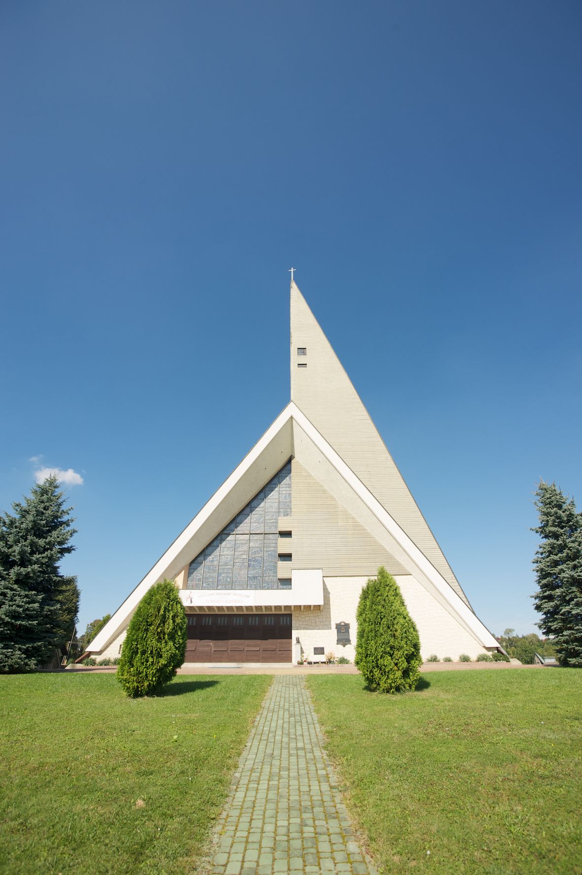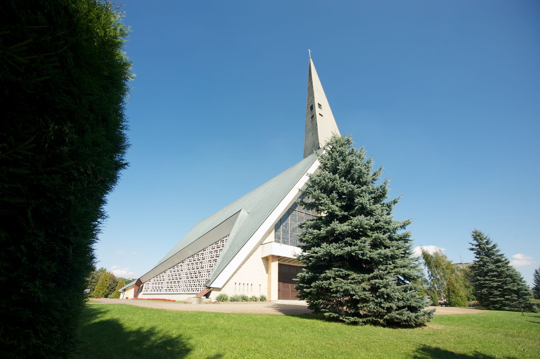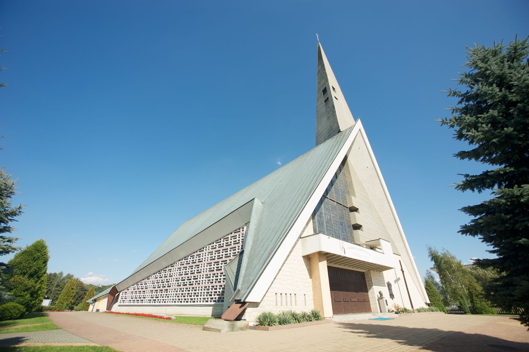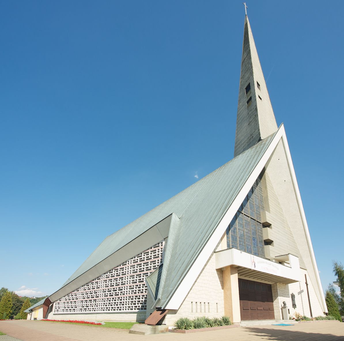 Budynek złożony z dwóch stopionych ze sobą brył, niższej o dwuspadowym dachu nakrywającym wnętrze prezbiterium i nawy oraz ostrosłupa wieży wpisanego w fasadę. Od strony prezbiterium dostawiona nieregularna bryła, niższa od kościoła, nakryta dwuspadowym dachem, mieszcząca zakrystię i kaplice Matki Boskiej. Połać dwustadowego dachu o nieregularnym, zygzakowatym konturze krawędzi, odsłaniającej przeszklone ściany, a miejscami sięgająca ziemi. Trójkątna w przekroju fasada z wieżą wpisaną w jej prawą połowę; lewa zaś w górnej połowie wypełniona witrażem, zamkniętym u dołu balkonem, nakrywającym przedsionek z wejściem do świątyni. Zewnętrzne elewacje kościoła pokryte są okładziną z wapienia pińczowskiego