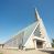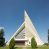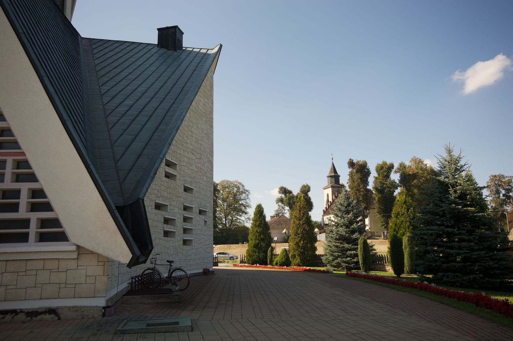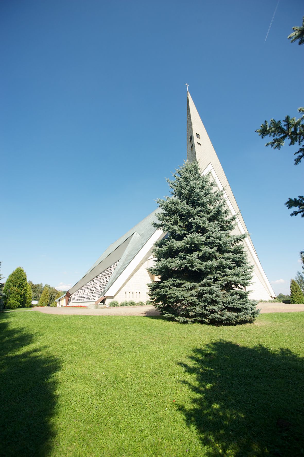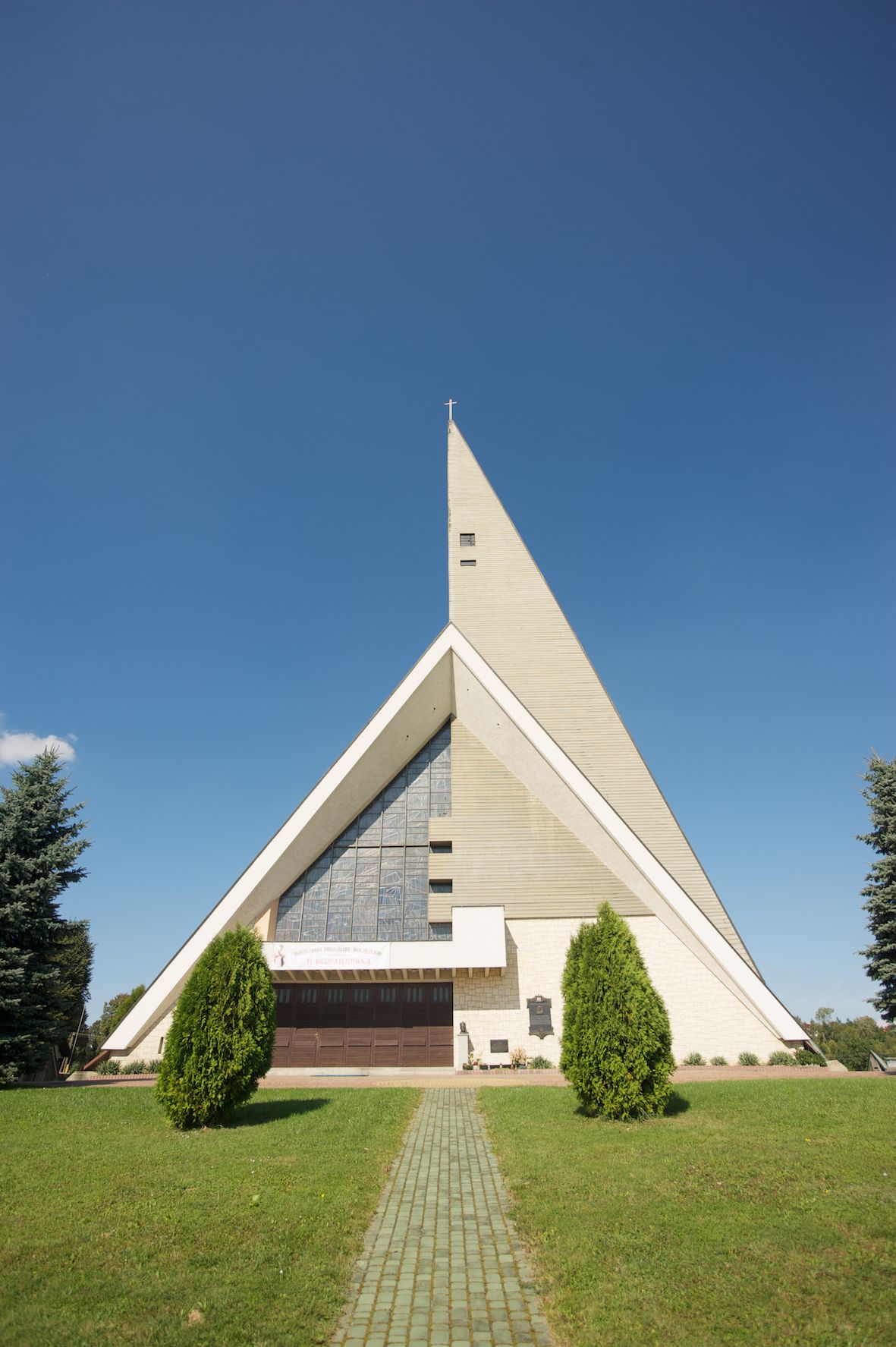 Budynek złożony z dwóch stopionych ze sobą brył, niższej o dwuspadowym dachu nakrywającym wnętrze prezbiterium i nawy oraz ostrosłupa wieży wpisanego w fasadę. Od strony prezbiterium dostawiona nieregularna bryła, niższa od kościoła, nakryta dwuspadowym dachem, mieszcząca zakrystię i kaplice Matki Boskiej. Połać dwustadowego dachu o nieregularnym, zygzakowatym konturze krawędzi, odsłaniającej przeszklone ściany, a miejscami sięgająca ziemi. Trójkątna w przekroju fasada z wieżą wpisaną w jej prawą połowę; lewa zaś w górnej połowie wypełniona witrażem, zamkniętym u dołu balkonem, nakrywającym przedsionek z wejściem do świątyni. Zewnętrzne elewacje kościoła pokryte są okładziną z wapienia pińczowskiego