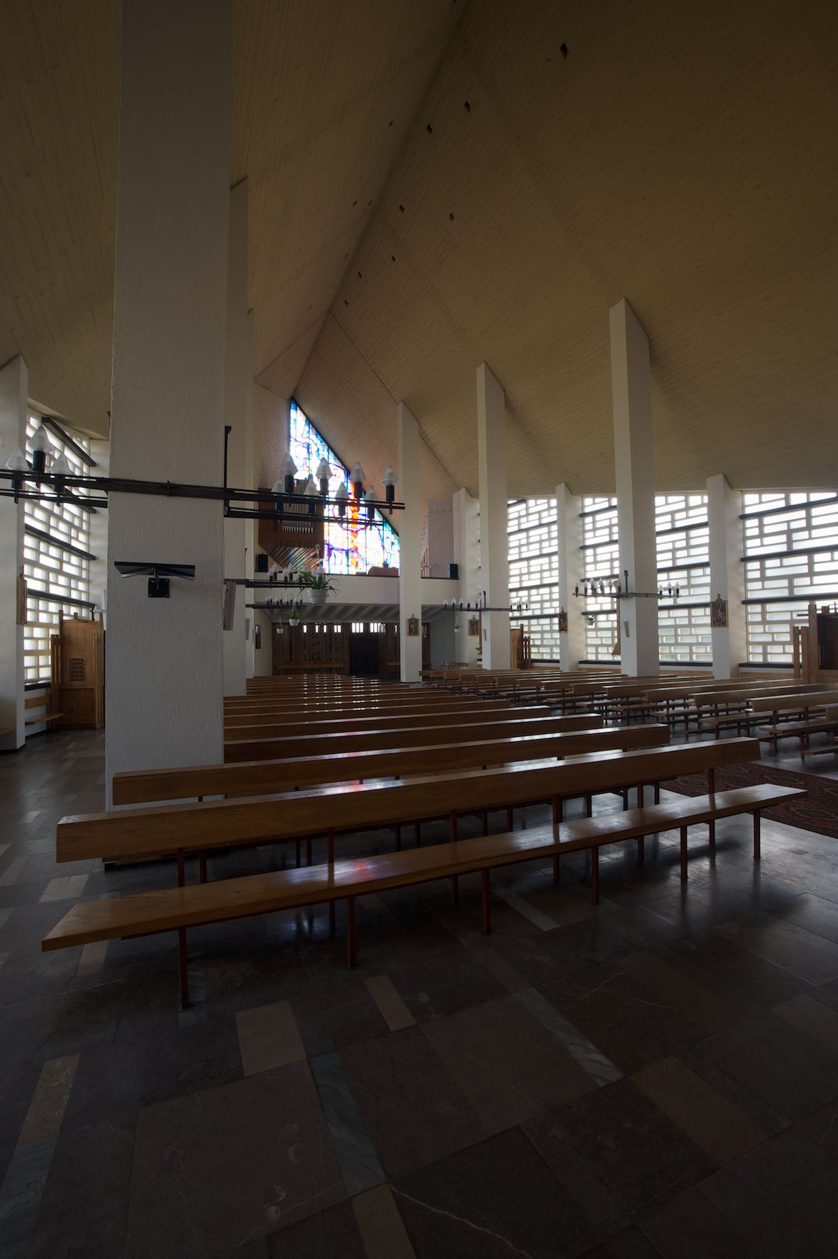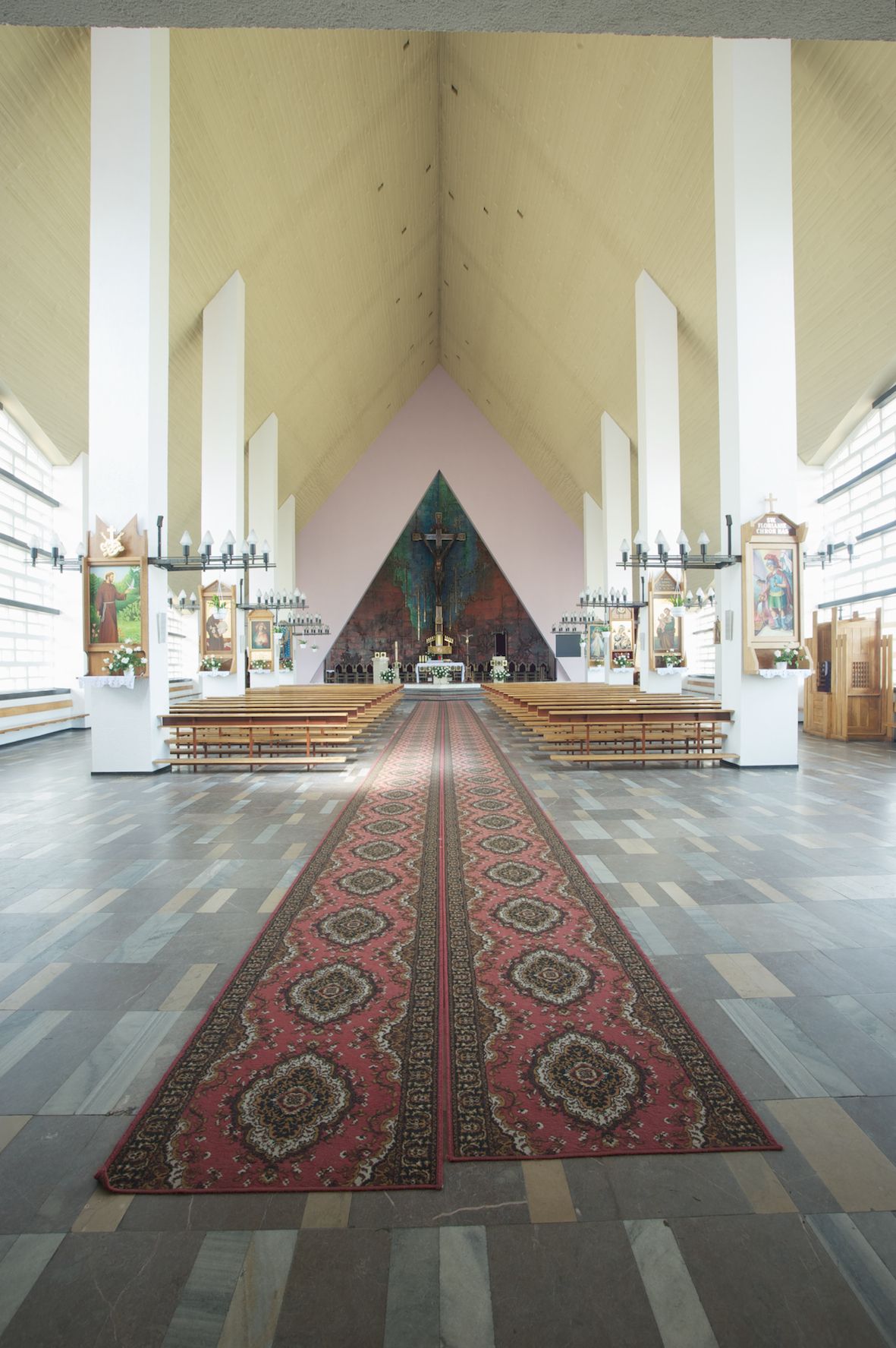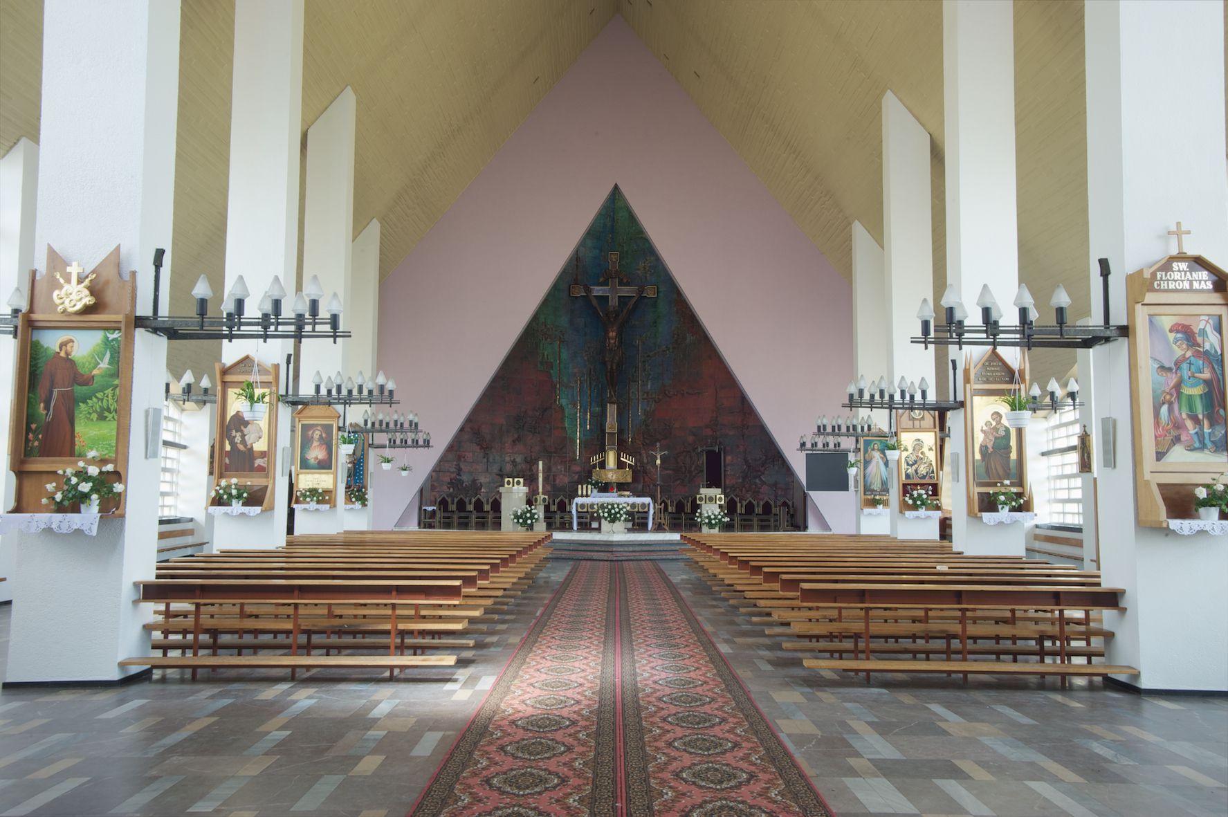 Trójkątne w przekroju wnętrze podzielone na trzy nawy filarami. Prezbiterium zamknięte ścianą z wydzielonym trójkątem ołtarza głównego, złożonego z dwóch ścian pokrytych okładziną ceramiczną ustawionych pod kątem rozwartym, z otworem u szczytu na okno. Po przeciwnej stronie wnętrza wejście na wieżę i parapet chóru muzycznego. Na zakończeniu lewej nawy wejście do kaplicy Matki Boskiej, na zakończeniu prawej nawy zaaranżowana kaplica bł. Anieli Salawy. Ściany boczne całkowicie przeszklone; połowę przestrzeni fasady wypełnia witraż o polu w formie trójkąta o kącie prostym. W kaplicy Matki Boskiej otwory w formie szczelin oświetlające wnętrze umieszczone nieregularnie w polu ściany.