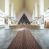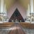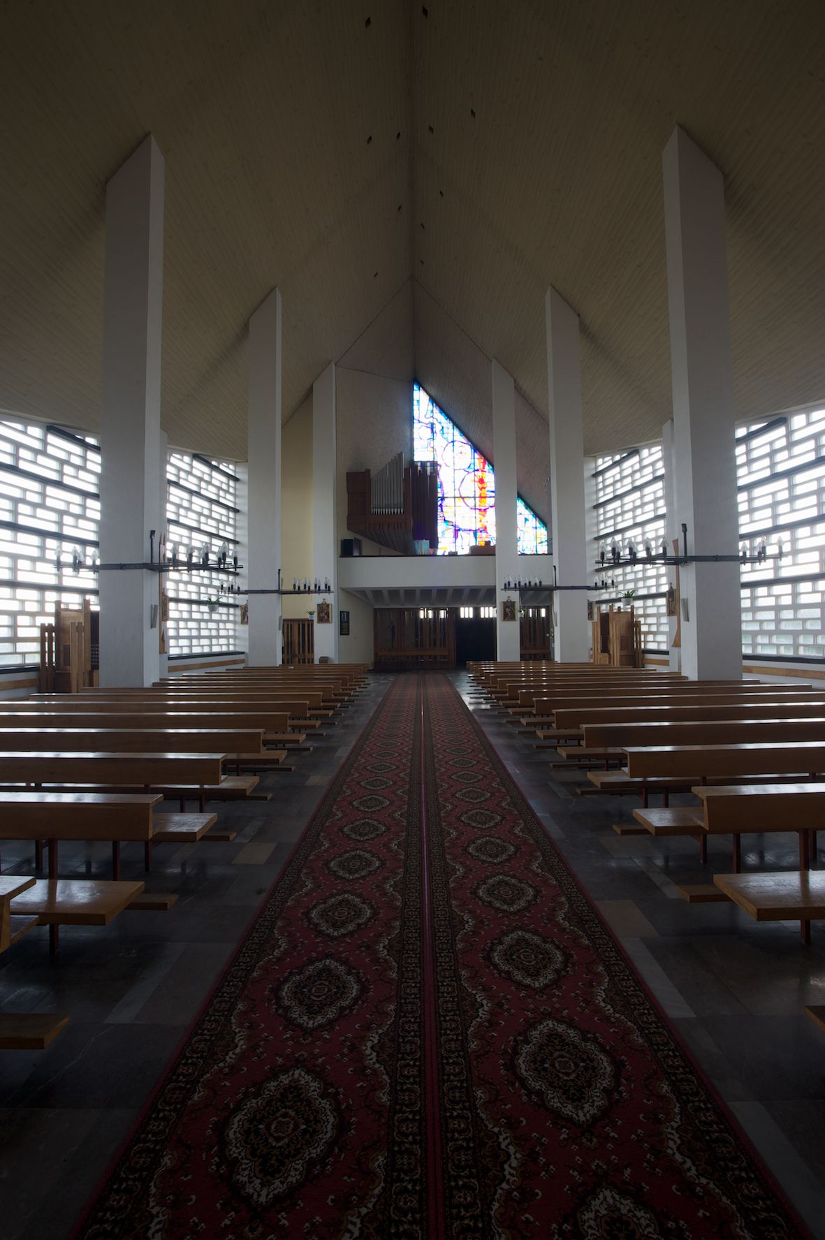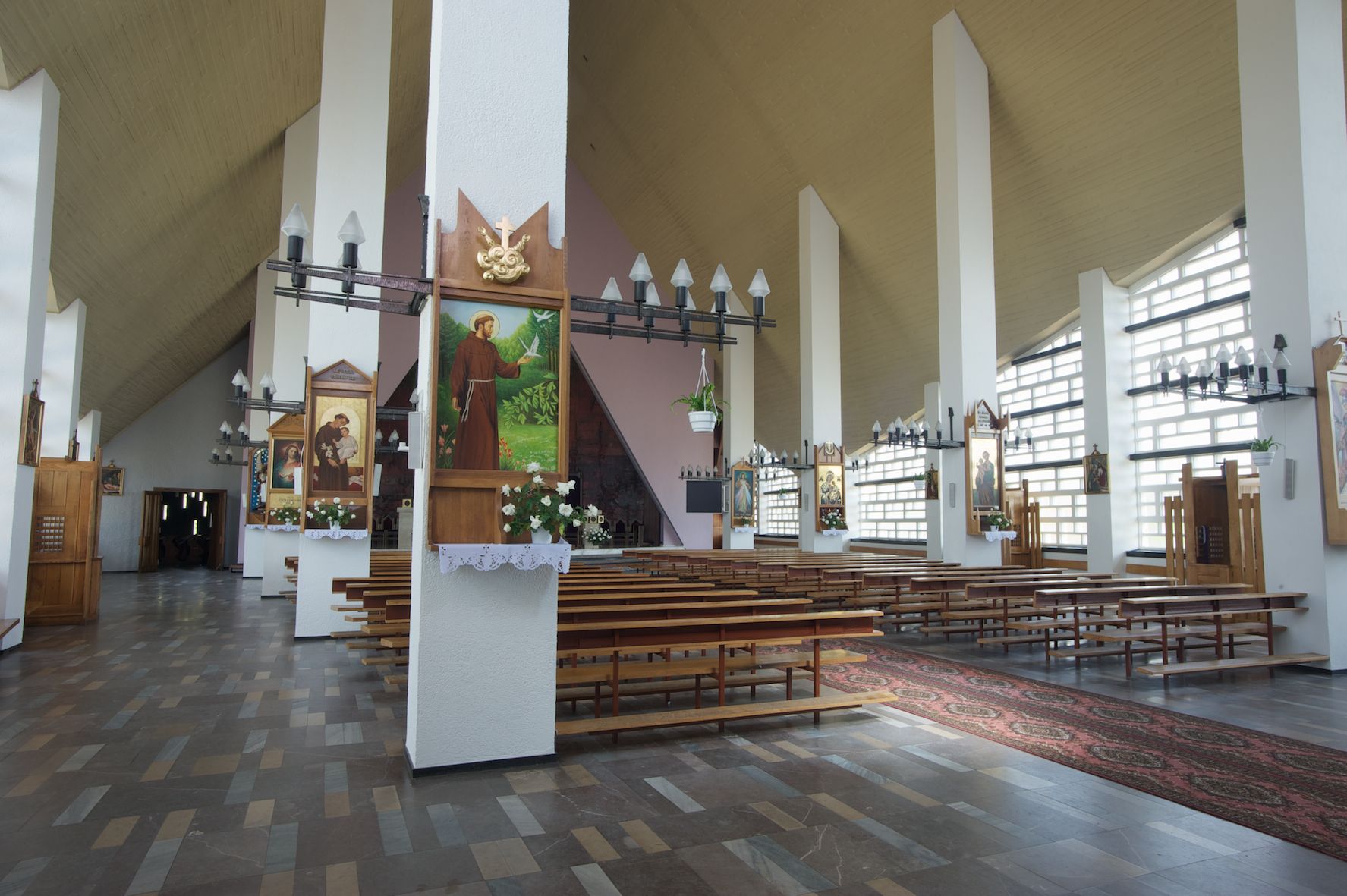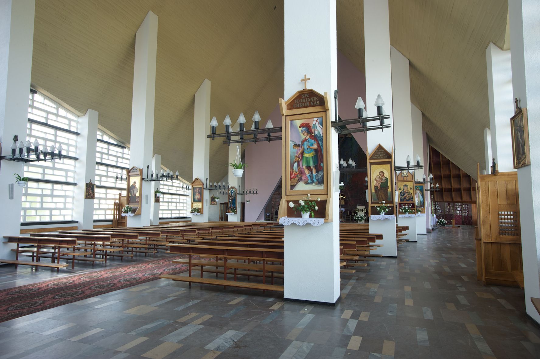 Trójkątne w przekroju wnętrze podzielone na trzy nawy filarami. Prezbiterium zamknięte ścianą z wydzielonym trójkątem ołtarza głównego, złożonego z dwóch ścian pokrytych okładziną ceramiczną ustawionych pod kątem rozwartym, z otworem u szczytu na okno. Po przeciwnej stronie wnętrza wejście na wieżę i parapet chóru muzycznego. Na zakończeniu lewej nawy wejście do kaplicy Matki Boskiej, na zakończeniu prawej nawy zaaranżowana kaplica bł. Anieli Salawy. Ściany boczne całkowicie przeszklone; połowę przestrzeni fasady wypełnia witraż o polu w formie trójkąta o kącie prostym. W kaplicy Matki Boskiej otwory w formie szczelin oświetlające wnętrze umieszczone nieregularnie w polu ściany.