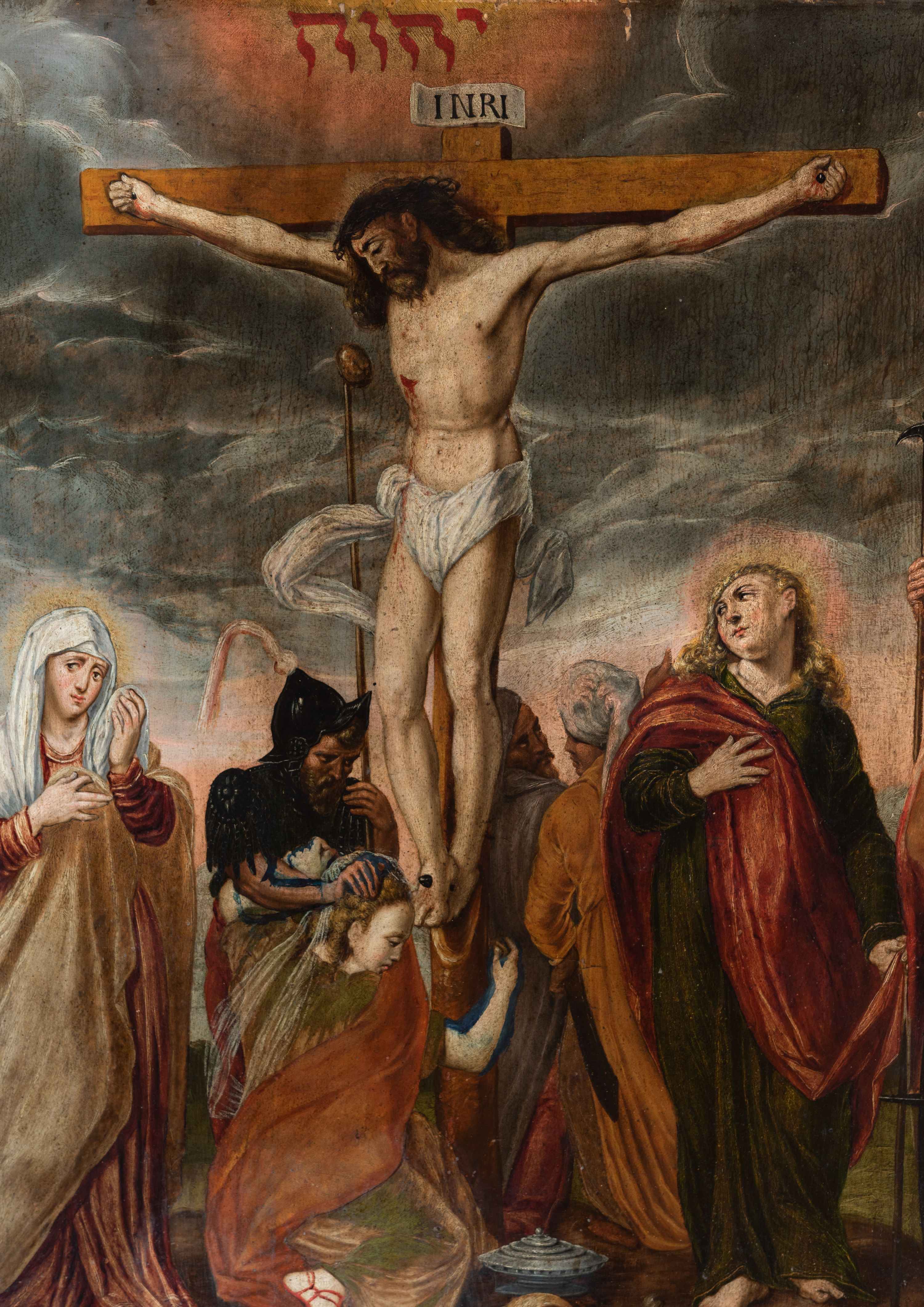 Obraz w formie stojącego prostokąta. W centrum ukazany krzyż z postacią umarłego Chrystusa, pod nim grupa postaci. Jezus przybity do krzyża trzema gwoździami, zwrócony w trzech czwartych w prawo, z głową opadającą na prawy bark, ciało w lekkim zwisie, o horyzontalnie rozłożonych ramionach oraz stopach skrzyżowanych w układzie prawa na lewą. Twarz ma szczupłą, o zamkniętych oczach i garbatym nosie, okoloną gęstymi i brązowymi brodą i włosami. Na głowie korona cierniowa. Ciało ma szczupłe i smukłe, z zaznaczonymi śladami męki. Perizonium krótkie i białe, ściśle przylegające do ciała, z rozwianymi po bokach fragmentami tkaniny. Pionowa belka krzyża zakończona tabliczką z napisem „INRI”, u jego dołu leży puszka, czaszka i piszczel. Pod krzyżem klęczy św. Maria Magdalena zwrócona profilem w lewo, prawą ręką obejmuję belkę krzyża, lewą kładzie na piersi stojącego za nią Longina. Twarz ma młodzieńczą, okoloną jasnymi, kręconymi włosami. Ubrana jest w zielono-brązową suknię i czerwony płaszcz, na głowie ma prześwitujący welon, a na stopach czerwone sandały. Longin w pozycji stojącej, zwrócony w trzech czwartych w lewo, z pochyloną głową. Prawą rękę kładzie na głowie Marii Magdaleny, lewą przytrzymuje na ramieniu włócznie z gąbką. Ukazany jest jako dojrzały mężczyzna, okolony gęstą brodą. Ubrany jest w czarną zbroję, a na głowie ma czarny morion (hełm) z kitą. Po prawej stronie krzyża stoi Maria zwrócona w trzech czwartych w lewo, z pochyloną głową, lewą ręką ociera łzy, prawą podtrzymuje na piersi płaszcz. Twarz ma pociągłą, o dużych, opadających oczach, prostym nosie i pełnych ustach. Ubrana jest w czerwoną suknię, jasnobrązowy płaszcz i biały welon na głowie. Po lewej stronie krzyża stoi św. Jan Ewangelista ukazany frontalnie, z głową skierowaną w prawo. Lewą rękę ma opuszczoną wzdłuż boku, w dłoni trzyma płaszcz, prawą kładzie na piersi. Twarz ma owalną, o dużych oczach, krótkim nosie i pełnych ustach, okoloną jasnymi, kręconymi włosami, opadającymi na ramiona. Ubrany jest w ciemnozieloną tunikę oraz przewiązany diagonalnie przez prawe ramię czerwony płaszcz. Obok św. Jana stoi mężczyzna, zwrócony tyłem, trzymający w prawej ręce halabardę. Na drugim planie, za Marią stoi kobieta unosząca splecione dłonie, ubrana w zieloną suknię, z białym welonem na głowie. Za św. Janem ukazane od tyłu dwie postacie rozmawiających mężczyzn ubranych w tuniki i turbany. Scena ukazana na tle zachmurzonego szarego nieba, rozświetlonego w górnej części obrazu z tetragramem (יהוה). Dzieło ujęte złoconą, profilowaną ramą dekorowaną kimationem i perełkowaniem.