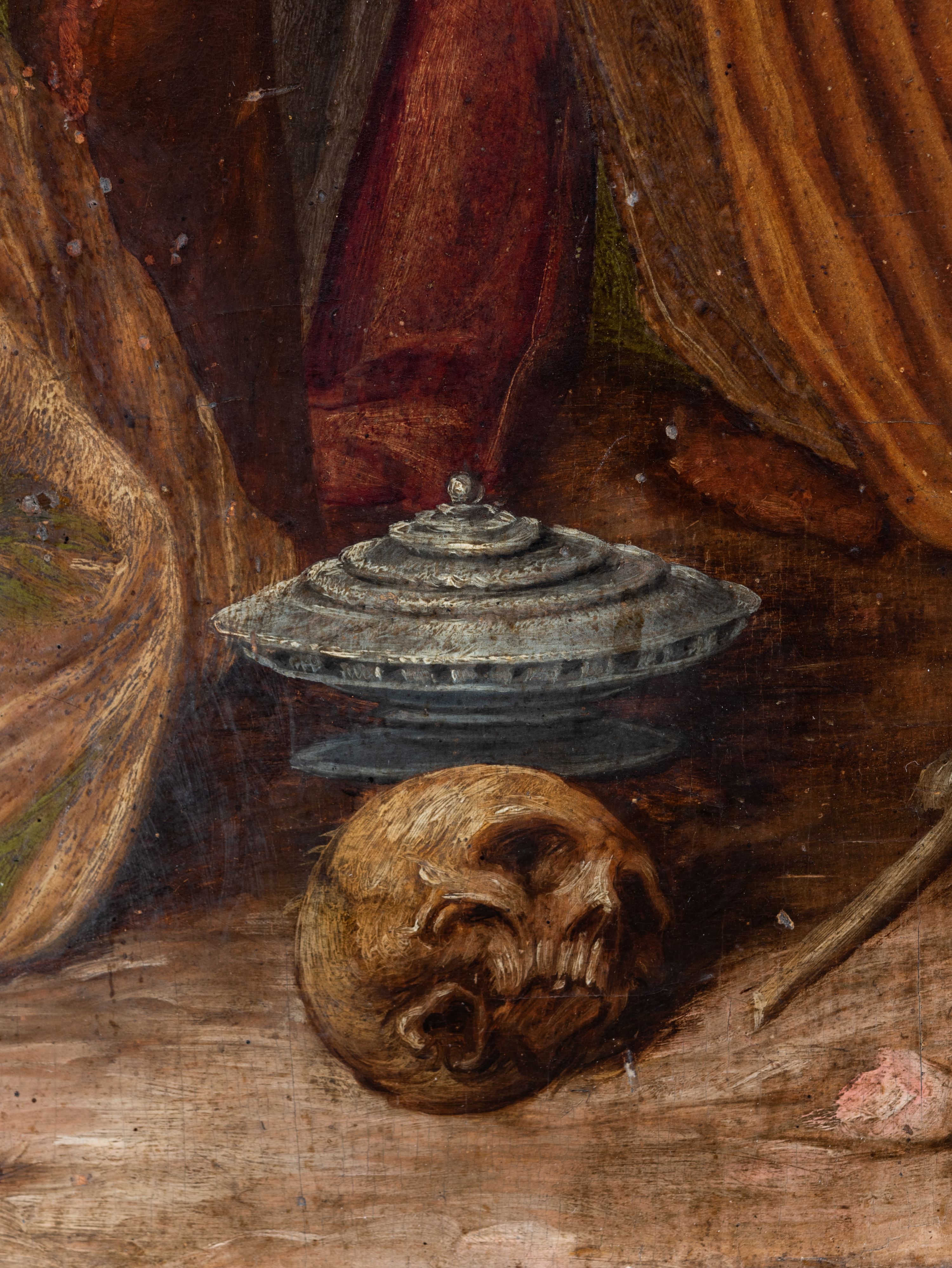 Obraz zabrudzony, przemalowany, ubytki w strukturze, zaplamienia.