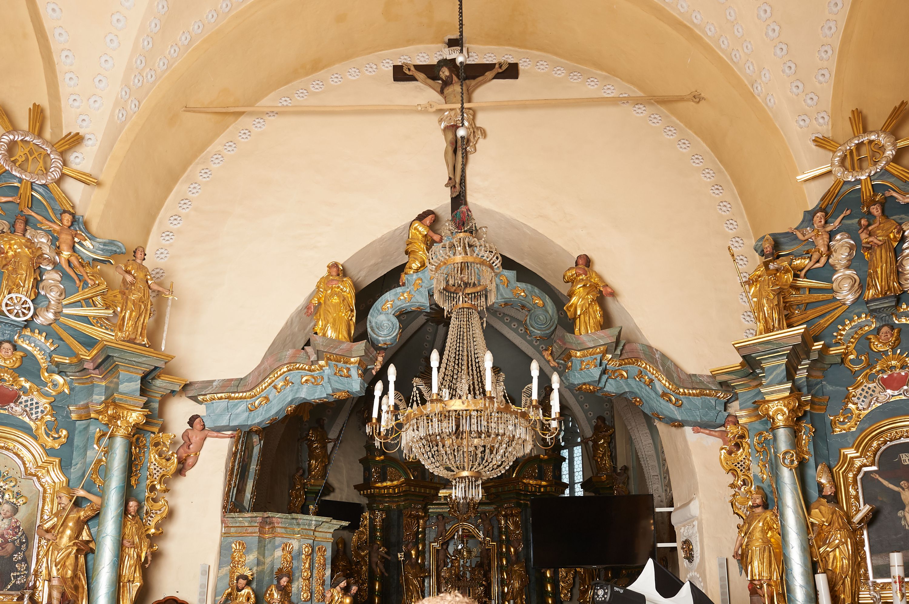 Belka tęczowa złożona z trzech elementów – dwóch bocznych w formie falistych i wyłamanych fragmentów belkowania, na których opiera się trzeci element w kształcie łuku kotarowego z uskokiem na ćwierćkolistych konsolach. Belka dekorowana rocaille'm i rozetami, podtrzymywana przez dwie pary puttów. Na zwieńczeniu łuku krzyż z figurą Chrystusa przymocowany do ściany tęczowej. Jezus ukazany jako umarły, przybity do krzyża trzema gwoździami. Jego ciało jest w lekkim zwisie, o szeroko rozłożonych ramionach, z głową opadająca bezwładnie na prawy bark, stopy skrzyżowane w układzie prawa na lewą. Chrystus ma podłużną twarz, o zamkniętych oczach, dużym nosie i szeroko otwartych ustach z widocznymi zębami; okoloną kręconymi i brązowymi włosami i brodą. Na głowie ma szeroką, ciemnozieloną koronę cierniową. Jego ciało jest silnie umięśnione, z podkreślonymi żebrami i mostkiem oraz zaznaczonymi śladami męki. Przez biodra ma przewiązane krótkie, srebrzone perizonium, silnie drapowane, ze zwisem tkaniny na lewym boku. Krzyż ciemnobrązowy, o prostym zakończeniu ramion, pionowa bela zwieńczona białą banderolą z napisem „INRI”. Pod krzyżem klęczy św. Maria Magdalena, zwrócona profilem w lewo, z pochyloną głową oraz wyciągniętymi do przodu rękami. Twarz ma owalna, o pełnych policzkach, małych oczach i nosie oraz otwartych ustach, okoloną długimi, falistymi włosami, opadającymi na plecy. Ubrana jest w złoconą suknię o szerokich, podwiniętych rękawach oraz złocony płaszcz zawinięty wokół pasa i nóg. Po prawej stronie krzyża stoi Matka Boska ukazana frontalnie, z uniesioną głową, lewą rękę kładzie na piersi, prawą wyciąga w bok. Twarz ma owalną, o oczach uniesionych w górę, małym nosie i ustach. Ubrana jest w złoconą suknię i płaszcz, na głowie ma złocony welon. Po lewej stronie krzyża stoi św. Jan Ewangelista, ukazany frontalnie, z uniesioną głową, prawą rękę kładzie na piersi, lewą wyciąga w bok. Twarz ma owalną, o oczach uniesionych w górę, małym nosie i ustach, okoloną krótkimi, brązowymi włosami. Ubrany jest w złoconą tunikę i płaszcz, zawinięty wokół bioder. Polichromia ciał postaci naturalistyczna.