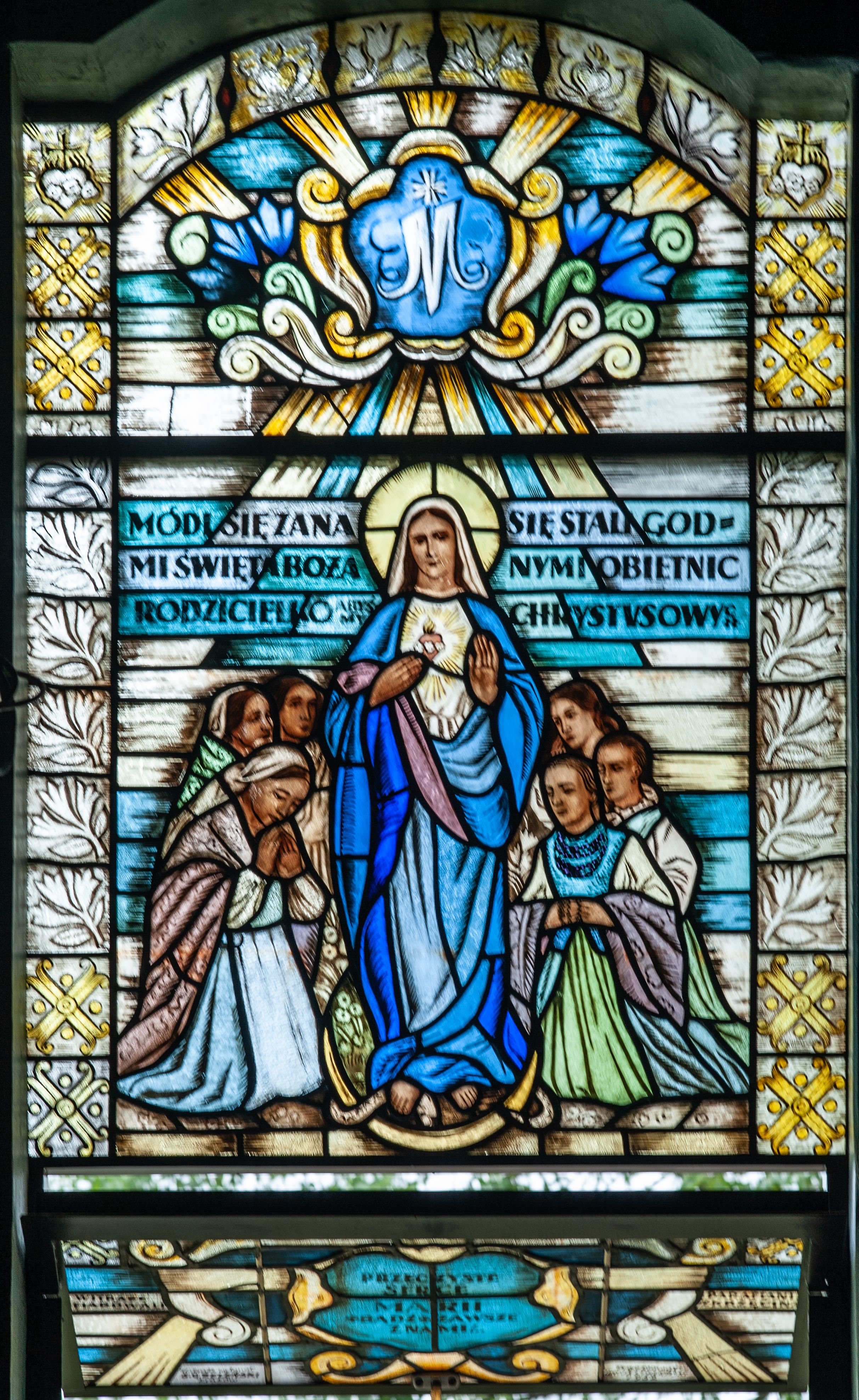 Witraż o wykroju prostokąta stojącego zakończonego łukiem odcinkowym nadwieszonym z przedstawieniem Serca Marii. W centrum Maria stojąca na półksiężycu, depcząca węża. Lewą rękę wyciąga przed siebie, prawą zaś wskazuje na serce na piersi. Jest ubrana w białą tunikę i płaszcz w odcieniach błękitu. Wokół Marii klęczy sześć kobiet ubranych w stroje chłopskie, długie suknie, serdaki, korale, chusty na plecach i głowach. Scena otoczona bordiurą z dekoracją roślinną i geometryczną.Na wysokości głowy Marii inskrypcja: „MÓDL SIĘ ZA NA/MI ŚWIĘTA BOŻA / RODZICIELKO ABYŚMY / SIĘ STALI GOD/NYMI OBIETNIC / CHRYSTUSOWYCH”. Powyżej sceny kartusz wolutowy z literą „M” z krzyżem. Poniżej sceny kartusz z inskrypcją: „PRZECZYSTE / SERCE / MARII / BĄDŹ ZAWSZE / Z NAMI”. U dołu inskrypcja: „WITRAŻE / OFIAROWALI / PARAFIANIA / Z KRZĘCINA” . Poniżej „Witraże wykon(dalej niewidoczne) / S. G. ŻELEŃSKI / Projektował: / Wł(adysław). JASTRZĘBSKI” Witraż utrzymany w chłodnej kolorystyce, z przewagą szarości, niebieskiego i żółtego.