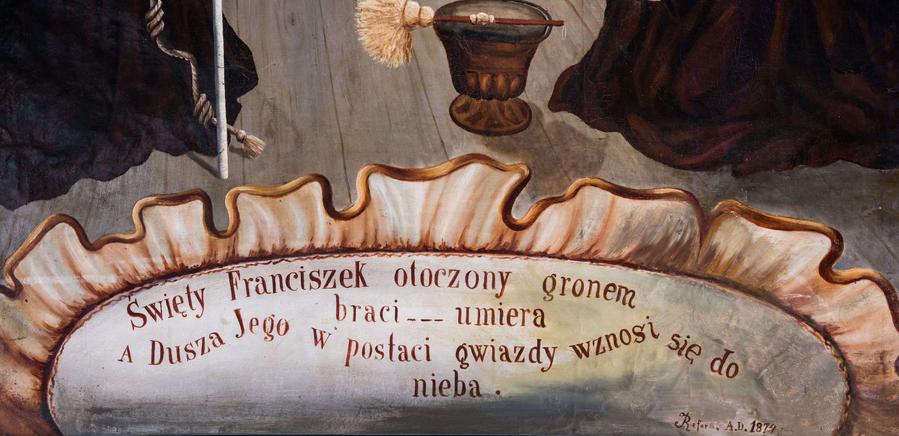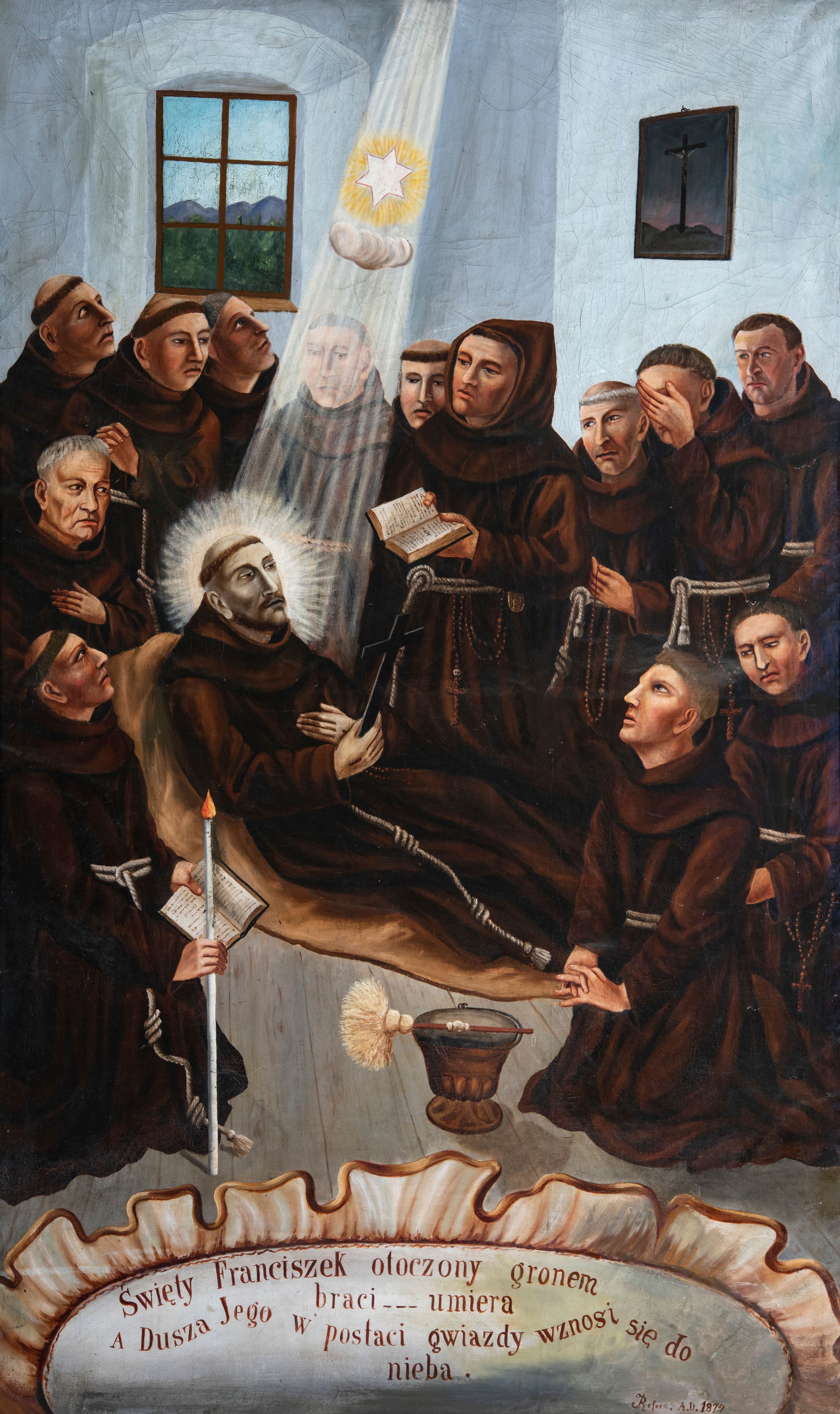 Obraz w kształcie stojącego prostokąta ujętego profilowaną, czarno-brązowa ramą, z przedstawieniem śmierci św. Franciszka z Asyżu. Pośrodku, na rozłożonej na drewnianej podłodze jasnobrązowej tkaninie ukazany jest w półleżącej pozie św. Franciszek zwrócony w lewo. Pociągłą, szczupłą, siną twarz świętego charakteryzują wyraziste rysy i krótki zarost. Głowę z krótką tonsurą okala świetlisty nimb. Święty ubrany jest w brązowy habit franciszkański przewiązany białym sznurem. Lewą rękę wspiera na piersiach, w prawej trzyma czarny krzyż. Na dłoniach widoczne są rany. Otacza go grupa braci w różnym wieku, znajdujący się w głębi stoją, ukazani po bokach klęczą. Jeden z nich ma kaptur na głowie, jeden przesłania dłonią twarz. Część zakonników wspiera ręce na piersiach, składa w geście modlitwy lub trzyma w dłoniach otwarte księgi lub świece. Na pierwszym planie leży kociołek na wodę święconą i kropidło. Scena ukazana jest we wnętrzu o grubych, pobielanych ścianach. Po prawej stronie wisi obraz z Ukrzyżowaniem, po lewej jest niewielkie okno, za którym widać górzysty pejzaż. Pośrodku kompozycji, z góry w kierunku głowy świętego biegnie wiązka promieni z gwiazdą. W dolnej części obrazu znajduje się owalny kartusz z napisem „Święty Franciszek otoczony gronem / braci … umiera / A Dusza Jego w postaci gwiazdy wznosi się do / nieba. / Reform. A(nno) D(omini) 1874”.