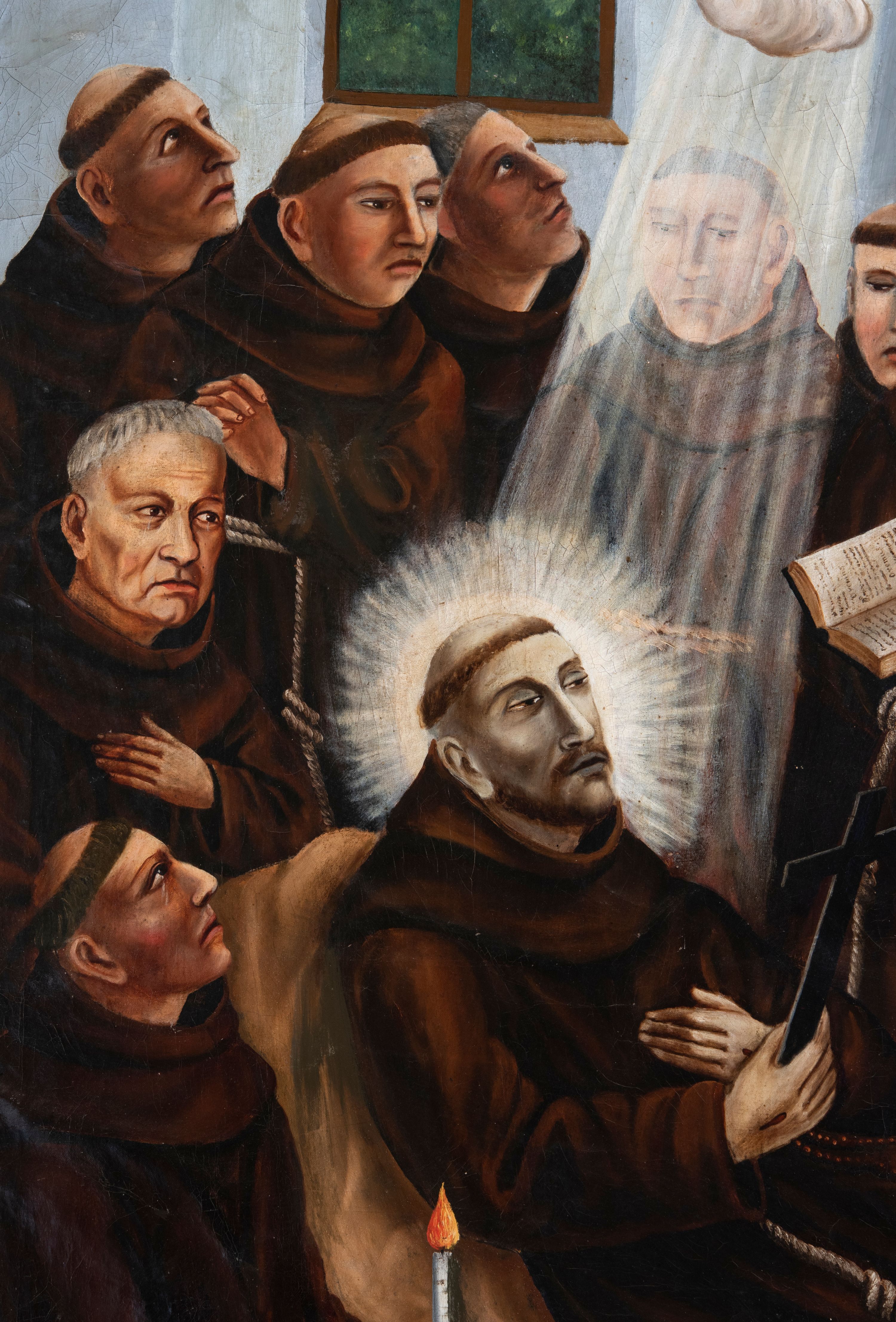 Urodzony w 1181 lub 1182 roku w Asyżu założyciel zakonów franciszkanów i klarysek, św. Franciszek zmarł 3 października 1226 w swej rodzinnej miejscowości. Na kilka lat przed śmiercią zapadł na ciężką chorobę oczu, która z roku na rok stawała się coraz bardziej uciążliwa. Przebywając od dłuższego czasu poza Asyżem, wiosną 1256 roku czując się gorzej, postanowił powrócić do rodzinnego miasta otoczony opieką współbraci. 3 października 1226 przewidując bliską już śmierć, wezwał do siebie zakonników. W ich otoczeniu, wieczorem podczas śpiewów i odmawiania psalmu 141 oraz po przyjęciu Najświętszego Sakramentu zmarł, wypowiadając słowa: „Mortem cantando suscepit” (Śmierć śpiewający przyjął). Przedstawiona na obrazie pod postacią gwiazdy dusza św. Franciszka według legendy miała się unieść do nieba w otoczeniu stada jaskółek, które w chwili śmierci krążyły nad jego celą.