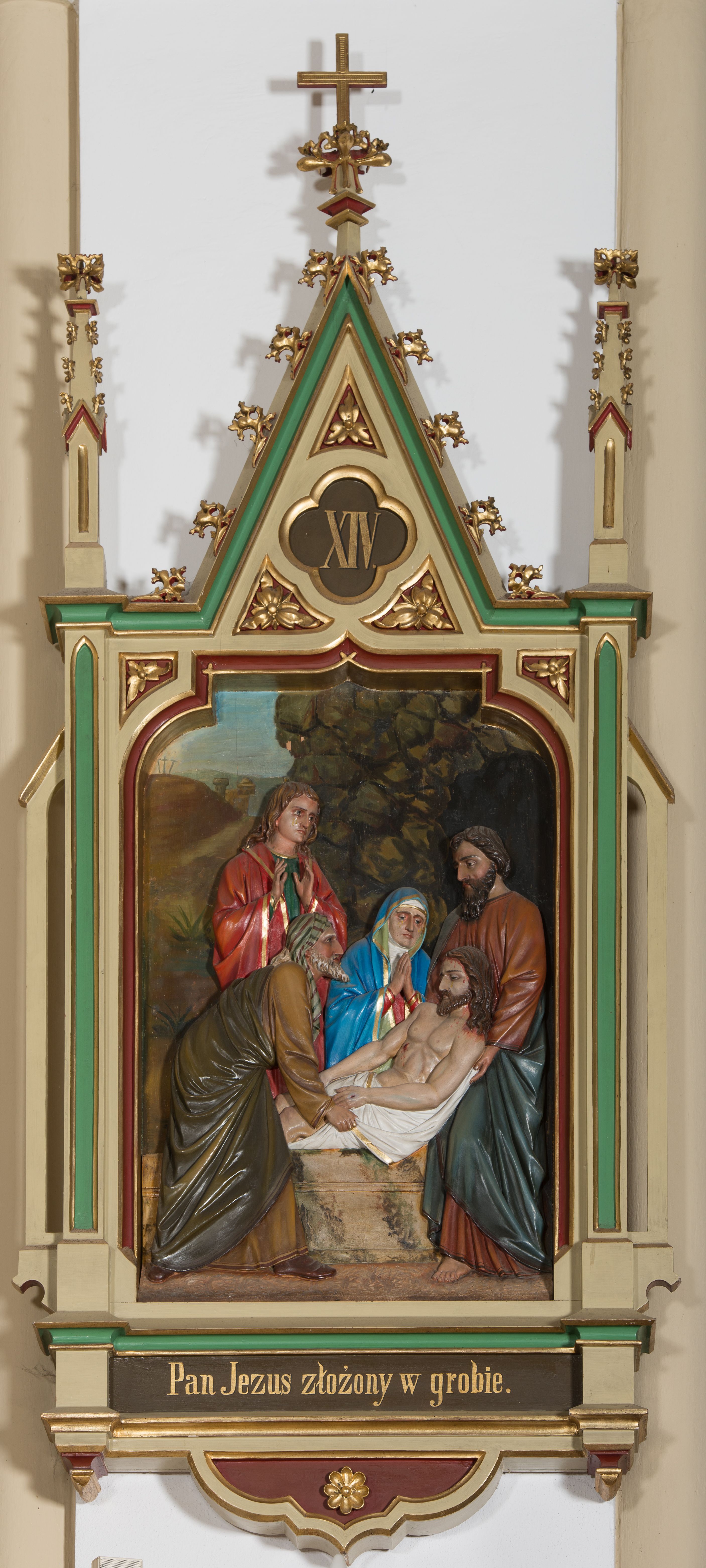 Czternaście płaskorzeźbionych, polichromowanych stacji drogi krzyżowej ukazanych na tle malowanego pejzażu. Przedstawienia ujęte w neogotyckie, architektoniczne ramy zamknięte wimpergą z żabkami, zwieńczoną kwiatonem z krzyżem, pośrodku wimpergi czterolistna płycina z numerem stacji. Wnęka na płaskorzeźbę zamknięta łukiem dwuramiennym. Partia cokołowa ujęta od dołu podwieszeniem z rozetką. Polichromia ram w odcieniu kremowym, zielonym i ciemnoczerwonym z pozłacanym detalem. Sceny wielofigurowe z Chrystusem w centrum. Chrystus na większości przedstawień jest ubrany w długą, białą tunikę z pozłacaną lamówką i czerwony płaszcz z błękitną podszewką. Twarz owalna okolona ciemnymi włosami i ciemnym zarostem. W tle pejzaż z elementami architektury. Na stacji pierwszej, w prawym dolnym rogu napis „Ferd(inand) Stuflesser / Bildabauer / S(ank)t Ulrich Gröden Tirol / 1903”.