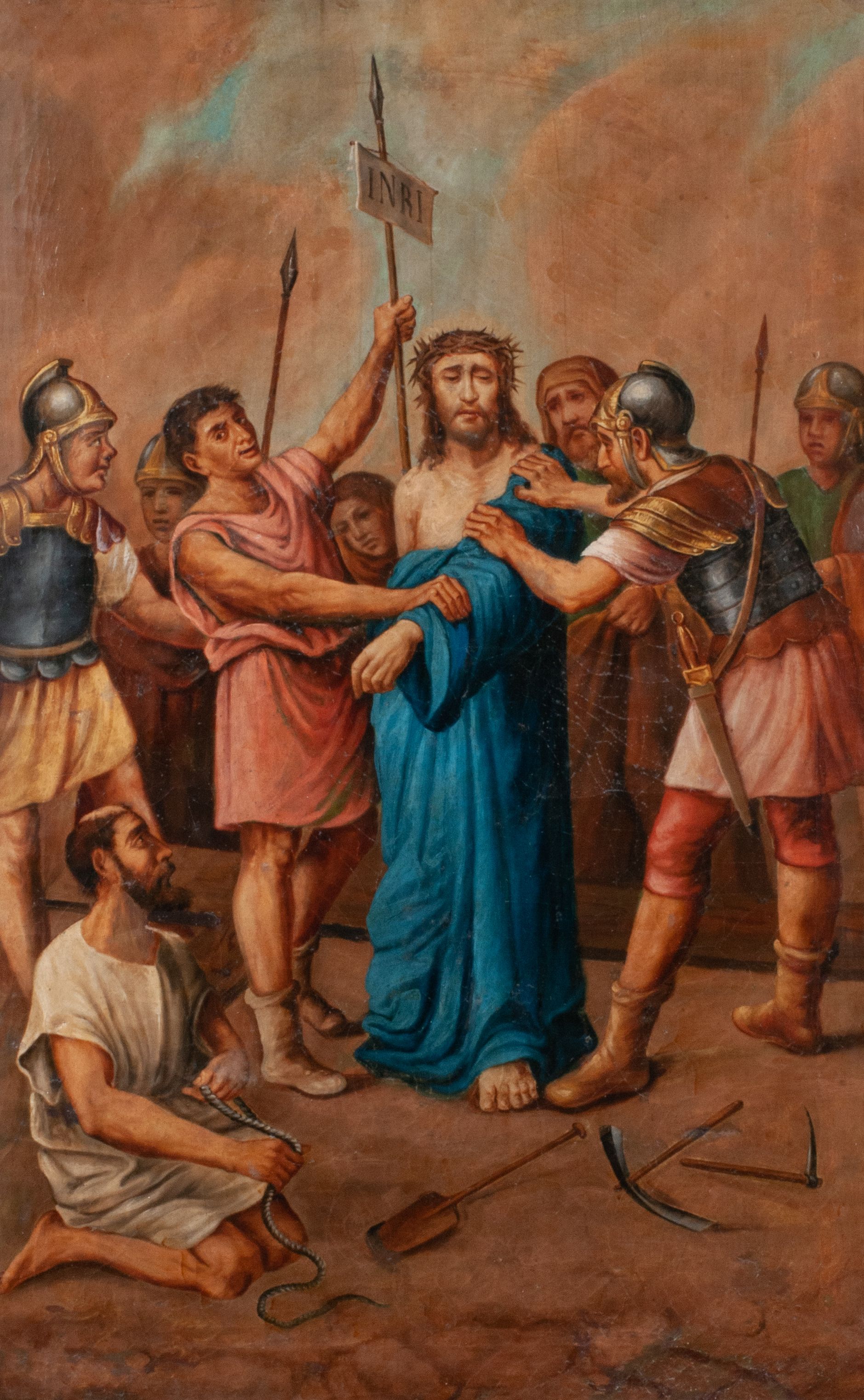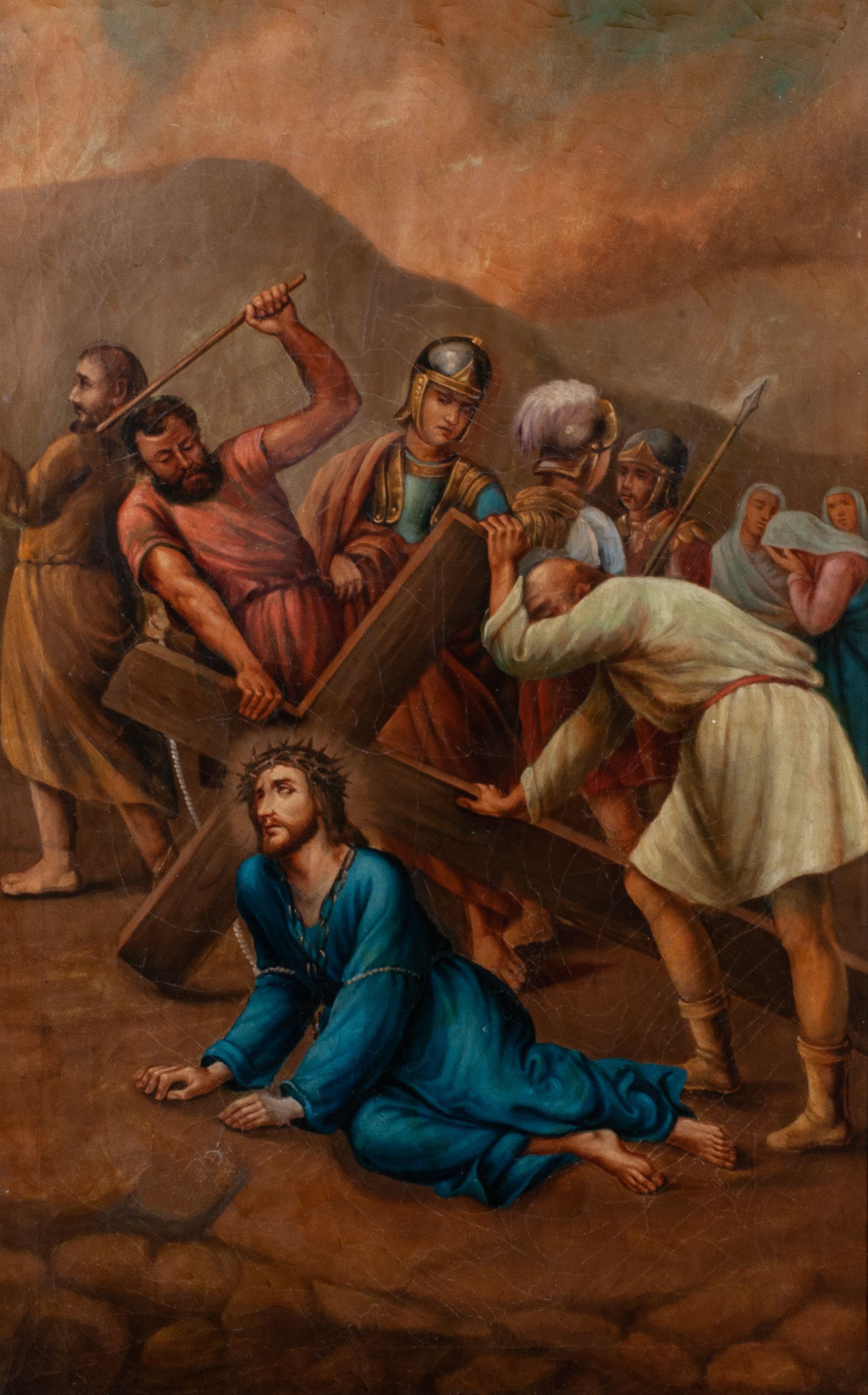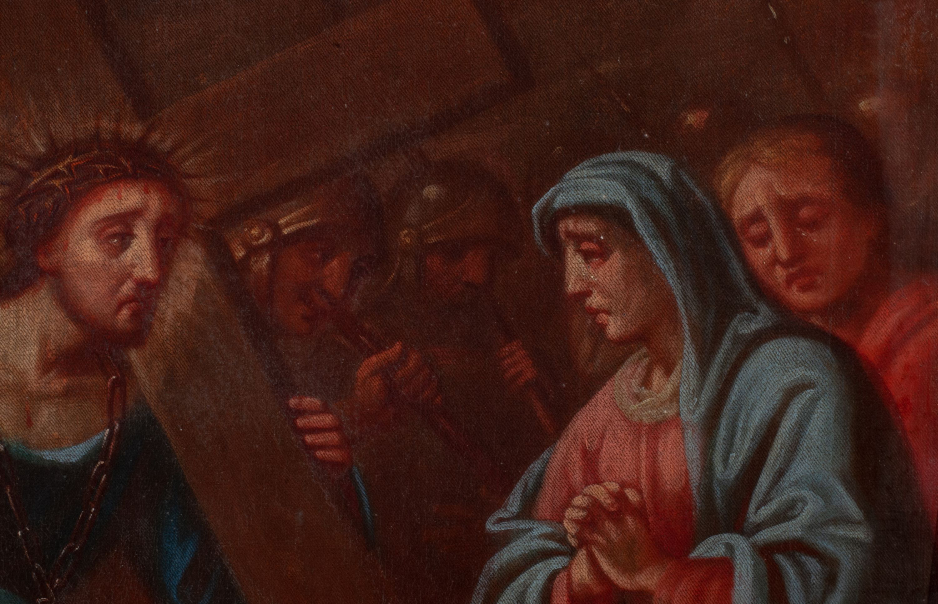 Warstwa malarska pociemniała, spękana, płótno miejscowo zdublowane. Brak stacji XII – Ukrzyżowanie.