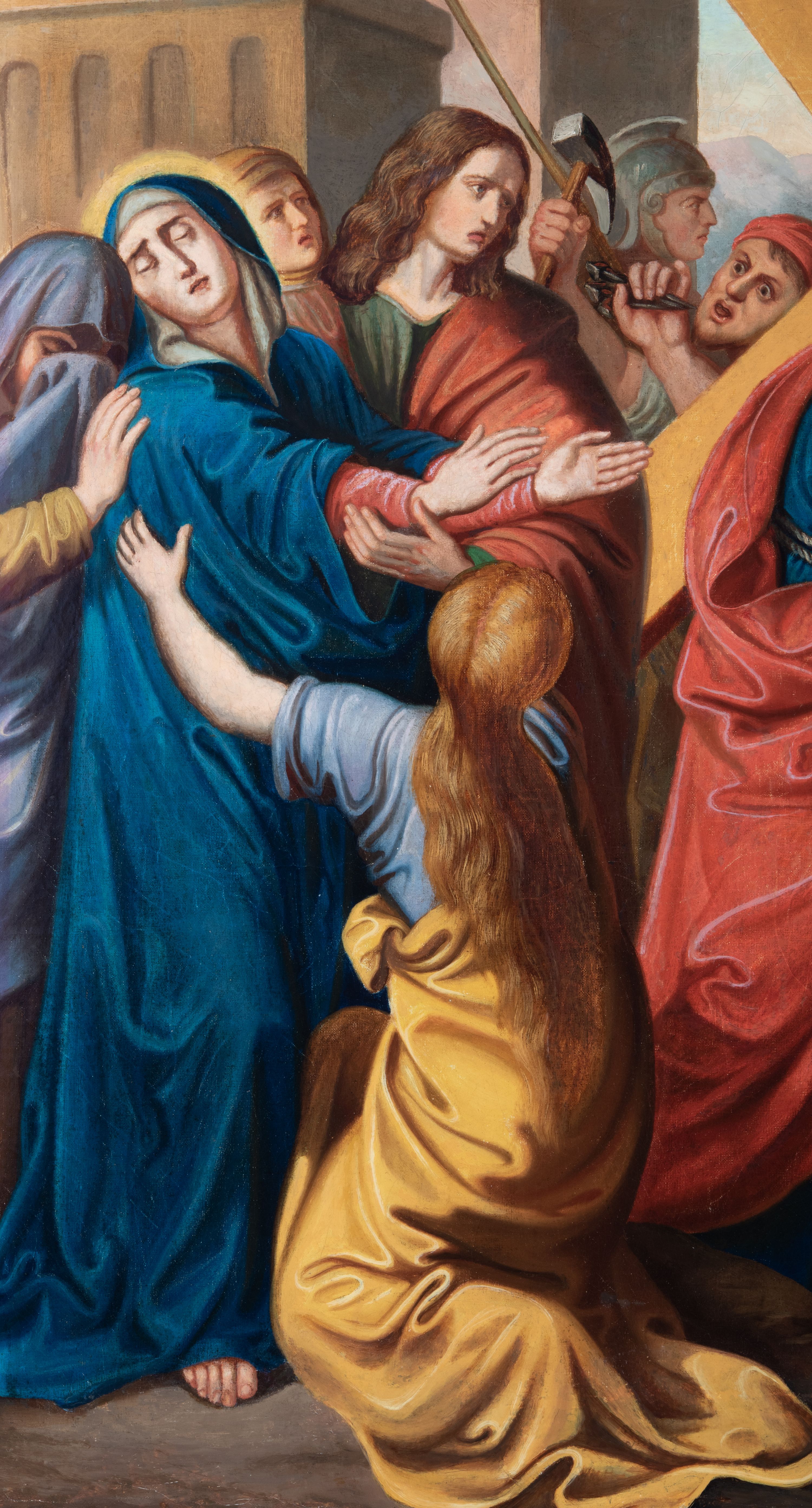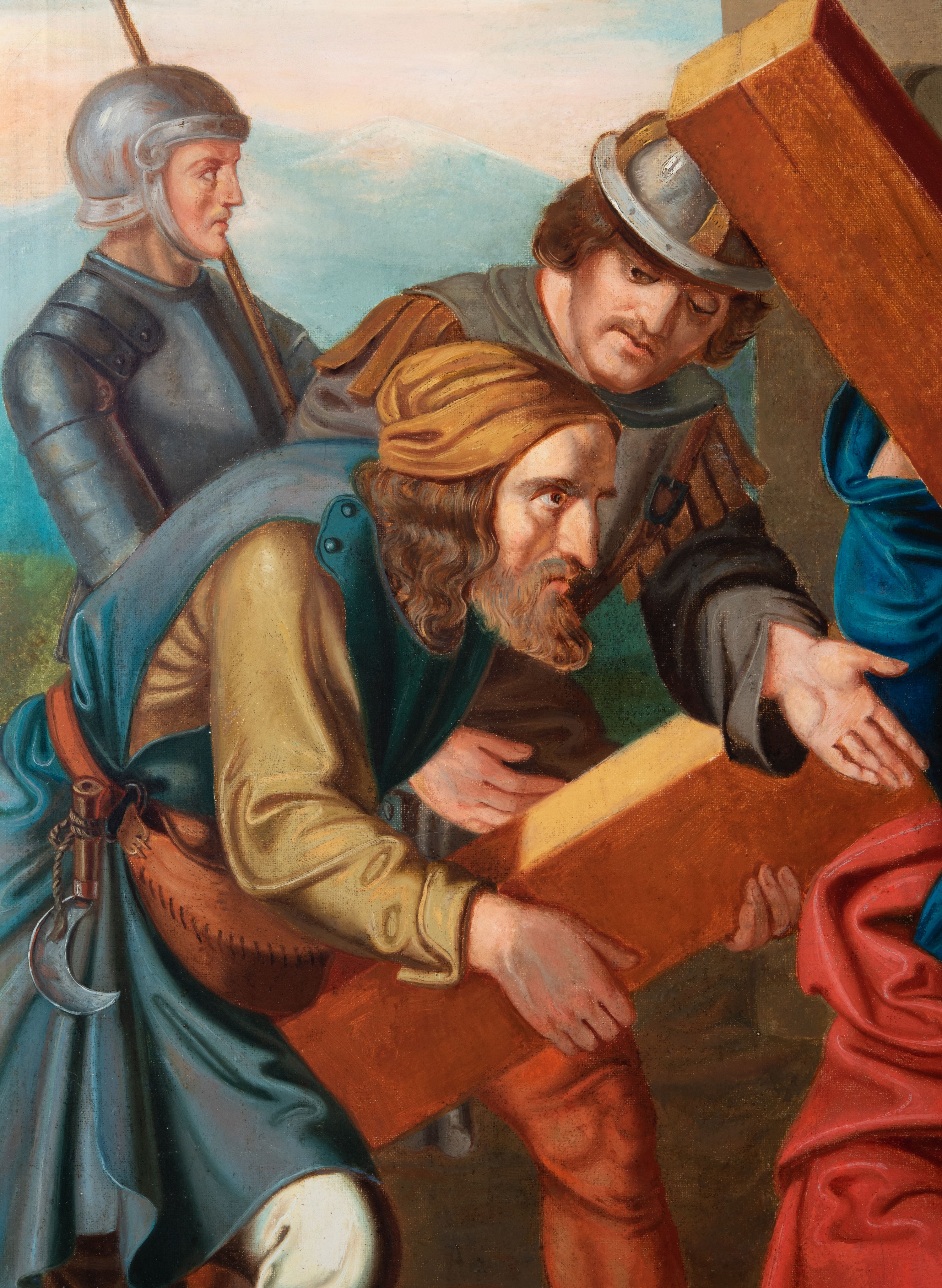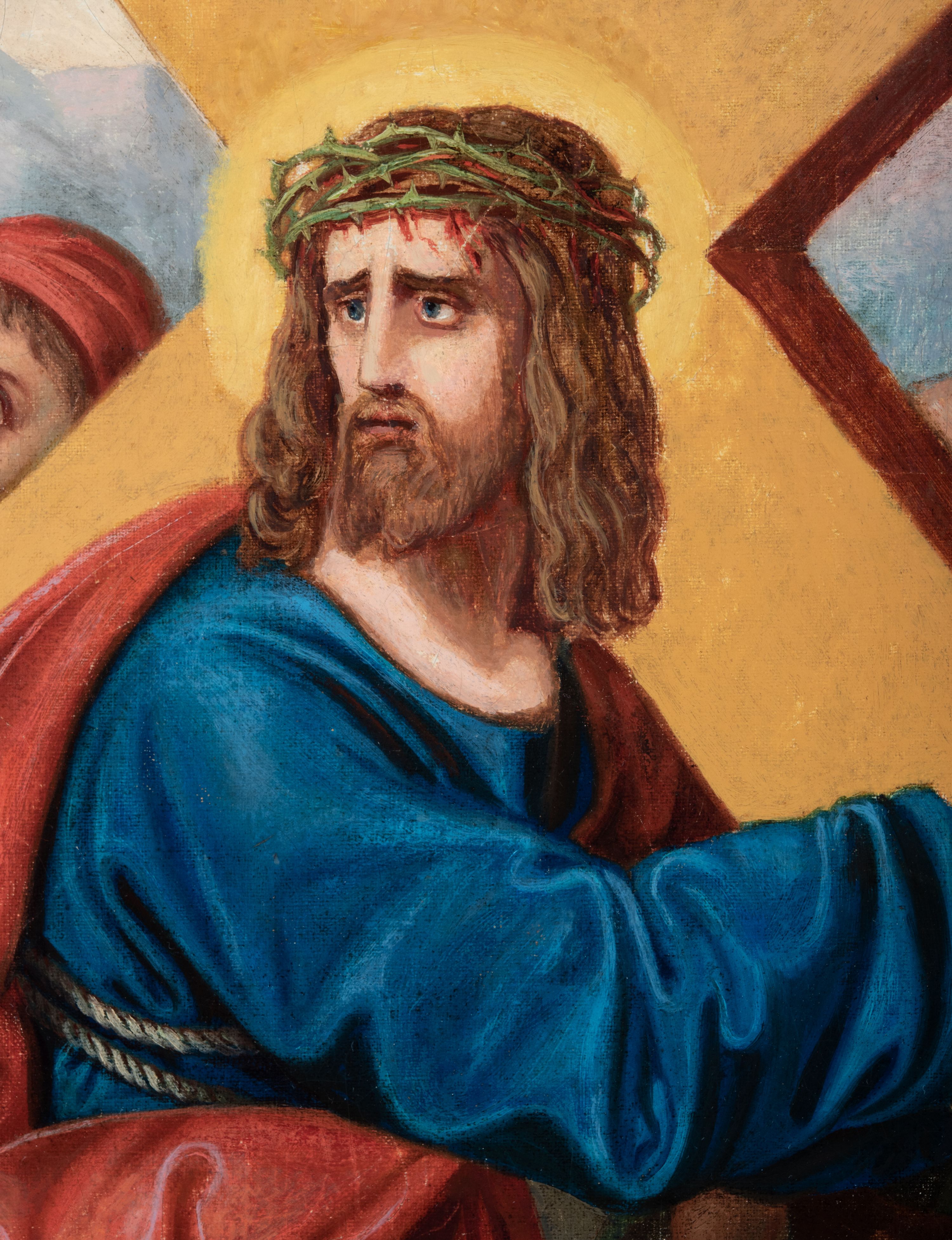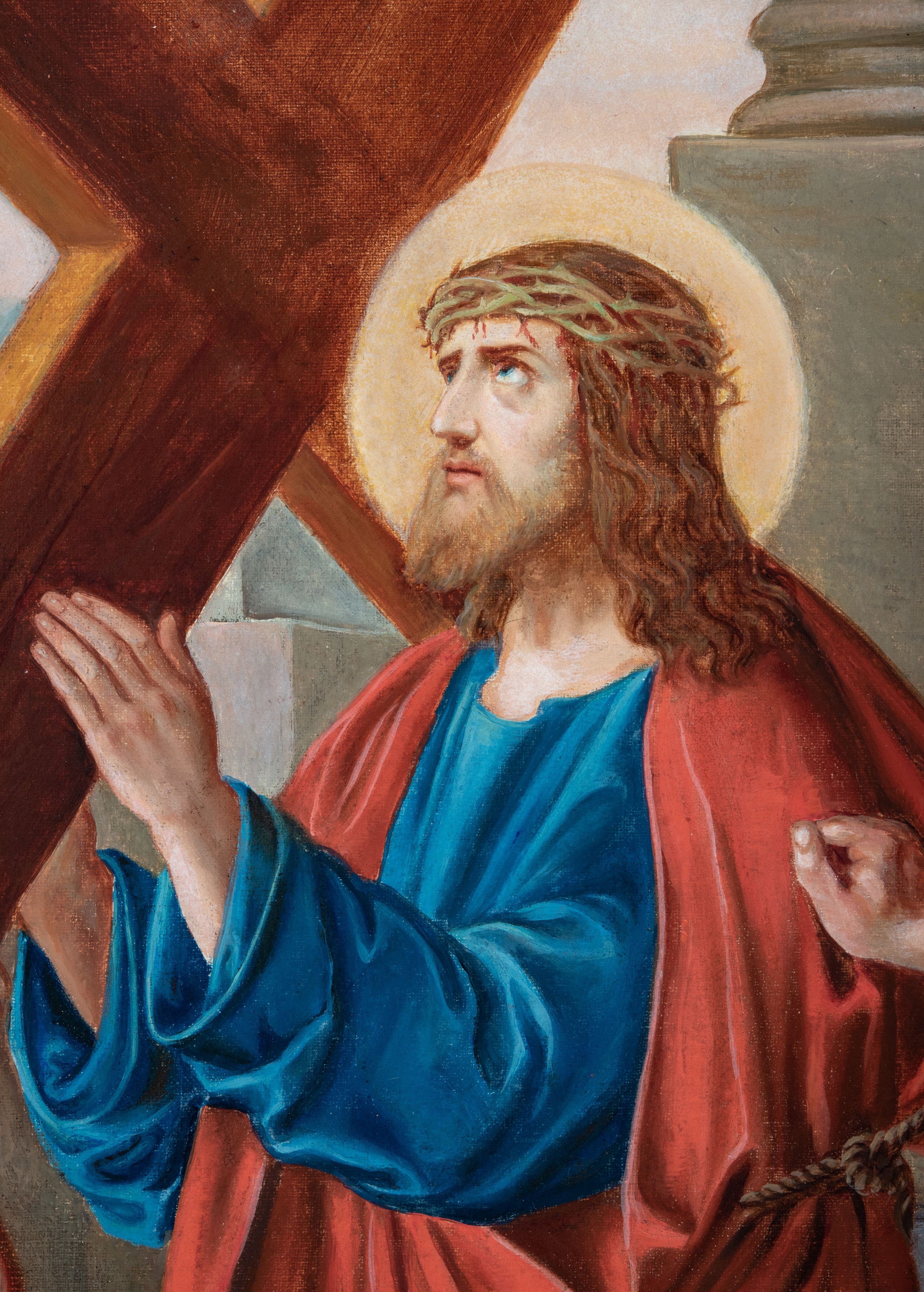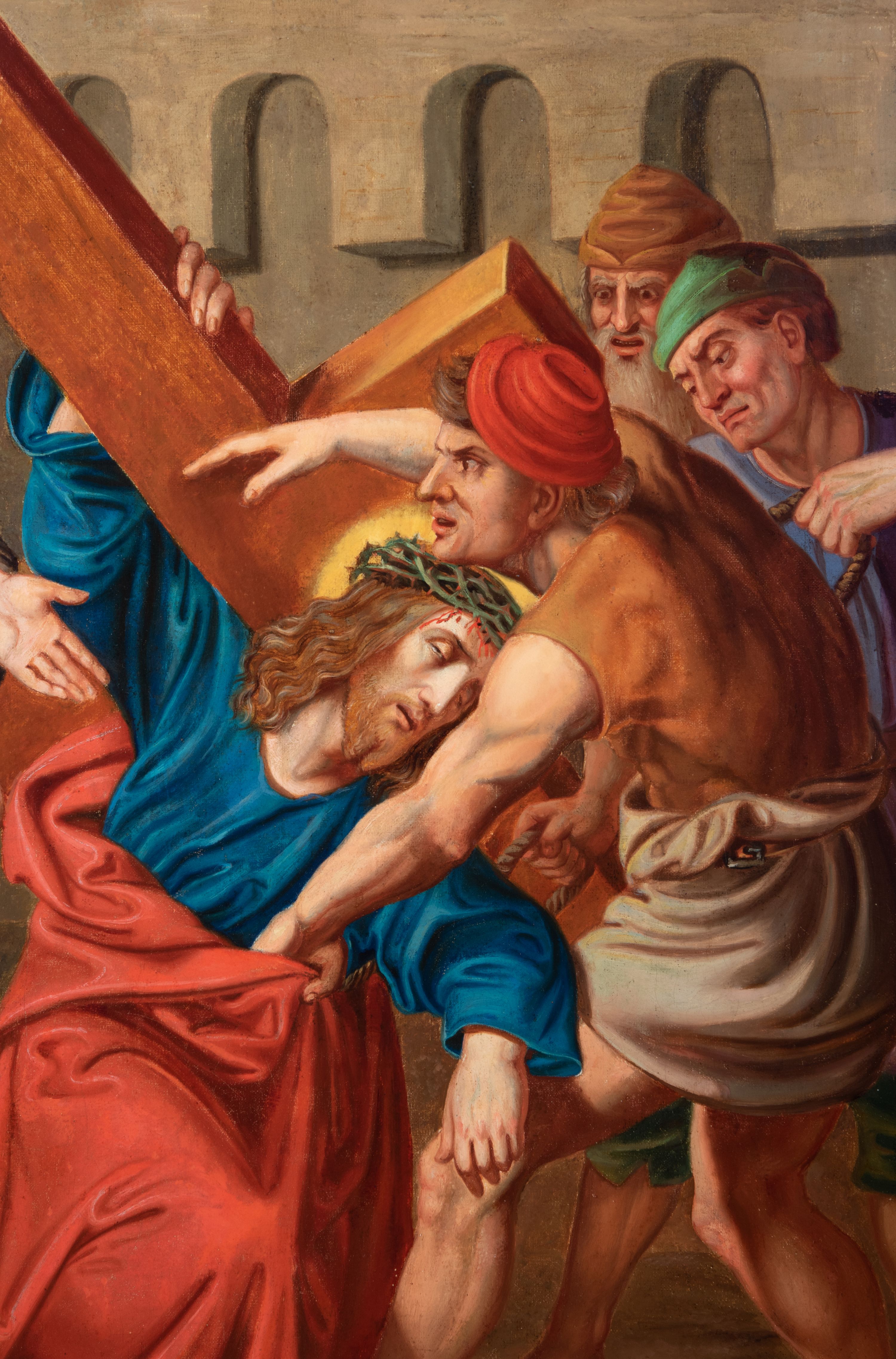 Czternaście obrazów uzyskało ten sam kształt stojącego prostokąta, obramienionego prostą, złoconą i profilowaną ramą. W polach obrazowych znalazły się wielopostaciowe kompozycje umieszczone najczęściej na tle pejzażu, ale także i architektury. Narracja każdego z obrazów skupia się na osobie Chrystusa, któremu towarzyszą inni ludzie, zgodnie z tematyką kolejnej stacji. Namalowane postacie wykonują gwałtowne i dynamiczne gesty. Na ich twarzach o jasnych karnacjach widoczne są różne emocje. Postacie ubrane są w obficie drapowane szaty o intensywnej i kontrastowej kolorystyce. Cykl przedstawia: 1) Sąd Piłata, 2) Jezus bierze krzyż na ramiona, 3) Pierwszy upadek Chrystusa, 4) Chrystus spotyka matkę, 5) Szymon z Cyreny pomaga nieść krzyż Jezusowi, 6) Weronika ociera twarz Jezusa, 7) Drugi upadek pod krzyżem Chrystusa, 8) Jezus upomina płaczące niewiasty, 9) Trzeci upadek pod krzyżem Chrystusa, 10) Obnażenie z szat Jezusa, 11) Przybicie do krzyża Chrystusa, 12) Śmierć Chrystusa na krzyżu, 13) Opłakiwanie Jezusa, 14) Złożenie Chrystusa do grobu.