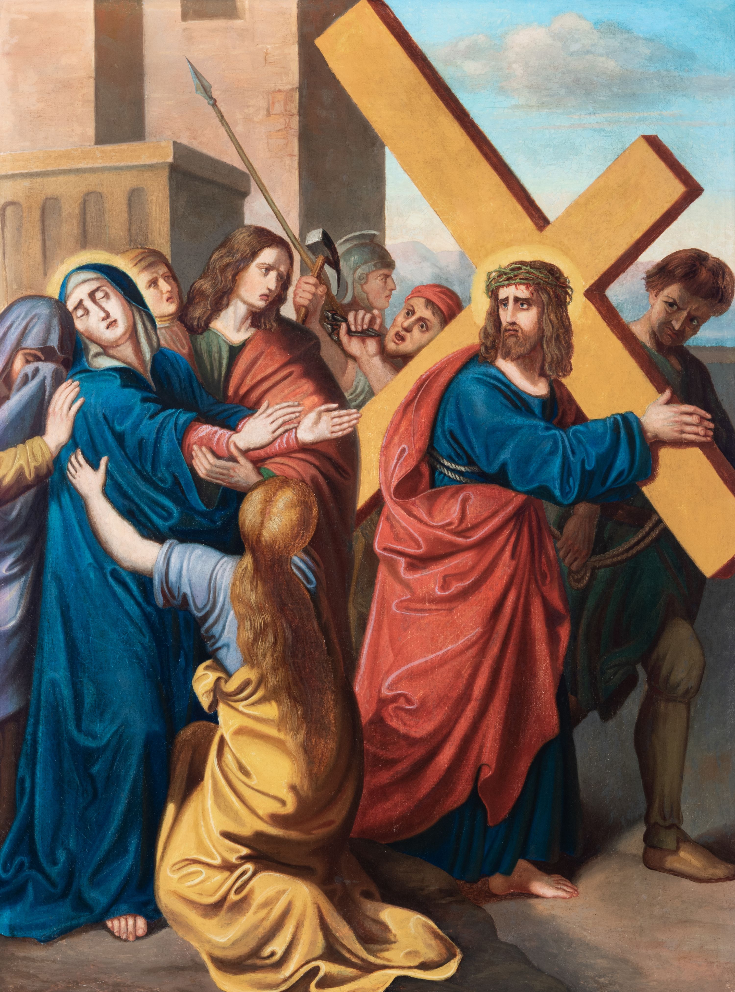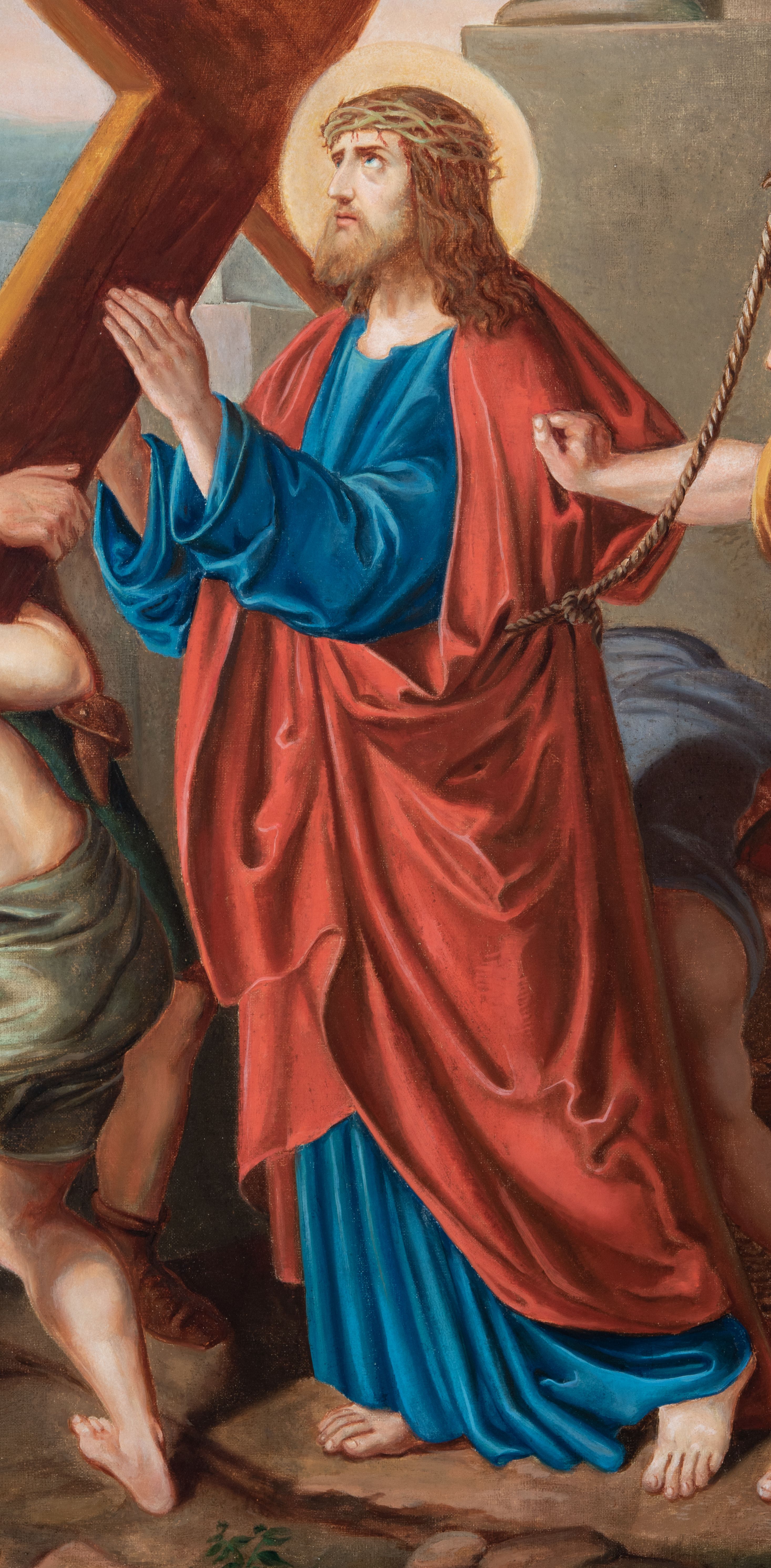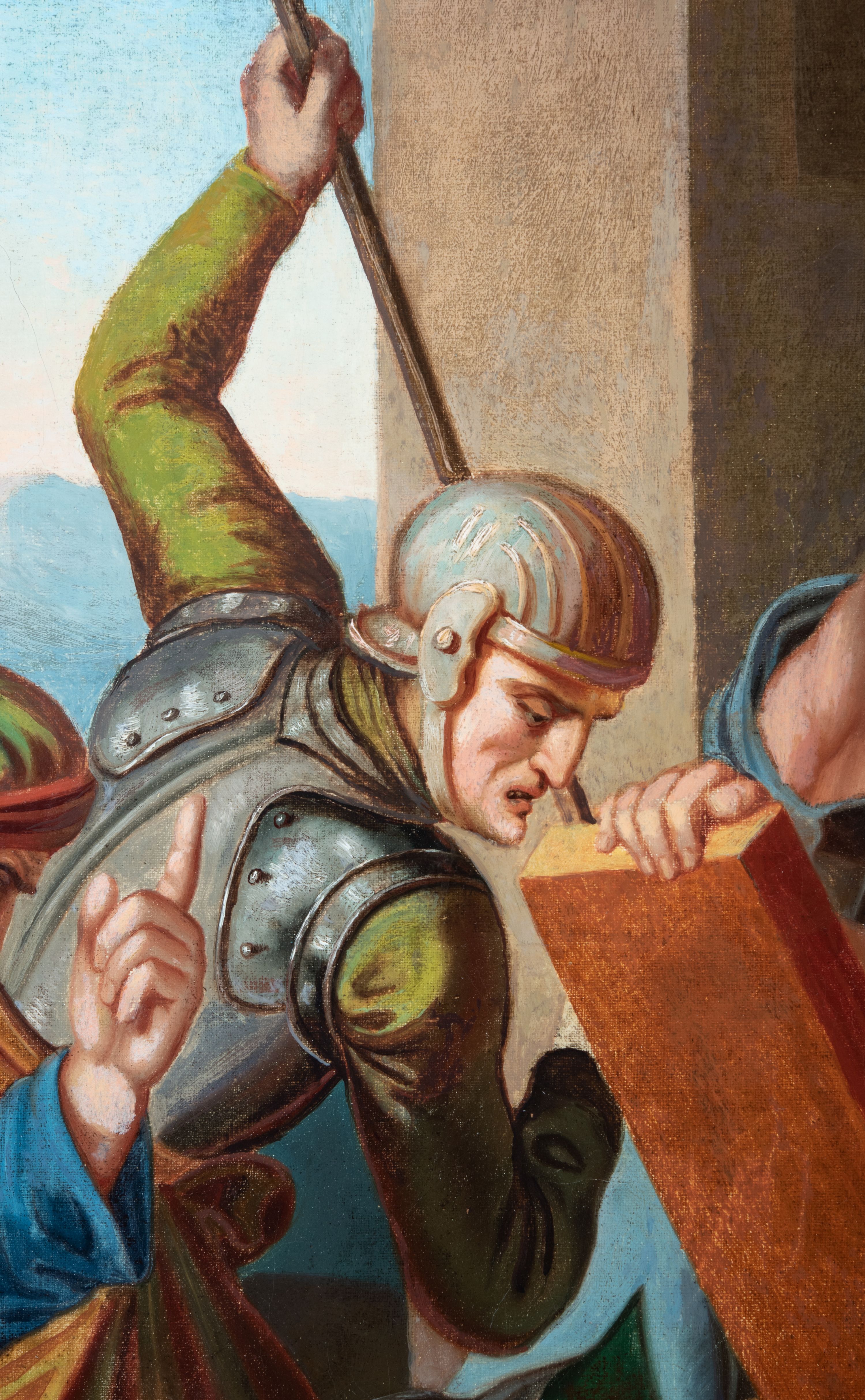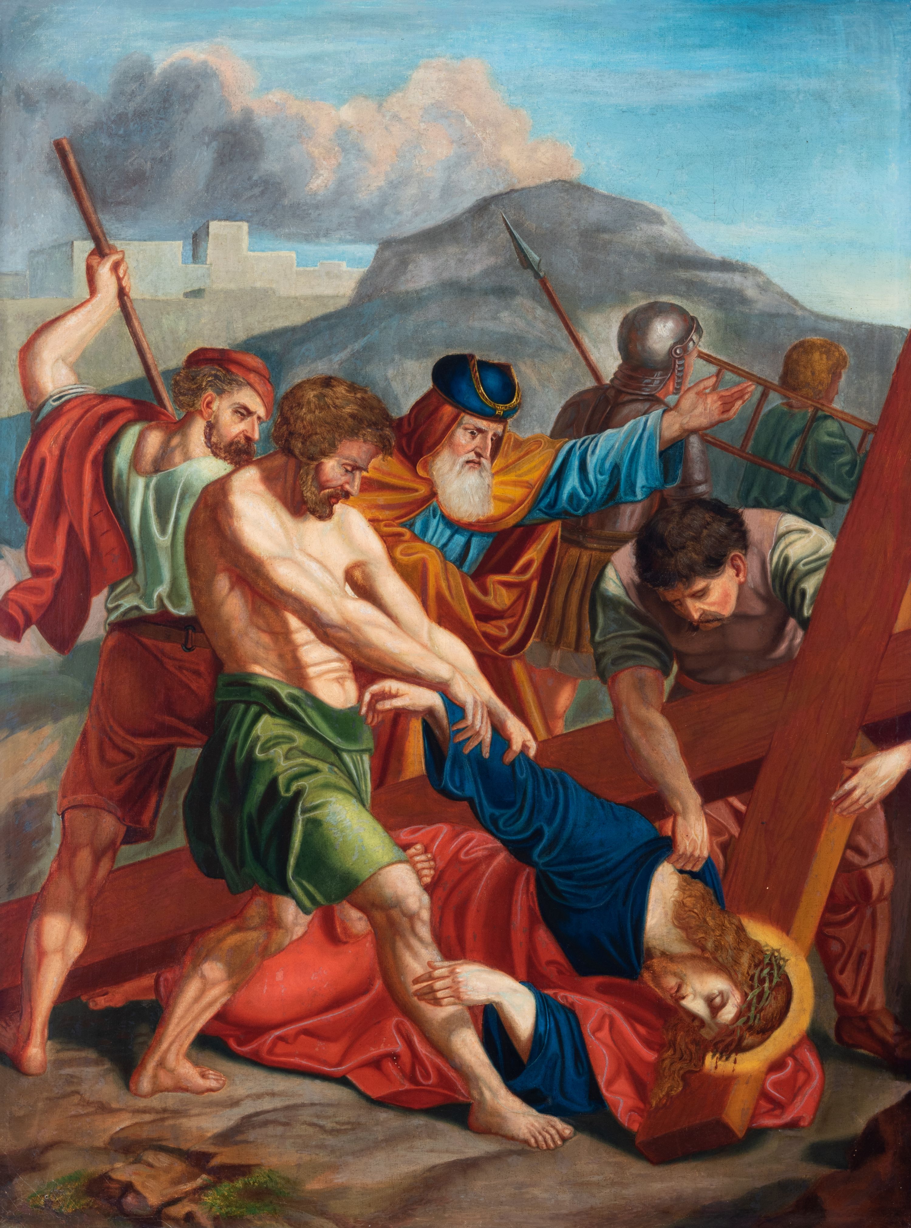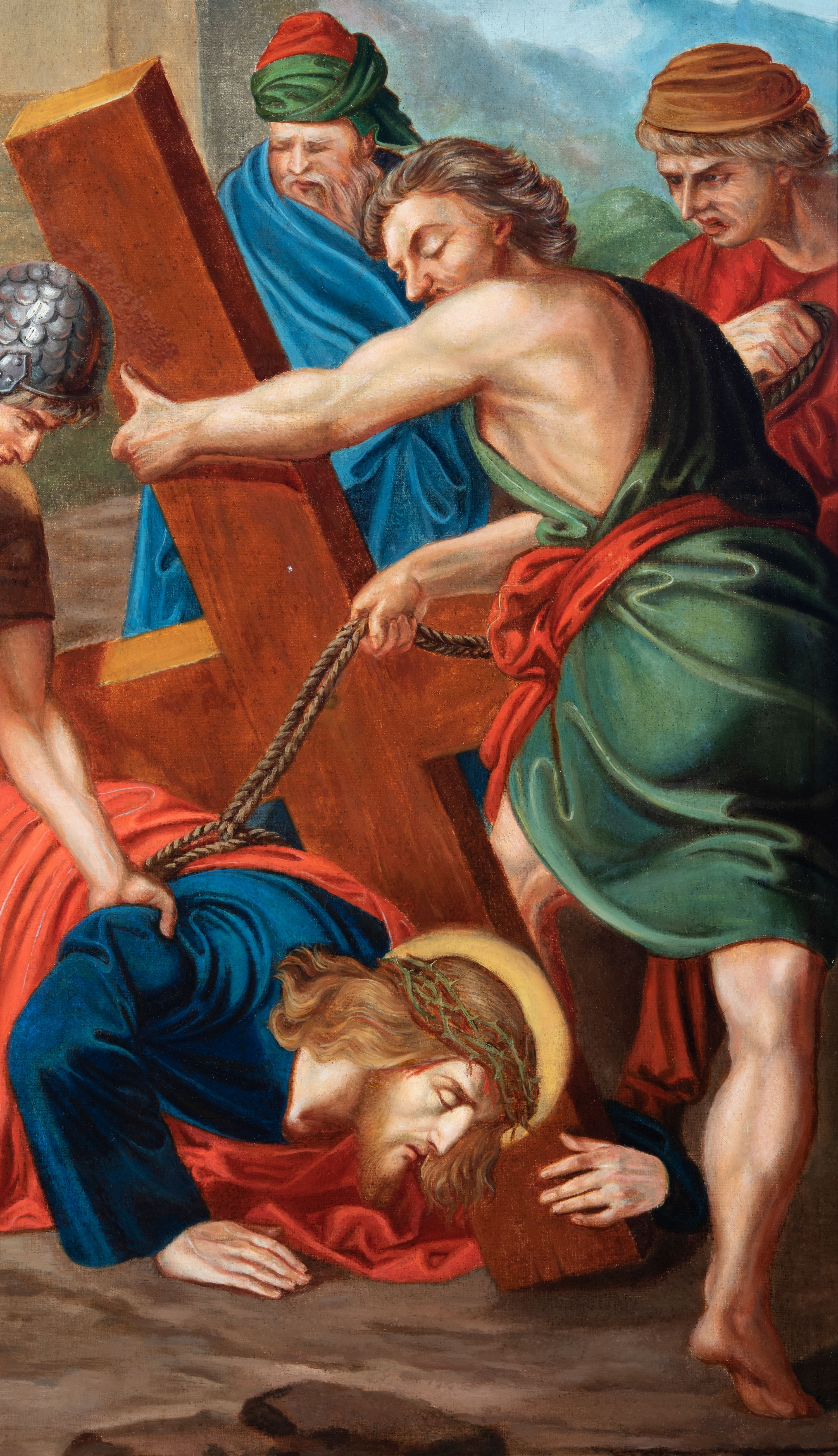 Czternaście obrazów uzyskało ten sam kształt stojącego prostokąta, obramienionego prostą, złoconą i profilowaną ramą. W polach obrazowych znalazły się wielopostaciowe kompozycje umieszczone najczęściej na tle pejzażu, ale także i architektury. Narracja każdego z obrazów skupia się na osobie Chrystusa, któremu towarzyszą inni ludzie, zgodnie z tematyką kolejnej stacji. Namalowane postacie wykonują gwałtowne i dynamiczne gesty. Na ich twarzach o jasnych karnacjach widoczne są różne emocje. Postacie ubrane są w obficie drapowane szaty o intensywnej i kontrastowej kolorystyce. Cykl przedstawia: 1) Sąd Piłata, 2) Jezus bierze krzyż na ramiona, 3) Pierwszy upadek Chrystusa, 4) Chrystus spotyka matkę, 5) Szymon z Cyreny pomaga nieść krzyż Jezusowi, 6) Weronika ociera twarz Jezusa, 7) Drugi upadek pod krzyżem Chrystusa, 8) Jezus upomina płaczące niewiasty, 9) Trzeci upadek pod krzyżem Chrystusa, 10) Obnażenie z szat Jezusa, 11) Przybicie do krzyża Chrystusa, 12) Śmierć Chrystusa na krzyżu, 13) Opłakiwanie Jezusa, 14) Złożenie Chrystusa do grobu.