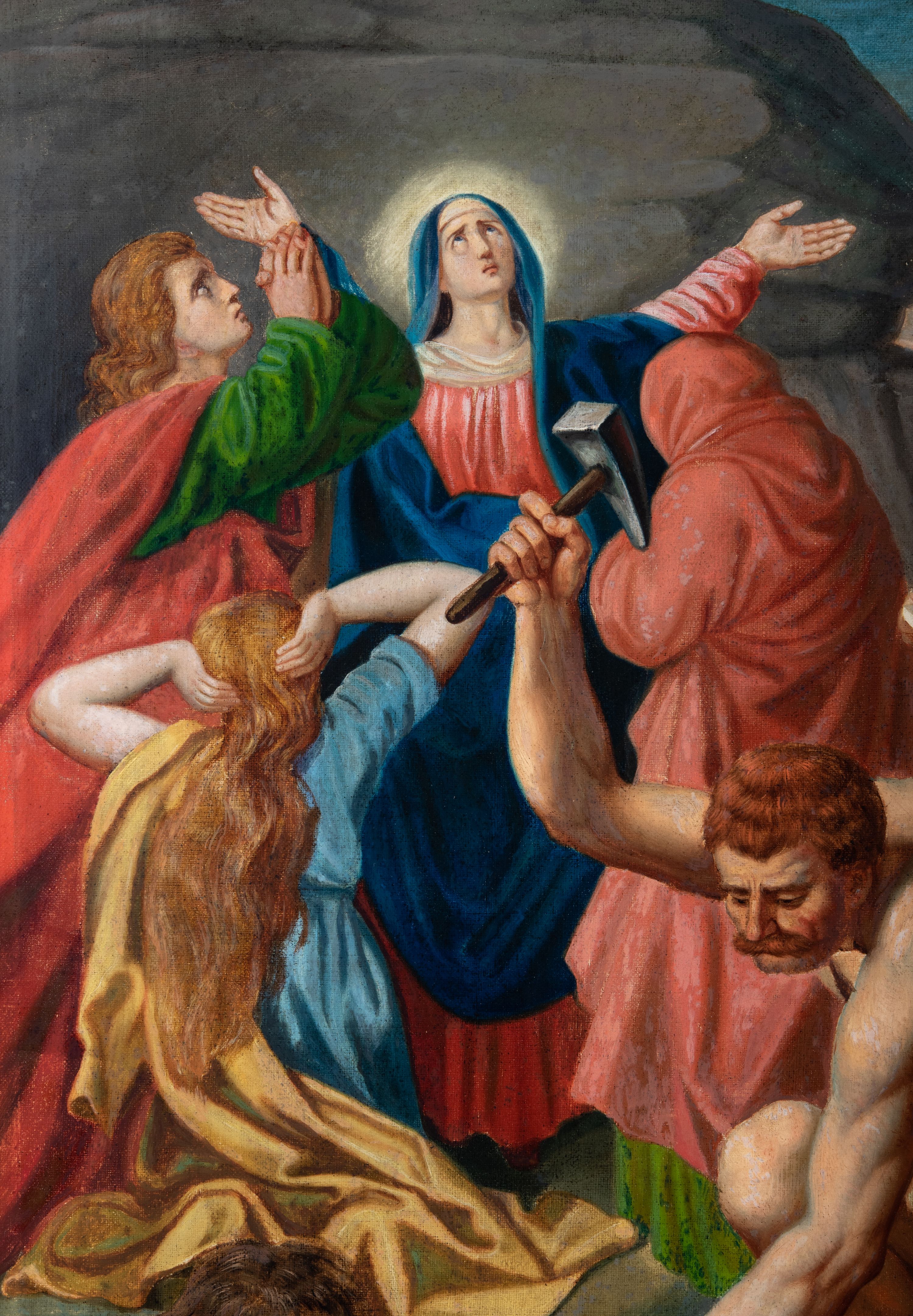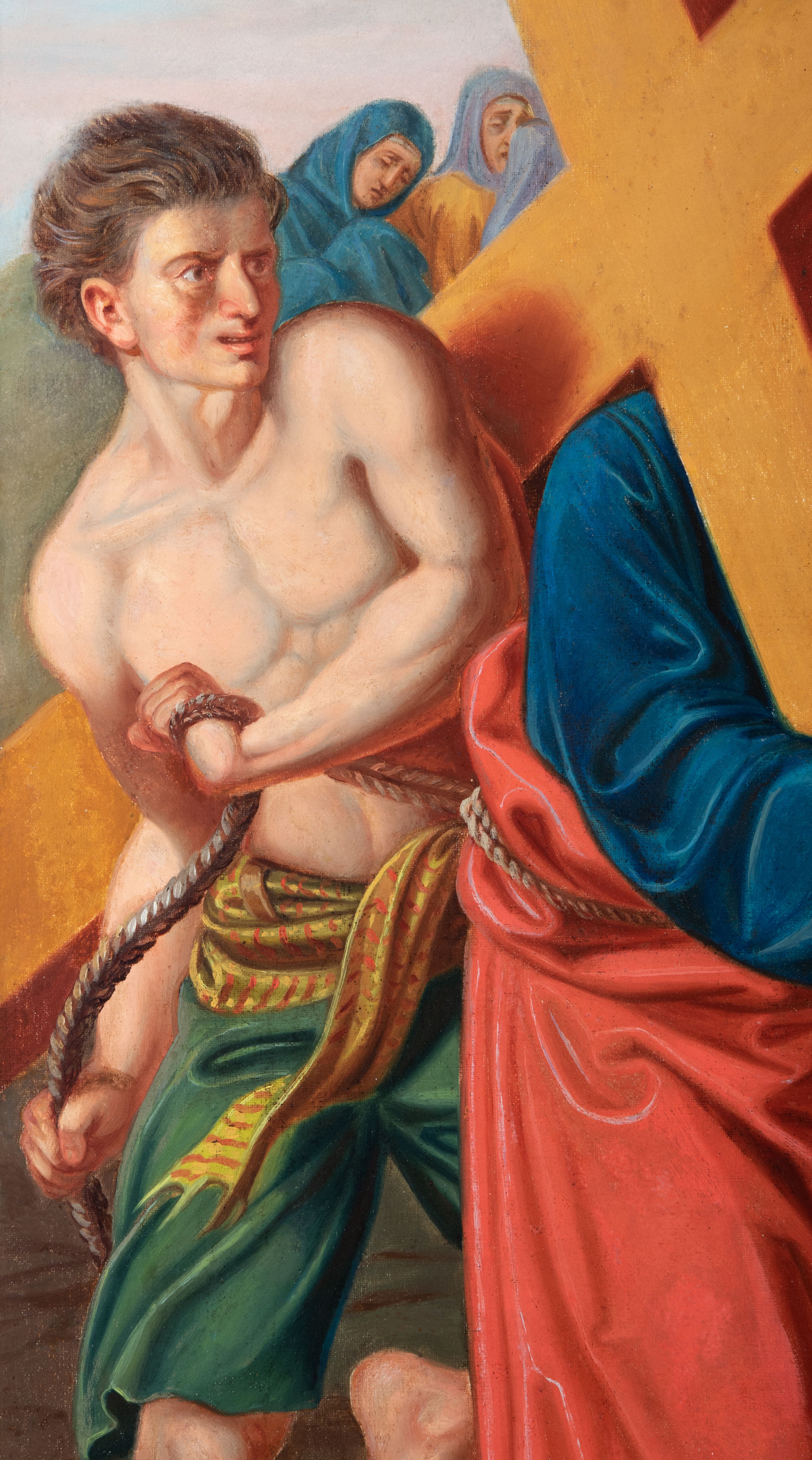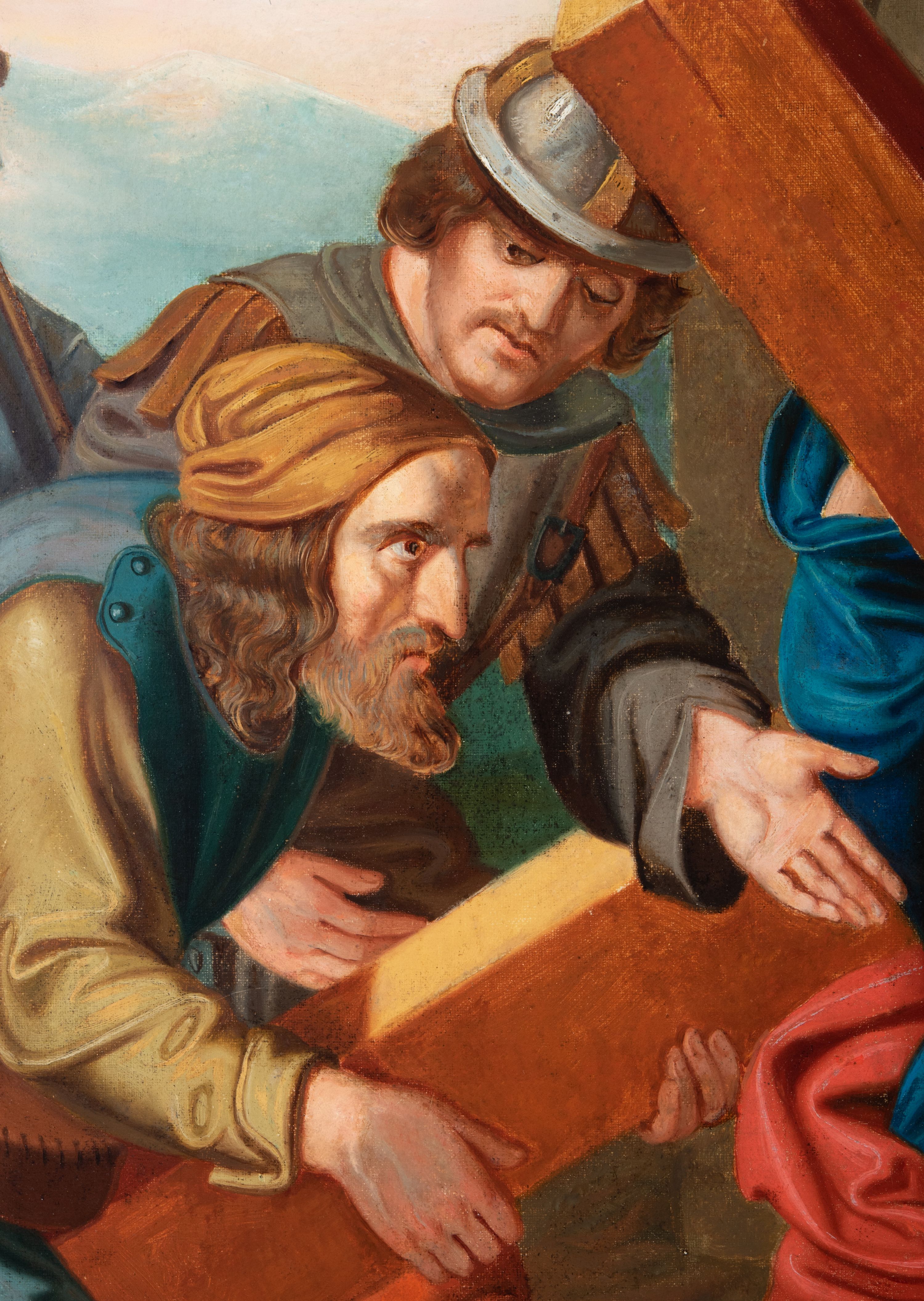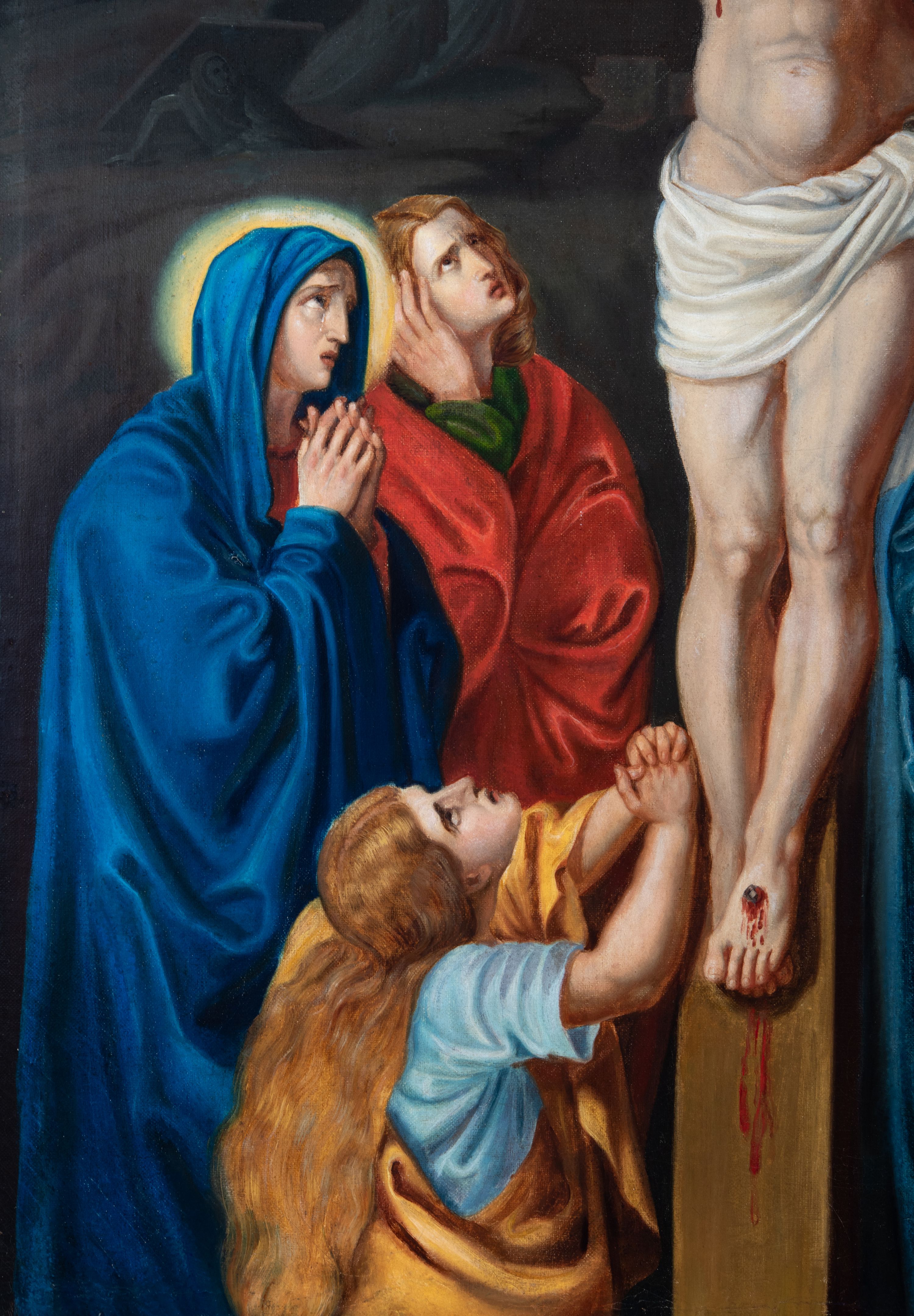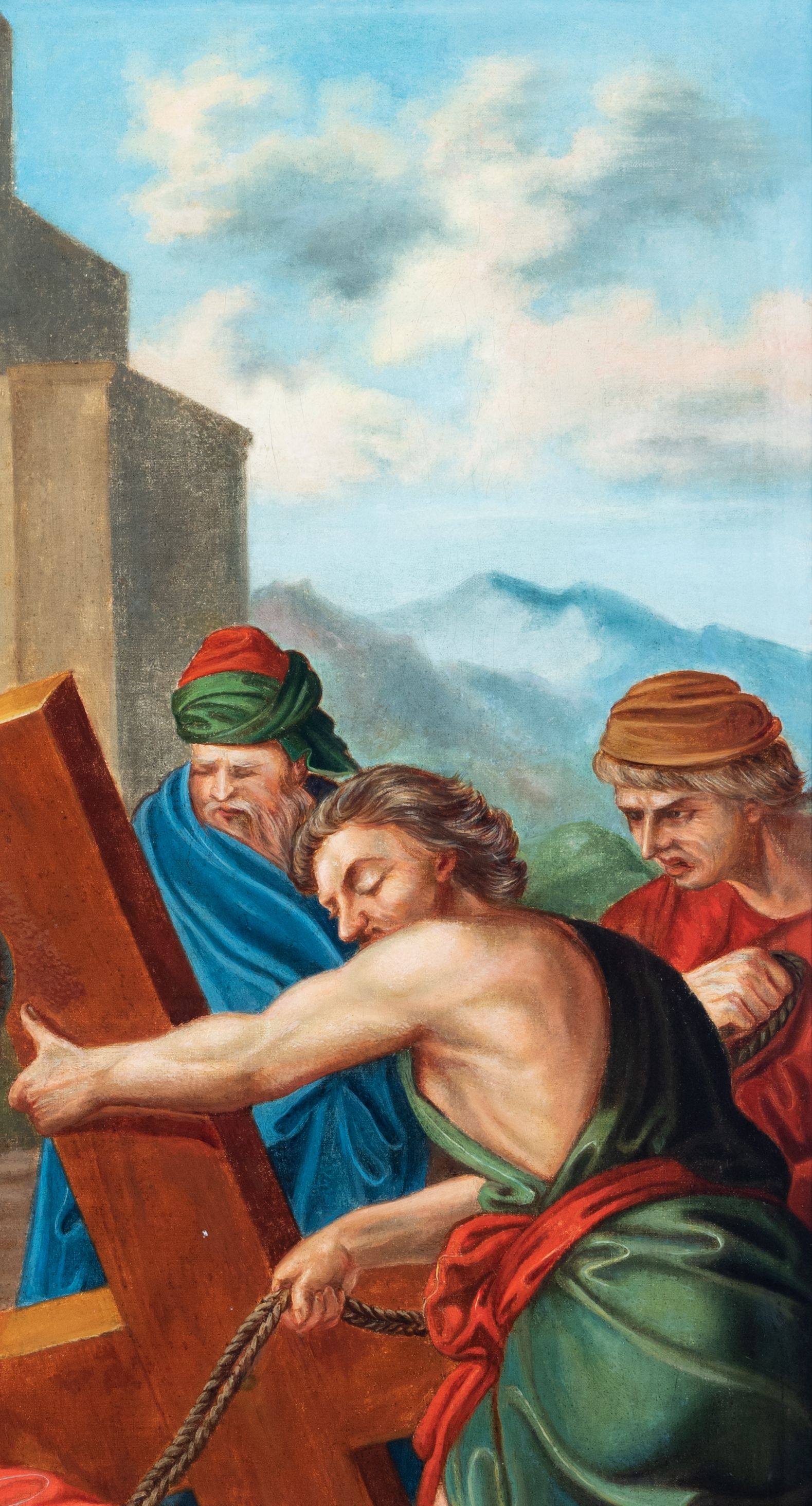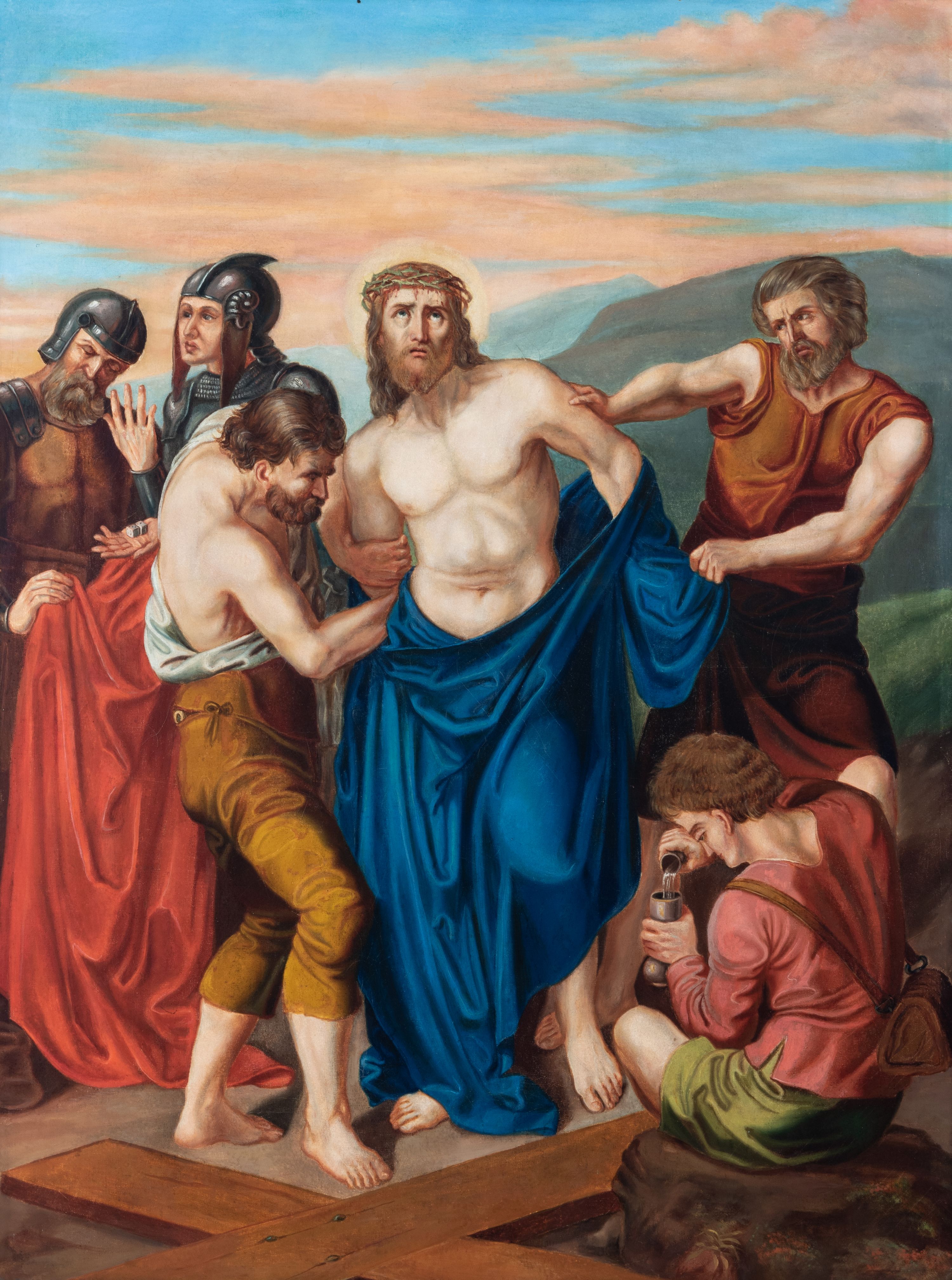 Czternaście obrazów uzyskało ten sam kształt stojącego prostokąta, obramienionego prostą, złoconą i profilowaną ramą. W polach obrazowych znalazły się wielopostaciowe kompozycje umieszczone najczęściej na tle pejzażu, ale także i architektury. Narracja każdego z obrazów skupia się na osobie Chrystusa, któremu towarzyszą inni ludzie, zgodnie z tematyką kolejnej stacji. Namalowane postacie wykonują gwałtowne i dynamiczne gesty. Na ich twarzach o jasnych karnacjach widoczne są różne emocje. Postacie ubrane są w obficie drapowane szaty o intensywnej i kontrastowej kolorystyce. Cykl przedstawia: 1) Sąd Piłata, 2) Jezus bierze krzyż na ramiona, 3) Pierwszy upadek Chrystusa, 4) Chrystus spotyka matkę, 5) Szymon z Cyreny pomaga nieść krzyż Jezusowi, 6) Weronika ociera twarz Jezusa, 7) Drugi upadek pod krzyżem Chrystusa, 8) Jezus upomina płaczące niewiasty, 9) Trzeci upadek pod krzyżem Chrystusa, 10) Obnażenie z szat Jezusa, 11) Przybicie do krzyża Chrystusa, 12) Śmierć Chrystusa na krzyżu, 13) Opłakiwanie Jezusa, 14) Złożenie Chrystusa do grobu.