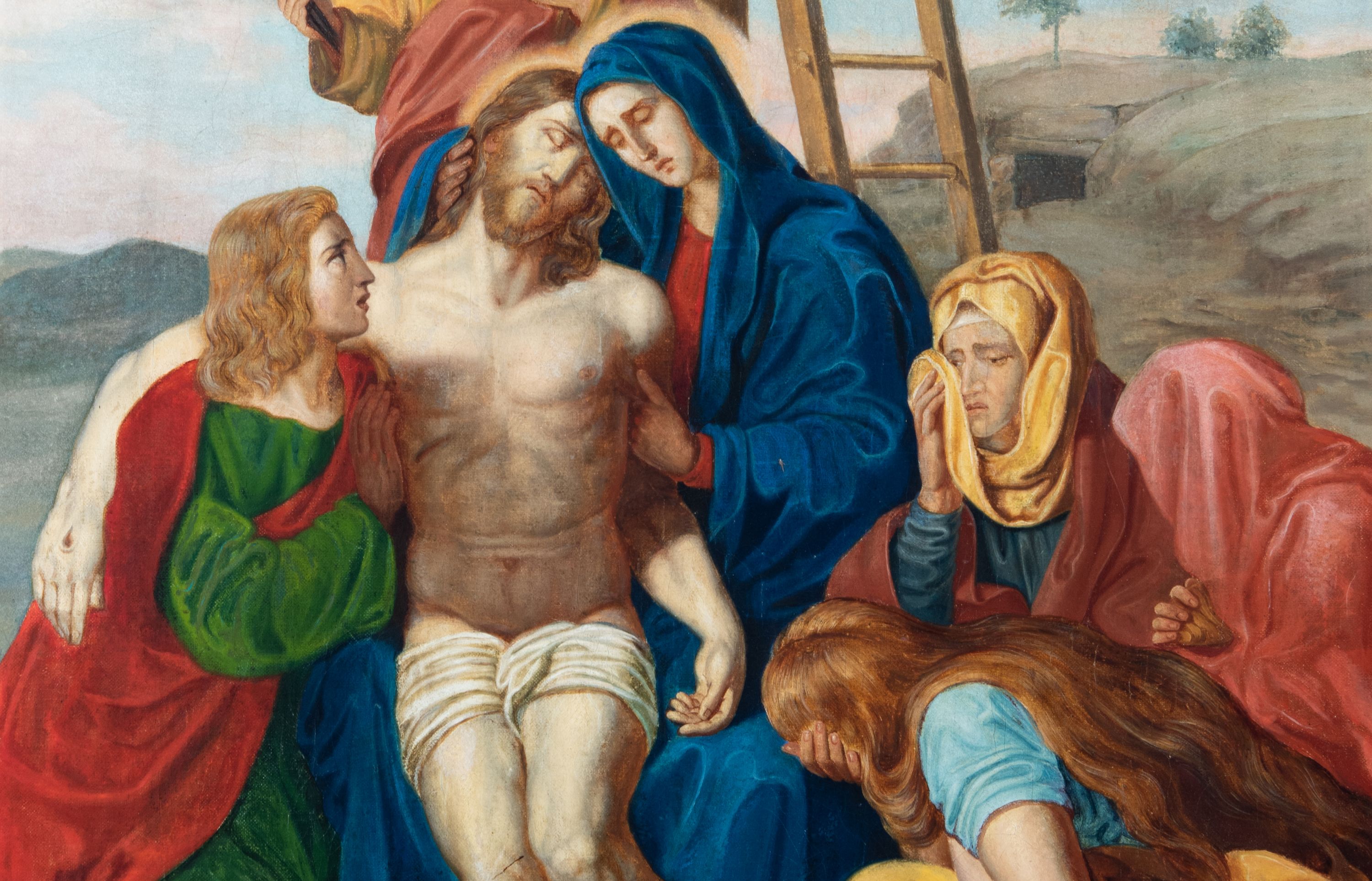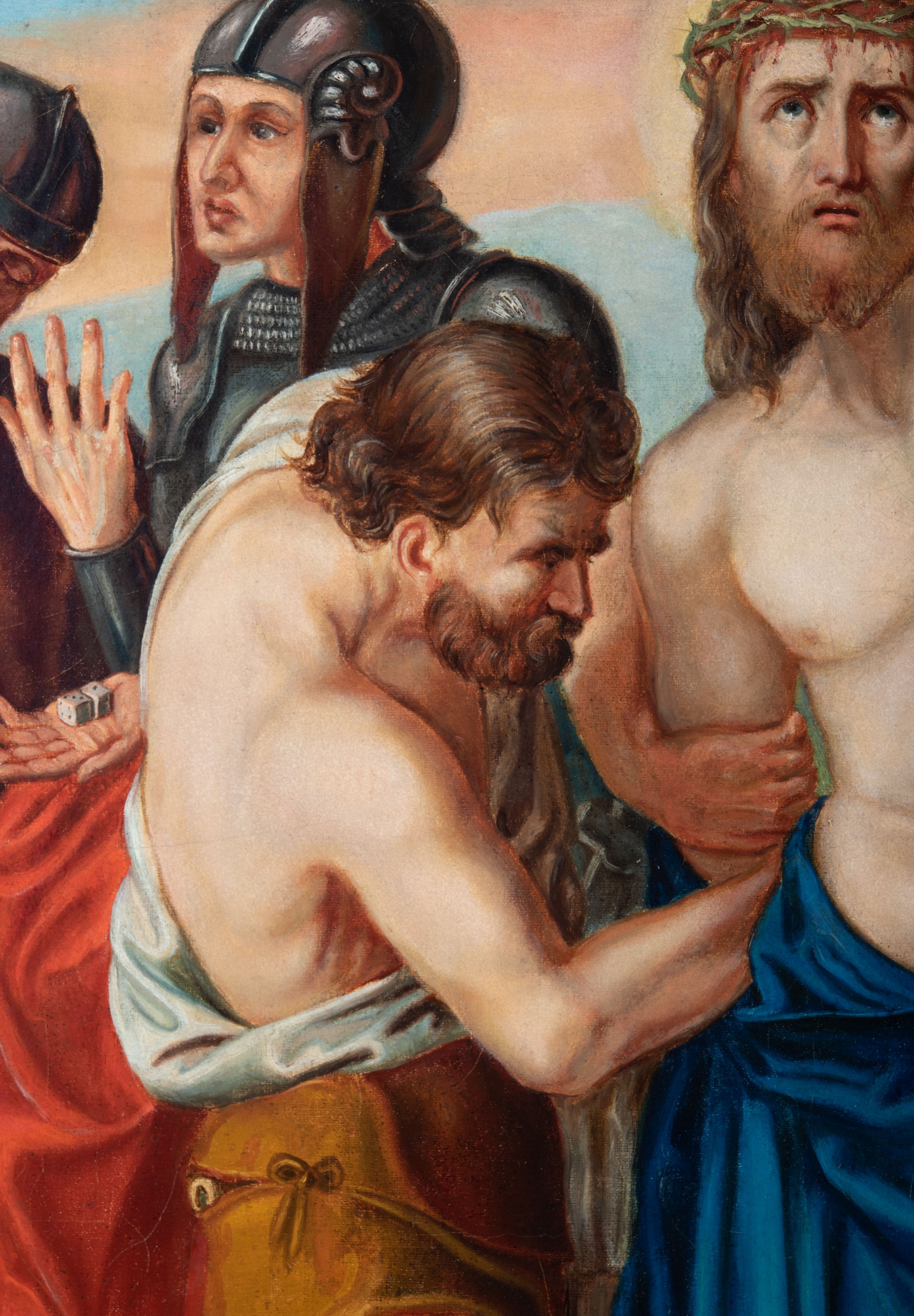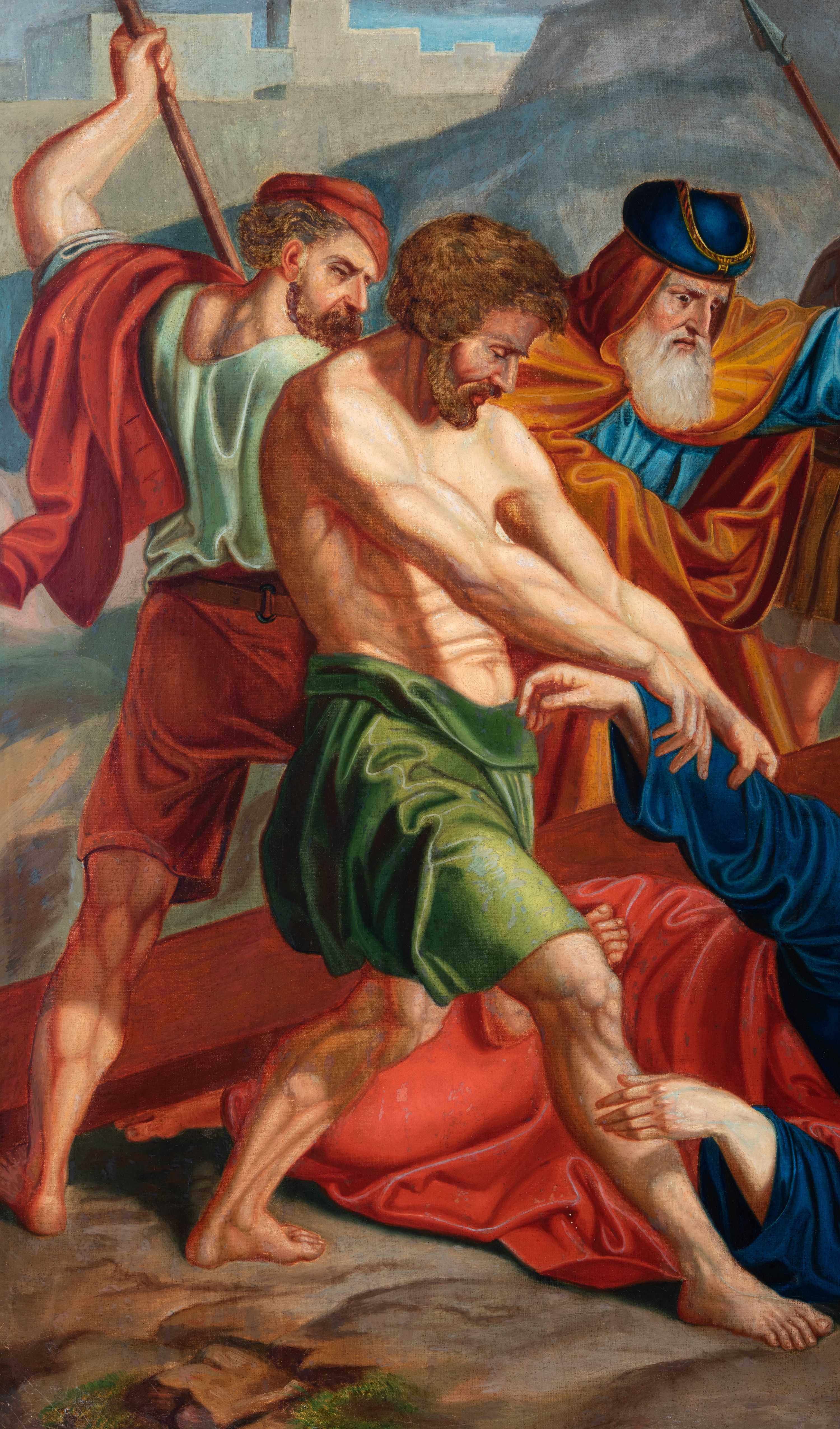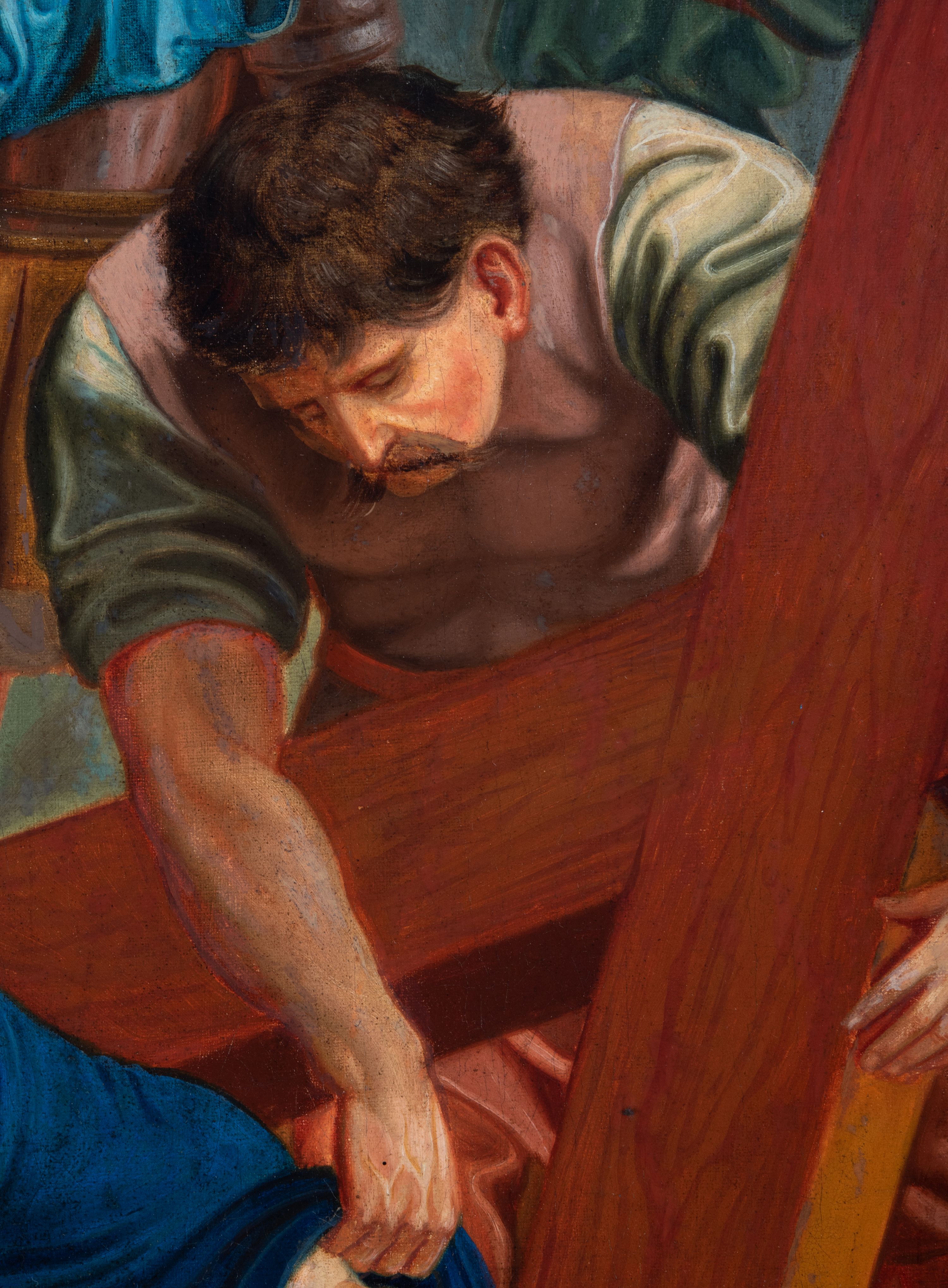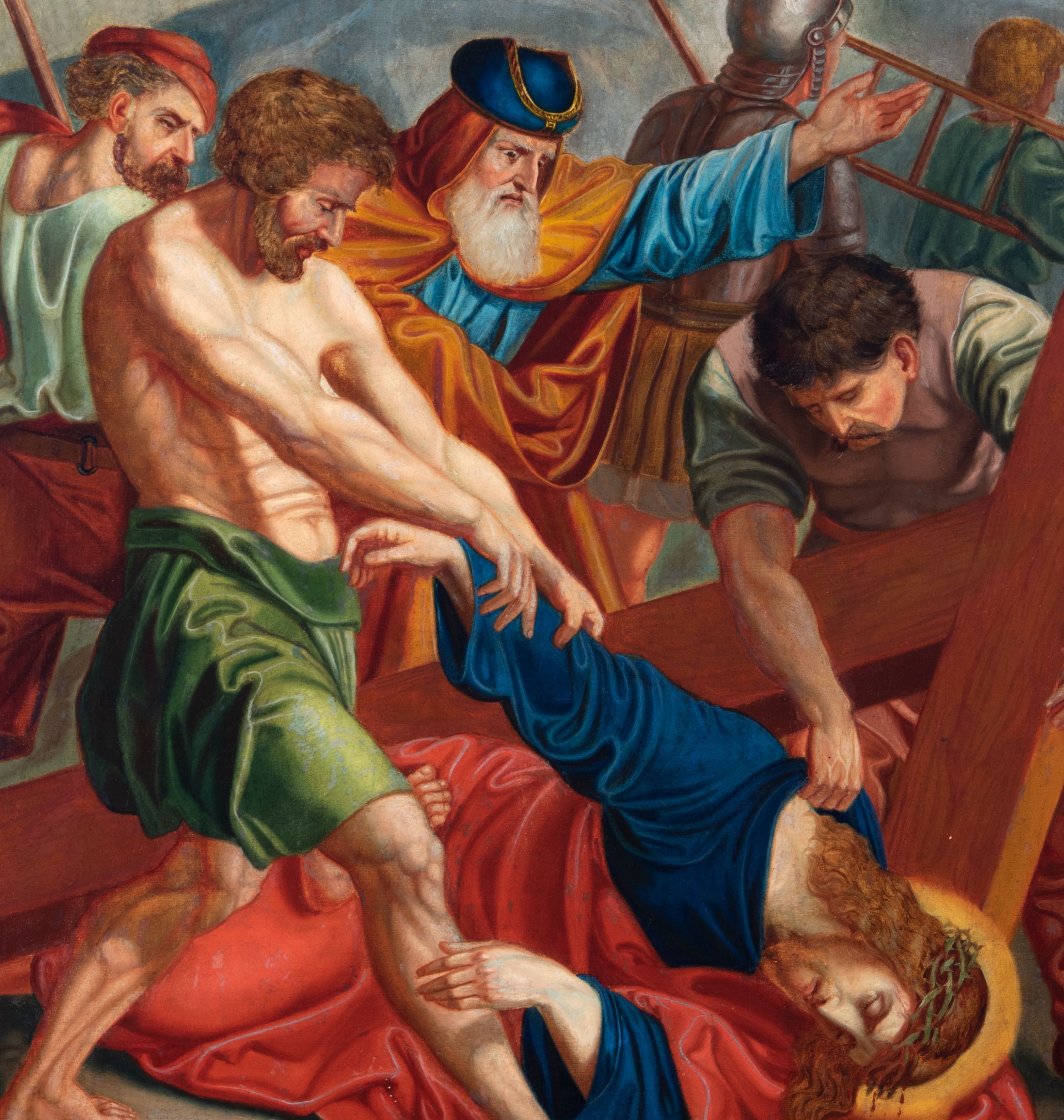 Czternaście obrazów uzyskało ten sam kształt stojącego prostokąta, obramienionego prostą, złoconą i profilowaną ramą. W polach obrazowych znalazły się wielopostaciowe kompozycje umieszczone najczęściej na tle pejzażu, ale także i architektury. Narracja każdego z obrazów skupia się na osobie Chrystusa, któremu towarzyszą inni ludzie, zgodnie z tematyką kolejnej stacji. Namalowane postacie wykonują gwałtowne i dynamiczne gesty. Na ich twarzach o jasnych karnacjach widoczne są różne emocje. Postacie ubrane są w obficie drapowane szaty o intensywnej i kontrastowej kolorystyce. Cykl przedstawia: 1) Sąd Piłata, 2) Jezus bierze krzyż na ramiona, 3) Pierwszy upadek Chrystusa, 4) Chrystus spotyka matkę, 5) Szymon z Cyreny pomaga nieść krzyż Jezusowi, 6) Weronika ociera twarz Jezusa, 7) Drugi upadek pod krzyżem Chrystusa, 8) Jezus upomina płaczące niewiasty, 9) Trzeci upadek pod krzyżem Chrystusa, 10) Obnażenie z szat Jezusa, 11) Przybicie do krzyża Chrystusa, 12) Śmierć Chrystusa na krzyżu, 13) Opłakiwanie Jezusa, 14) Złożenie Chrystusa do grobu.