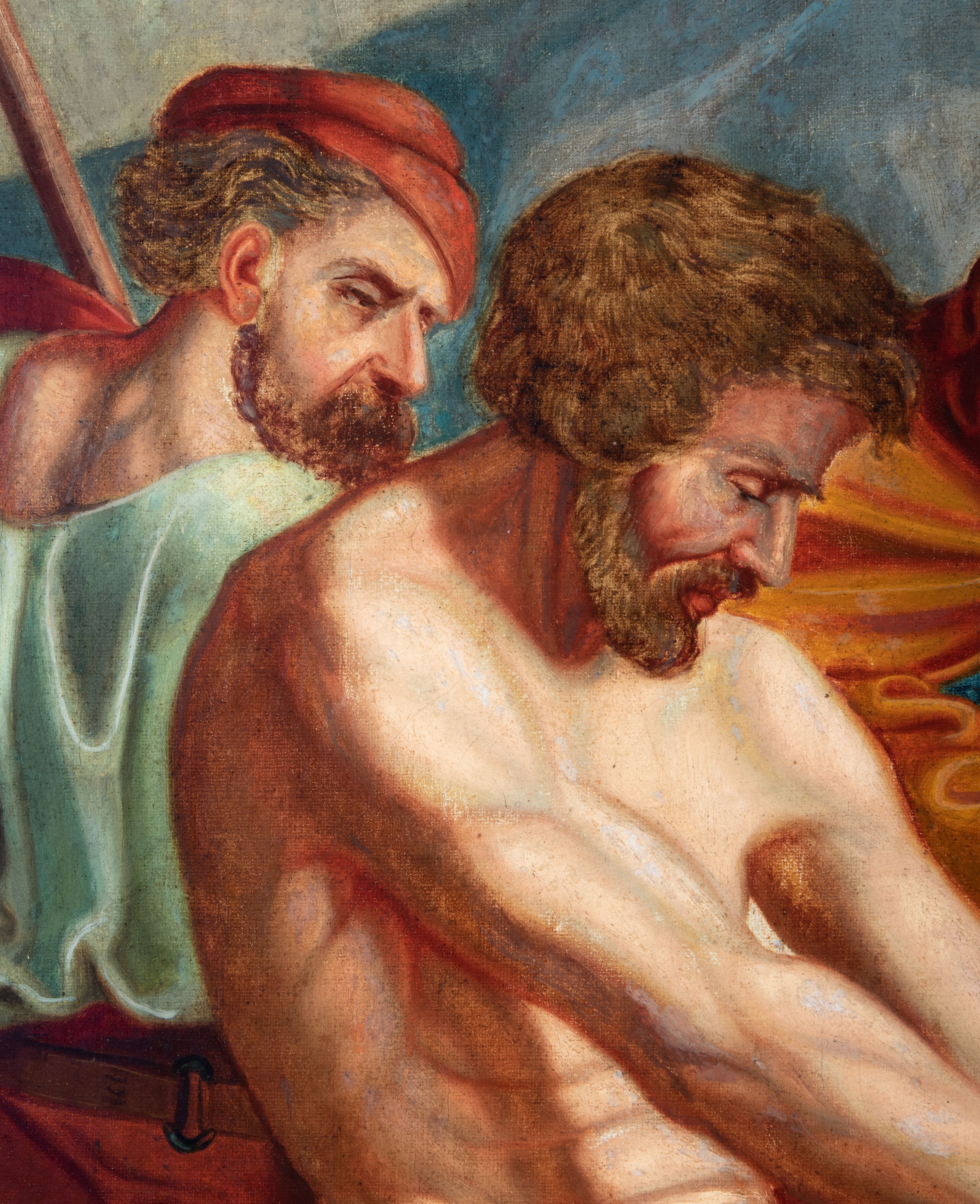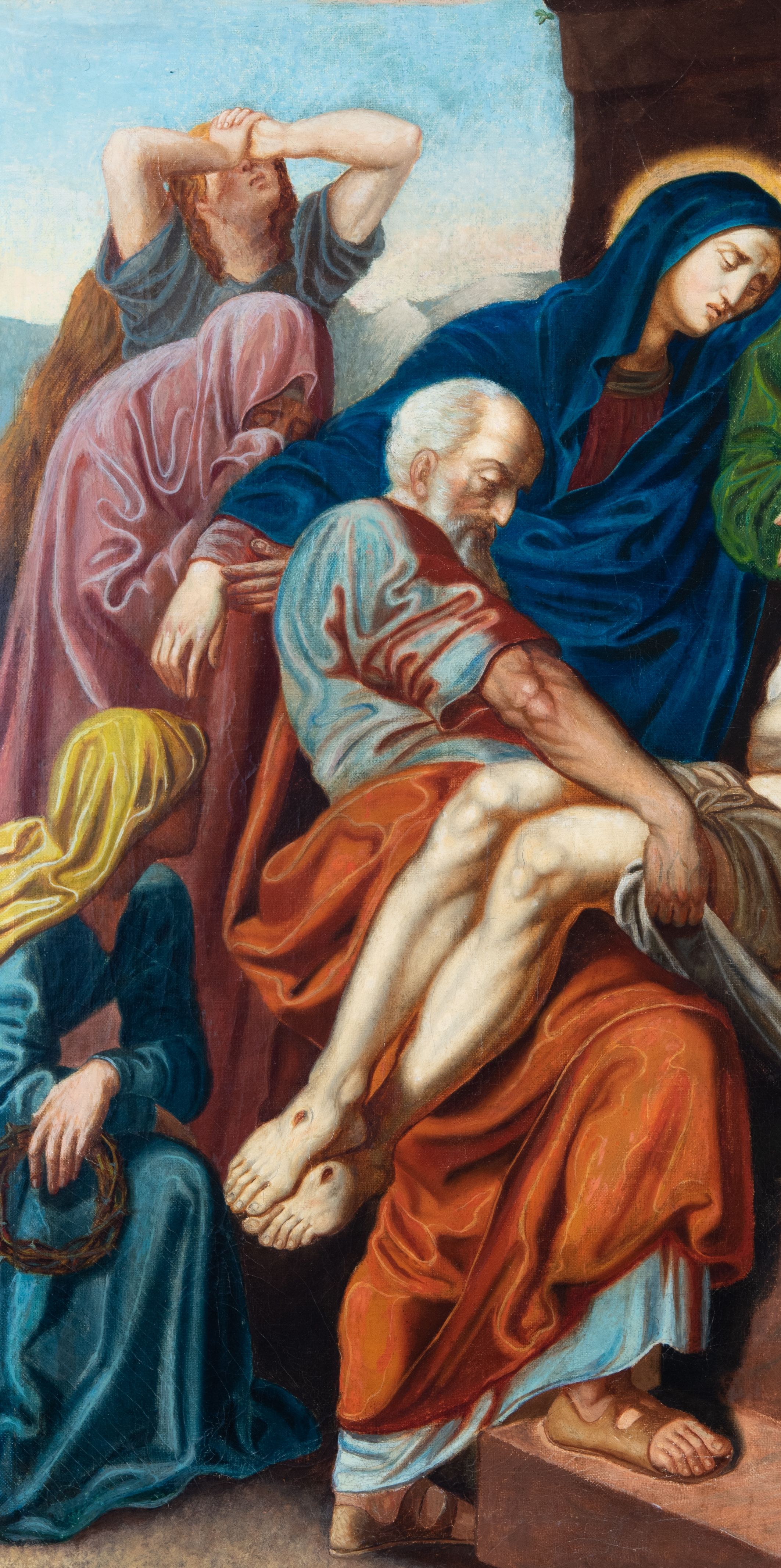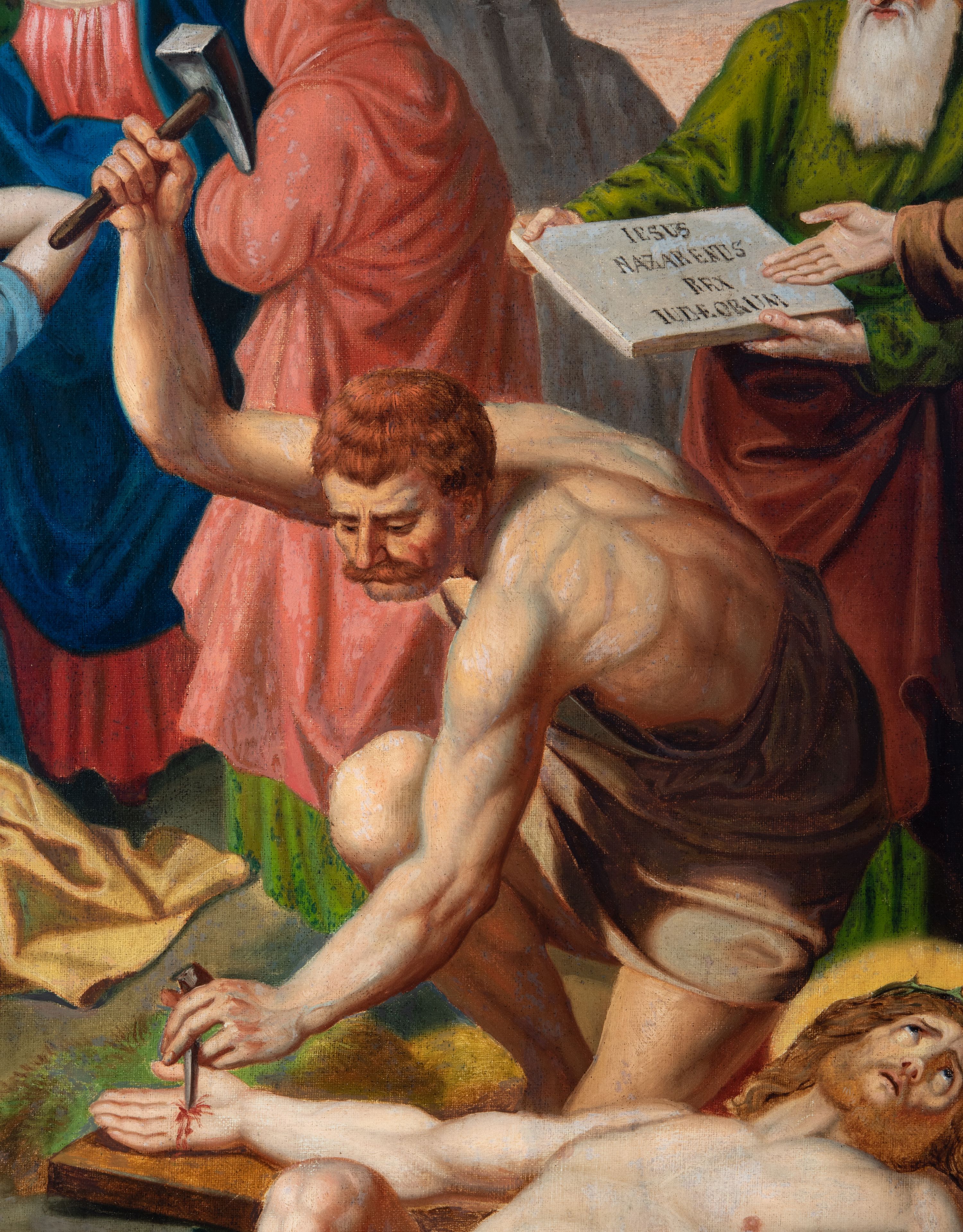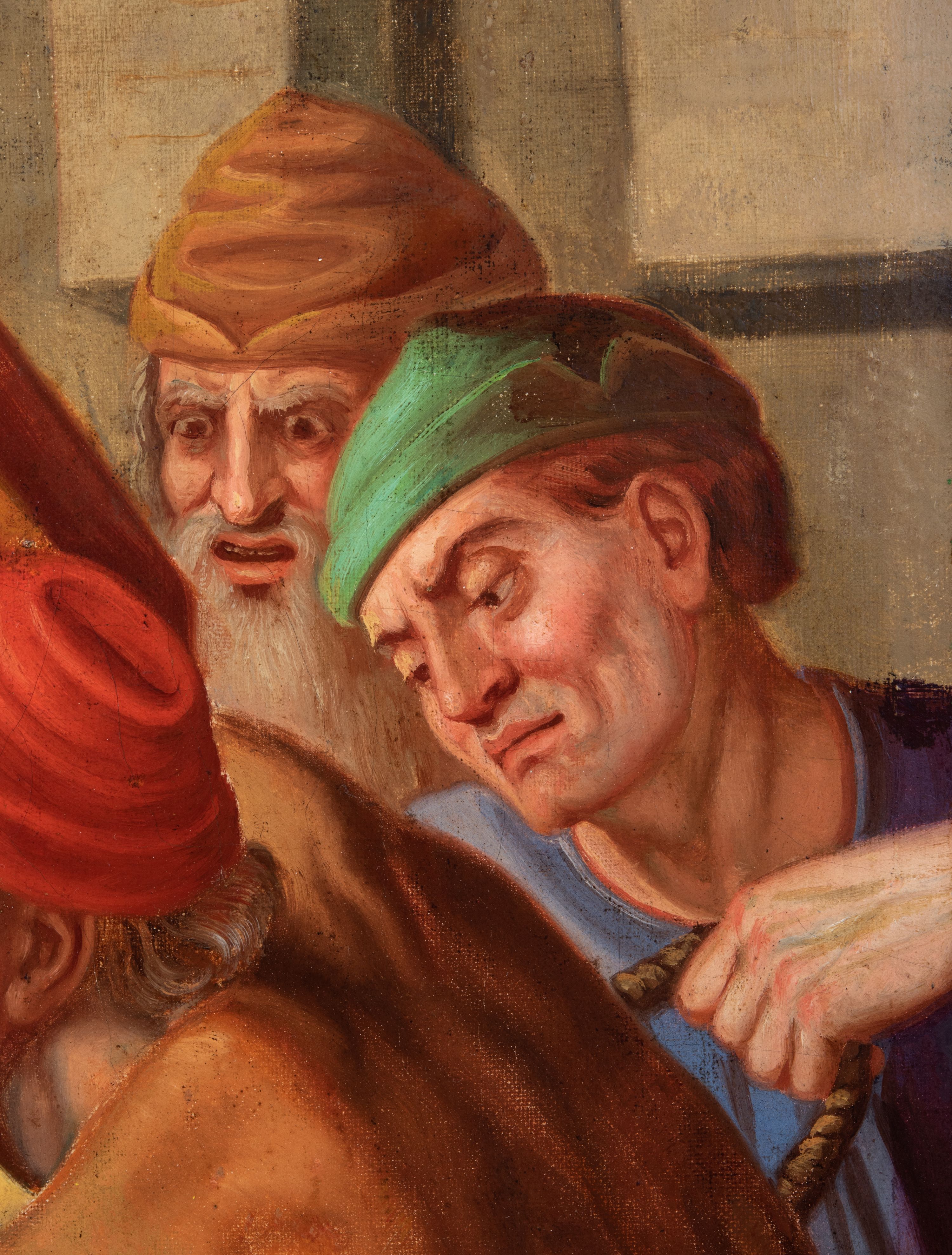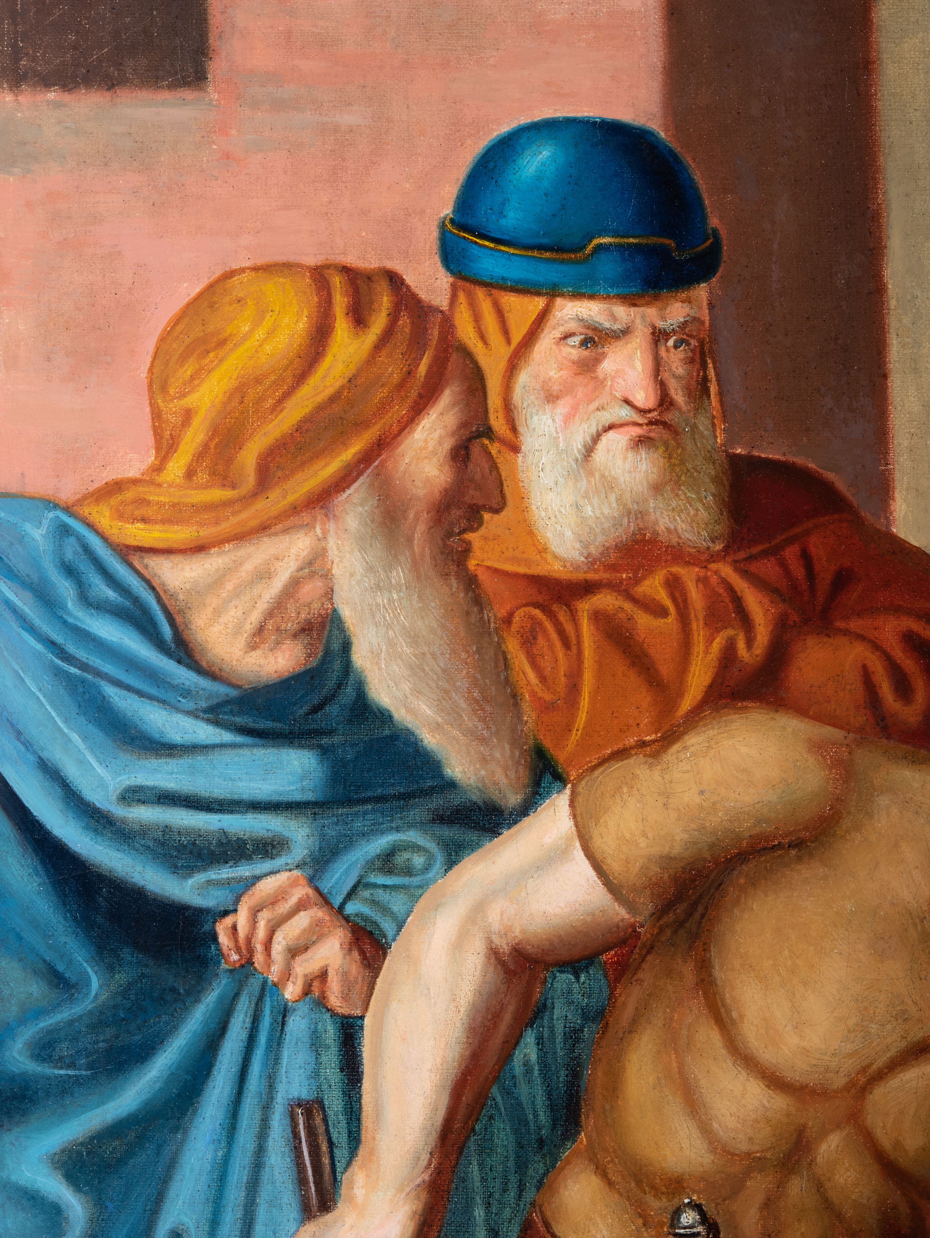 Czternaście obrazów uzyskało ten sam kształt stojącego prostokąta, obramienionego prostą, złoconą i profilowaną ramą. W polach obrazowych znalazły się wielopostaciowe kompozycje umieszczone najczęściej na tle pejzażu, ale także i architektury. Narracja każdego z obrazów skupia się na osobie Chrystusa, któremu towarzyszą inni ludzie, zgodnie z tematyką kolejnej stacji. Namalowane postacie wykonują gwałtowne i dynamiczne gesty. Na ich twarzach o jasnych karnacjach widoczne są różne emocje. Postacie ubrane są w obficie drapowane szaty o intensywnej i kontrastowej kolorystyce. Cykl przedstawia: 1) Sąd Piłata, 2) Jezus bierze krzyż na ramiona, 3) Pierwszy upadek Chrystusa, 4) Chrystus spotyka matkę, 5) Szymon z Cyreny pomaga nieść krzyż Jezusowi, 6) Weronika ociera twarz Jezusa, 7) Drugi upadek pod krzyżem Chrystusa, 8) Jezus upomina płaczące niewiasty, 9) Trzeci upadek pod krzyżem Chrystusa, 10) Obnażenie z szat Jezusa, 11) Przybicie do krzyża Chrystusa, 12) Śmierć Chrystusa na krzyżu, 13) Opłakiwanie Jezusa, 14) Złożenie Chrystusa do grobu.