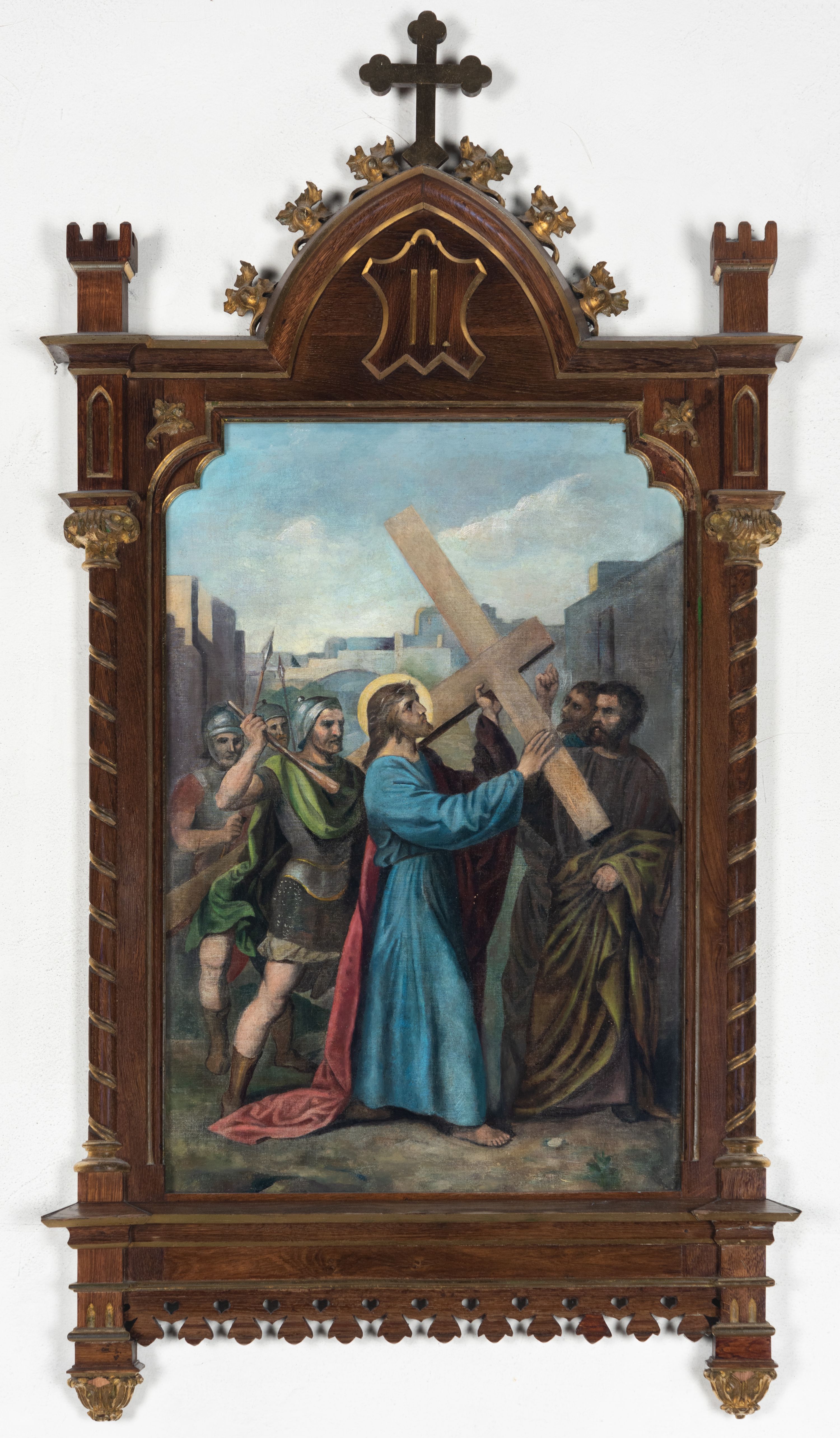 Stacje drogi krzyżowej w kształcie stojących prostokątów zamkniętych od góry łukiem trójlistnym ściętym, ujęte w ozdobne neogotyckie ramy o dekoracji architektonicznej. Pole obrazowe flankowane wąskimi kolumienkami o skręconych trzonach i akantowych kapitelach dźwigających wysokie imposty dekorowane płyciną w kształcie prostokąta zamkniętego ostrołukiem. Powyżej profilowany gzyms i wieżyczki dekorowane krenelażem. W osi ramy profilowany gzyms wyniesiony w kształt ostrołuku, dekorowany żabkami i zwieńczony złoconym krzyżem o trójlistnie zakończonych ramionach. W polu numer stacji zapisany złoconymi cyframi rzymskimi. Kompozycje malowane na płótnie, wieloosobowe umieszczone na tle pejzażu lub architektury. Kolorystyka ciemna, stonowana.