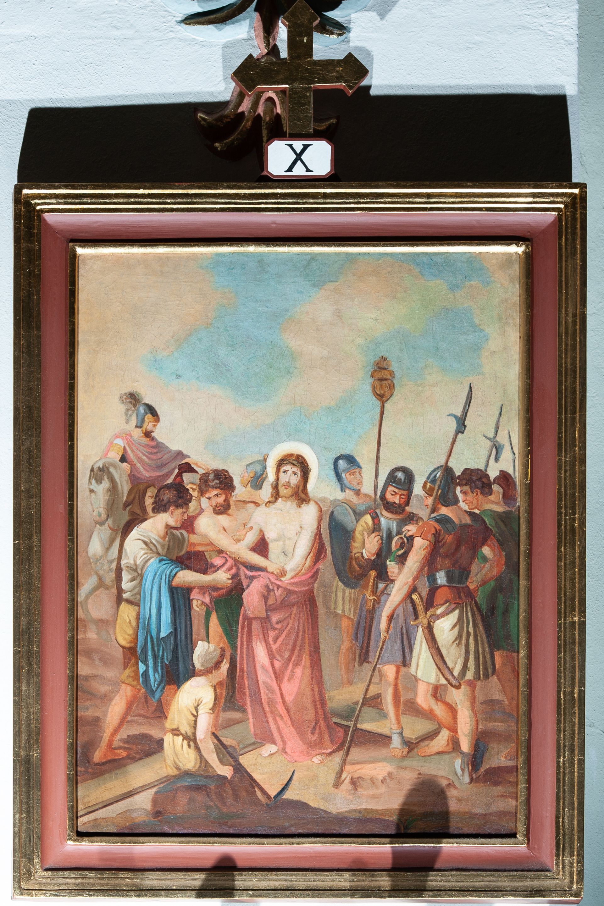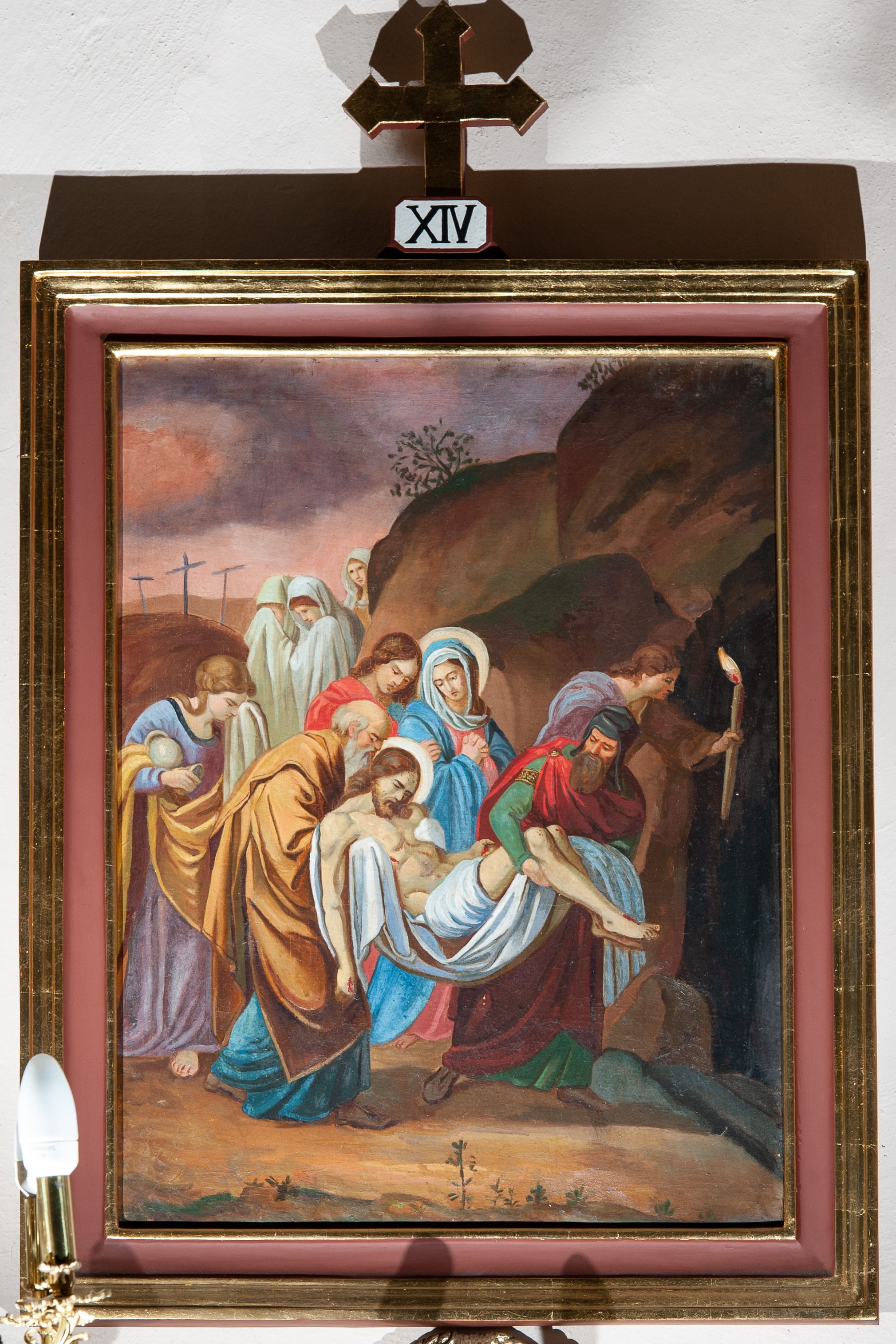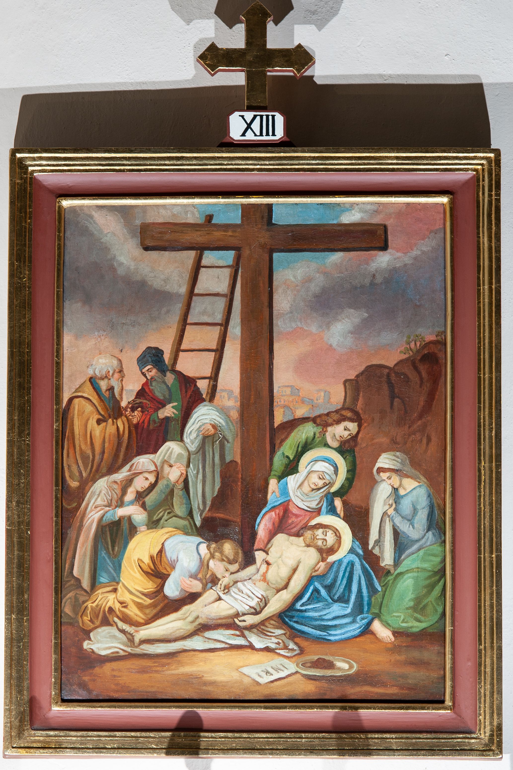 Stacje drogi krzyżowej stanowią zespół przedstawień upamiętniających przejście Chrystusa z krzyżem ulicami Jerozolimy od pretorium Piłata poprzez Golgotę, aż do śmierci na krzyżu i złożenia do grobu. Zwyczaj odprawiania drogi krzyżowej praktykowany jest od czasów wypraw krzyżowych i ma nawiązywać do 14 stacji w Jerozolimie. W XVIII wieku ustalono ostateczną ich liczbę i lokalizację. Dziewięć z nich jest poświadczonych przez Ewangelię, natomiast pozostałe są wywnioskowane z innych fragmentów Biblii i tekstów pozabiblijnych. Obrazy zostały wykonane w technice olejnej na płótnie przez nieznanego artystę.