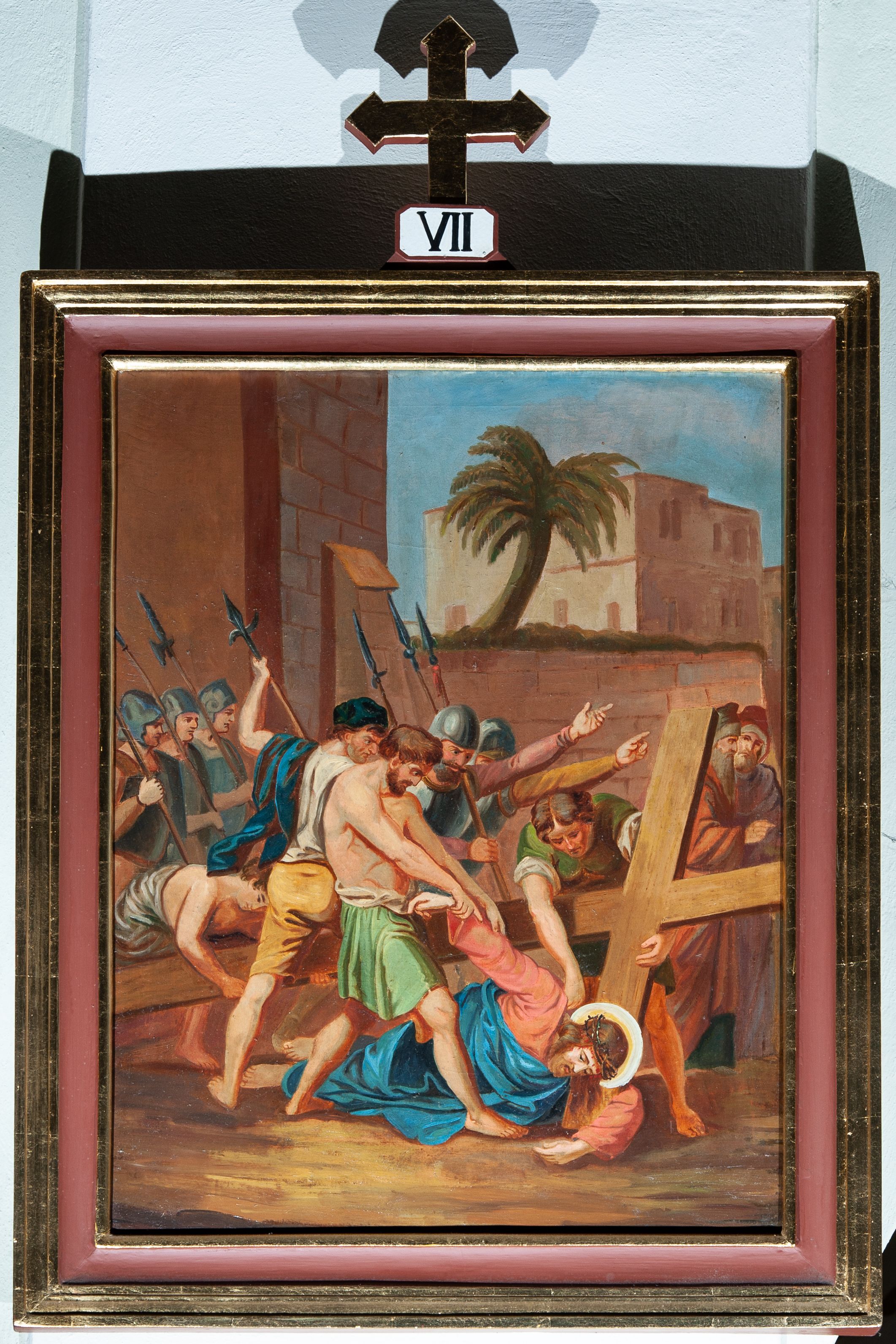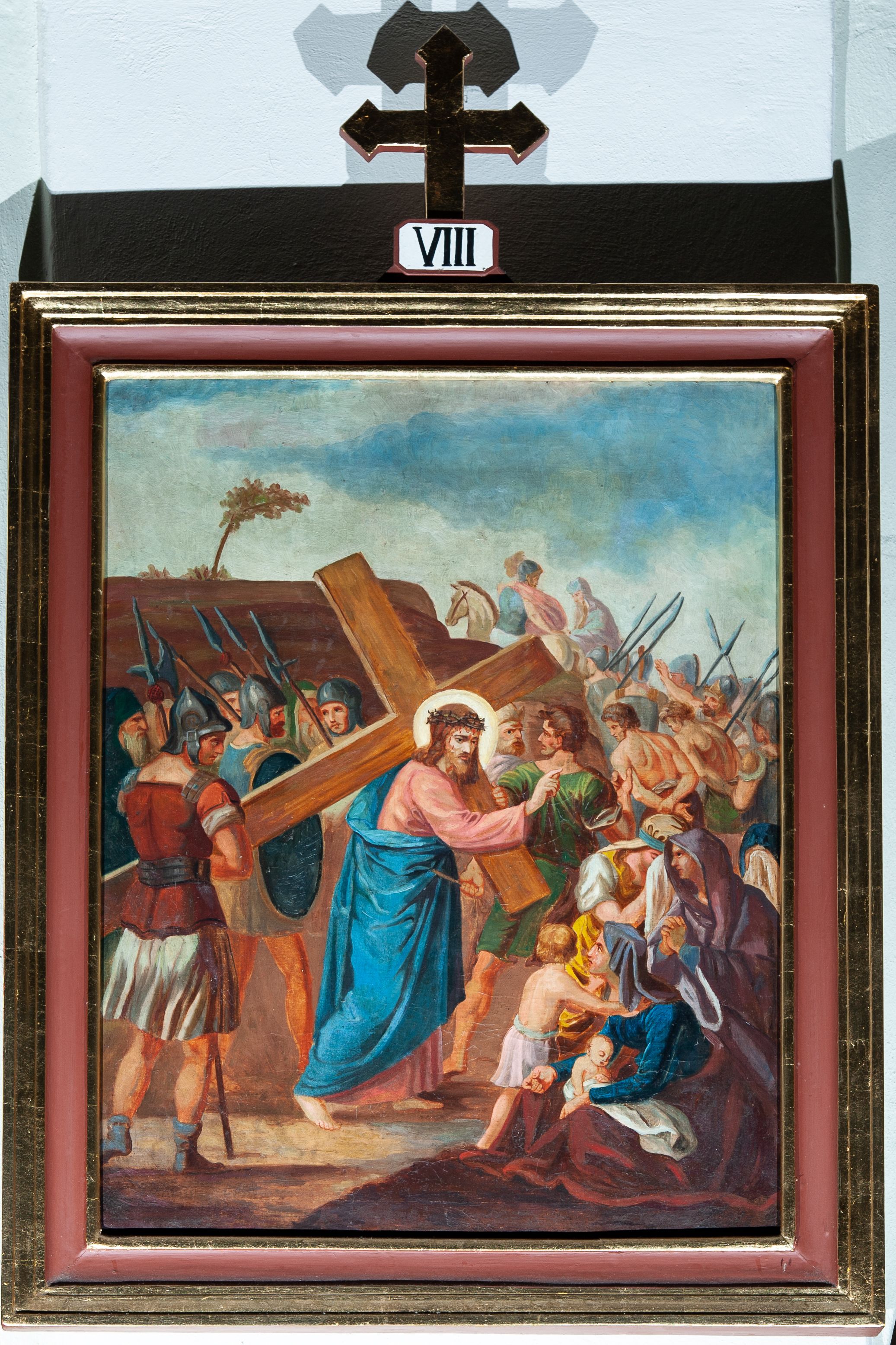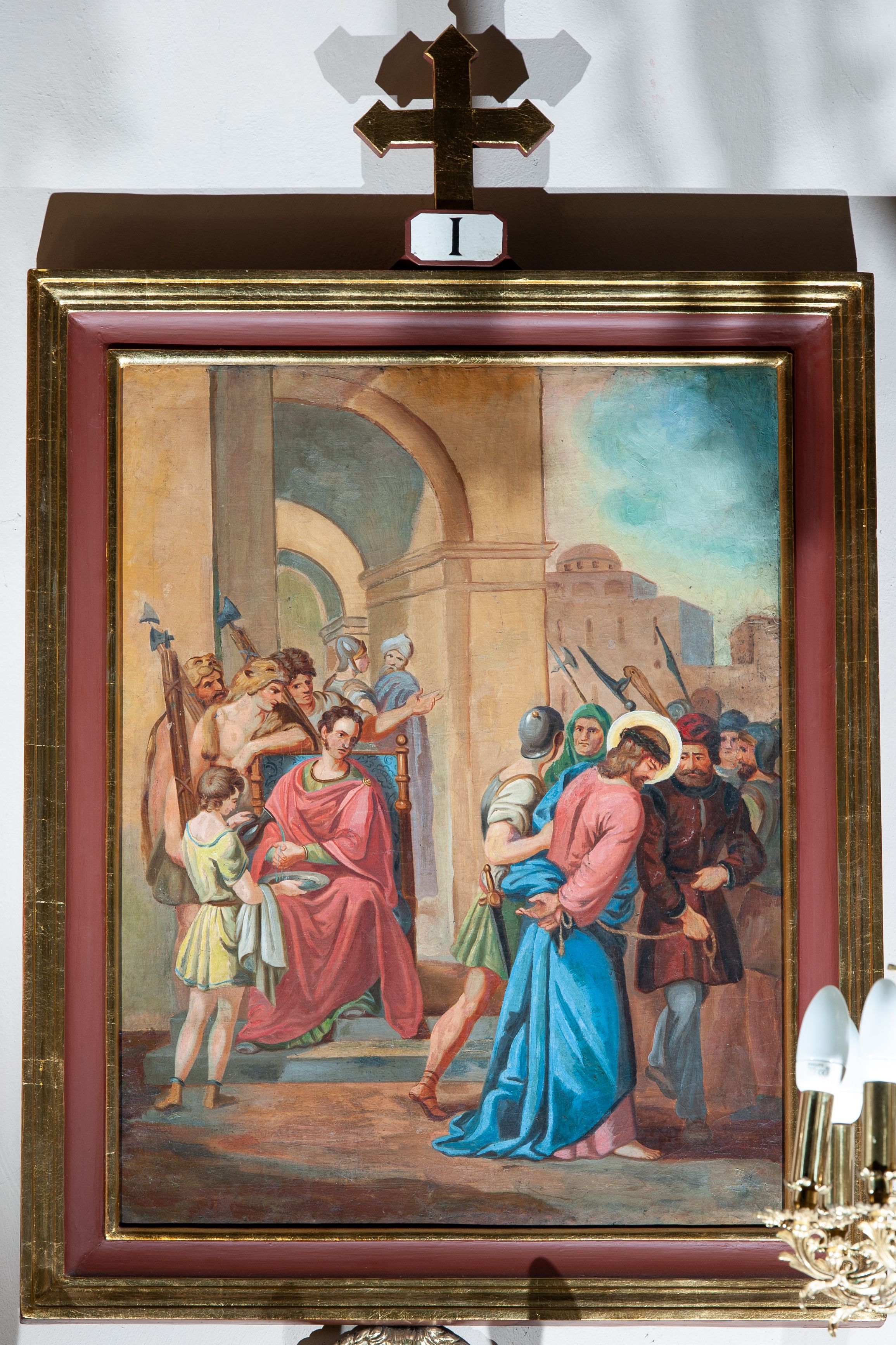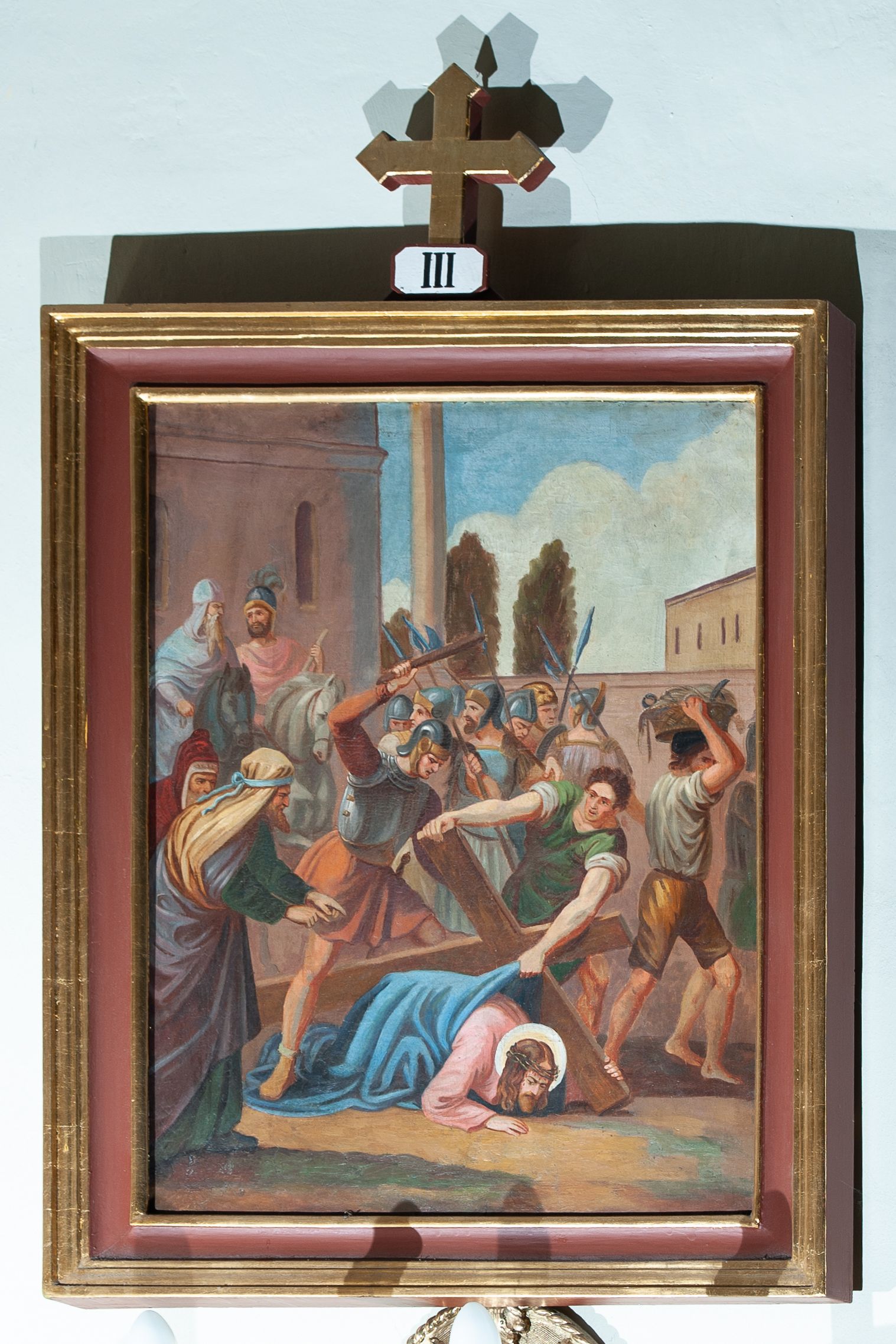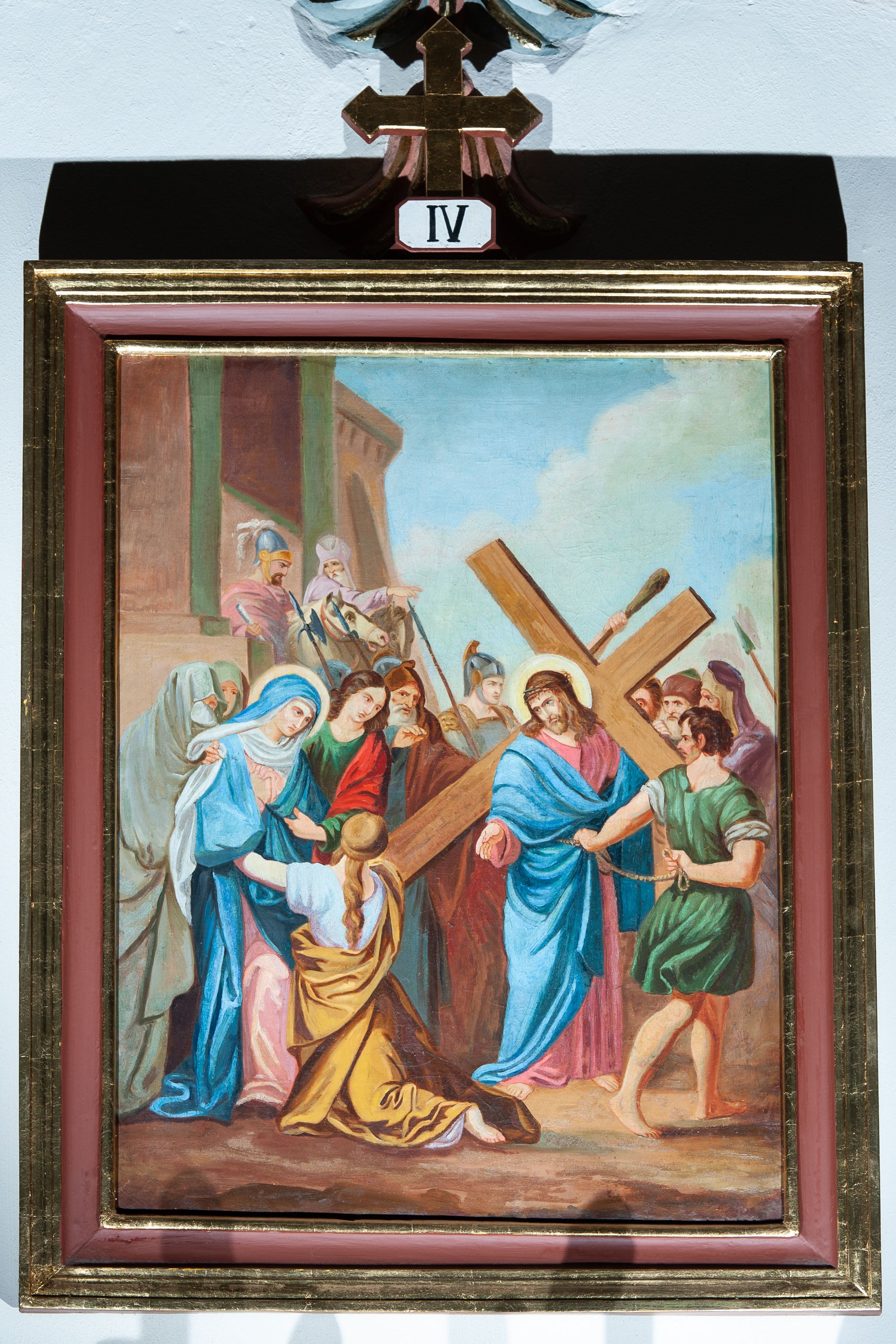 Cykl 14 obrazów w formie stojącego prostokąta w drewnianych, profilowanych i złoconych ramach. Od góry ujęte prostokątną, małą płyciną, w której polu są malowane rzymskie numery stacji, zwieńczone krzyżem. Kompozycje kadrowane w kilkupostaciowe sceny na tle błękitno-brunatnego nieba lub architektury. Postacie malowane intensywnymi, kontrastowymi plamami barwnymi; twarze o delikatnie zaznaczonych rysach, ubrane w obszerne szaty, miękko kształtowane silnym światłocieniem. Chrystus ubrany jest w różową suknię i niebieski płaszcz.