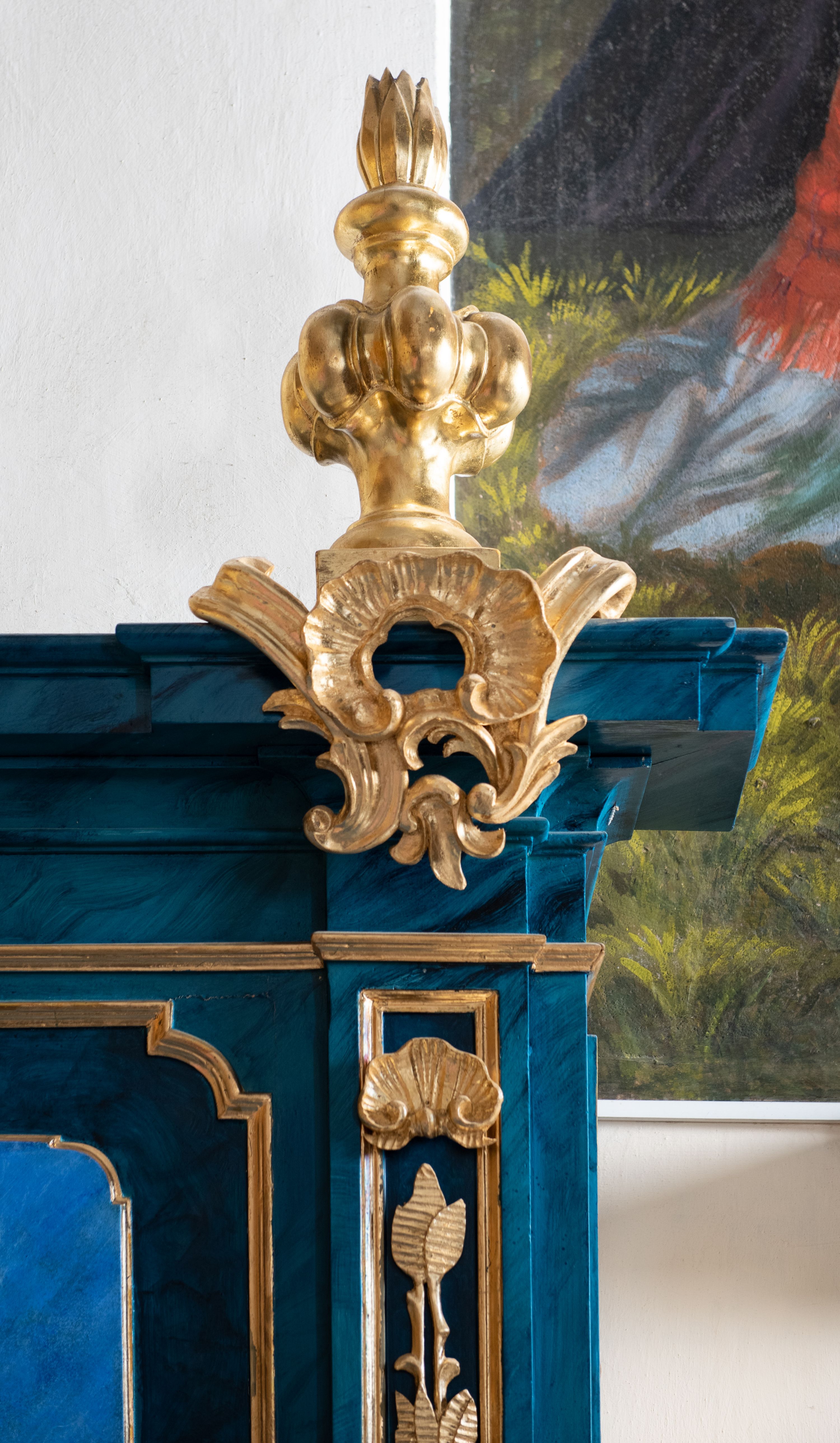 Dwie stalle bez obudowy i wysokich zaplecków na falistych nogach, z których zewnętrzne poprzedzone lwimi łapami, z falistymi poręczami i prostymi oparciami zwieńczonymi gzymsem. Oparcie podzielone na trzy pola oddzielone żłobkowaniami i rautami nad nimi i wypełnione profilowanymi, kwadratowymi płycinami o ściętych ćwierćkoliście narożach.
