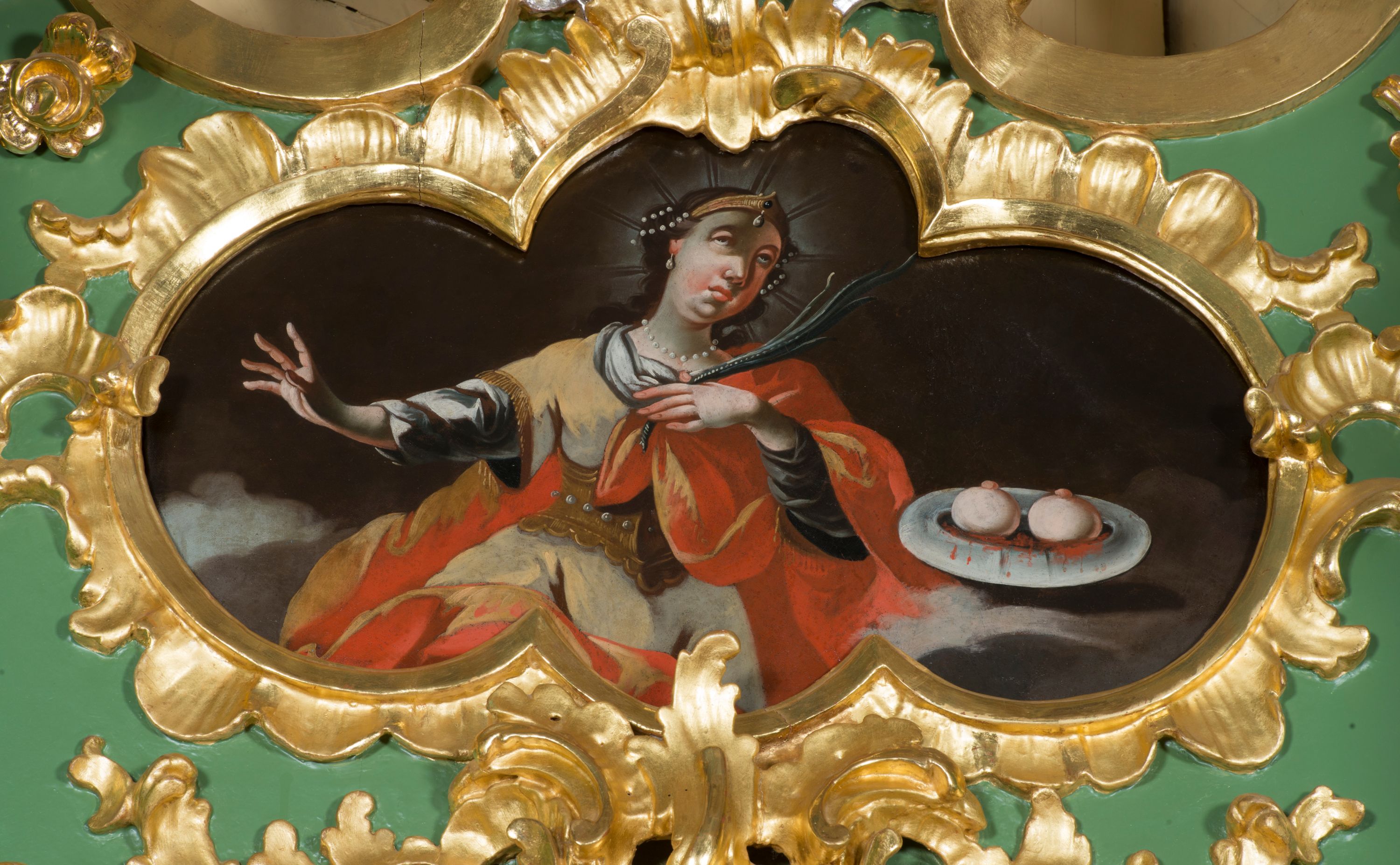 Obraz w kształcie czworoliścia z wizerunkiem św. Agaty ukazanej w półpostaci, frontalnie. Święta spogląda w górę, prawą rękę ma odwiedzioną do boku, w lewej, złożonej na piersi trzyma palmę męczeństwa. Ma pociągłą twarz, z głęboko osadzonymi oczami, długim nosem, mięsistymi ustami i odznaczającym się podbródkiem. W ciemne, długie włosy ma wplecione sznury pereł, na głowie diadem, wokół promieniejący nimb. Jest ubrana w spodnią niebieską suknię z dłuższymi rękawami i wierzchnią, białą, lamowaną złotem. Na to ma nałożony złoty gorset zdobiony perłami i zarzucony czerwony płaszcz, który obszernymi fałdami owija się wokół nóg, pleców oraz przechodzi przez lewą rękę. Po jej lewej stronie, na chmurach, unosi się misa z dwiema obciętymi, krwawiącymi piersiami. Świętą ukazano na tle brunatnego nieba, z szarymi obłokami w dolnej części płótna.