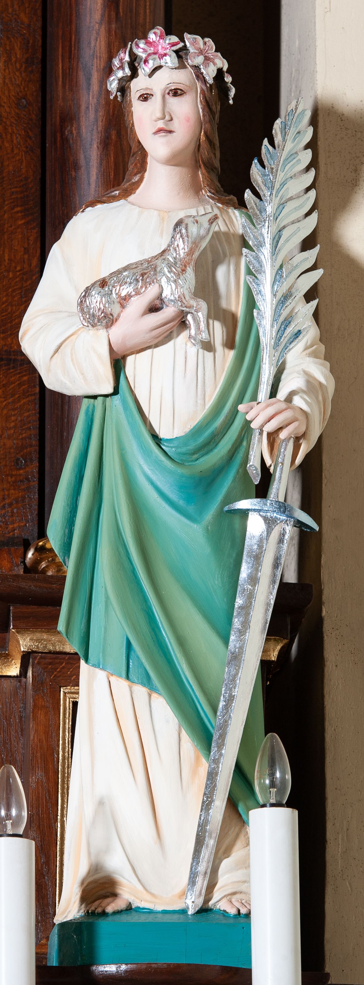 Figura pełna na cokole przedstawiająca św. Agnieszkę, która stoi frontalnie, kierując wzrok lekko w prawo. Ma owalną twarz, małe oczy, szeroki nos i małe usta oraz długie, falowane włosy, które opadają na ramiona i plecy; na głowie wianek z lilii. Prawą, uniesioną ręką przytrzymuje baranka, wyciągającego pyszczek w stronę liścia palmowego, który święta, razem z mieczem trzyma w lewej dłoni. Jest ubrana w białą suknię marszczoną pod szyją oraz zielony płaszcz przechodzący przez lewy bark i przytrzymany prawą ręką ponad biodrem. Polichromia w partiach ciała naturalistyczna.