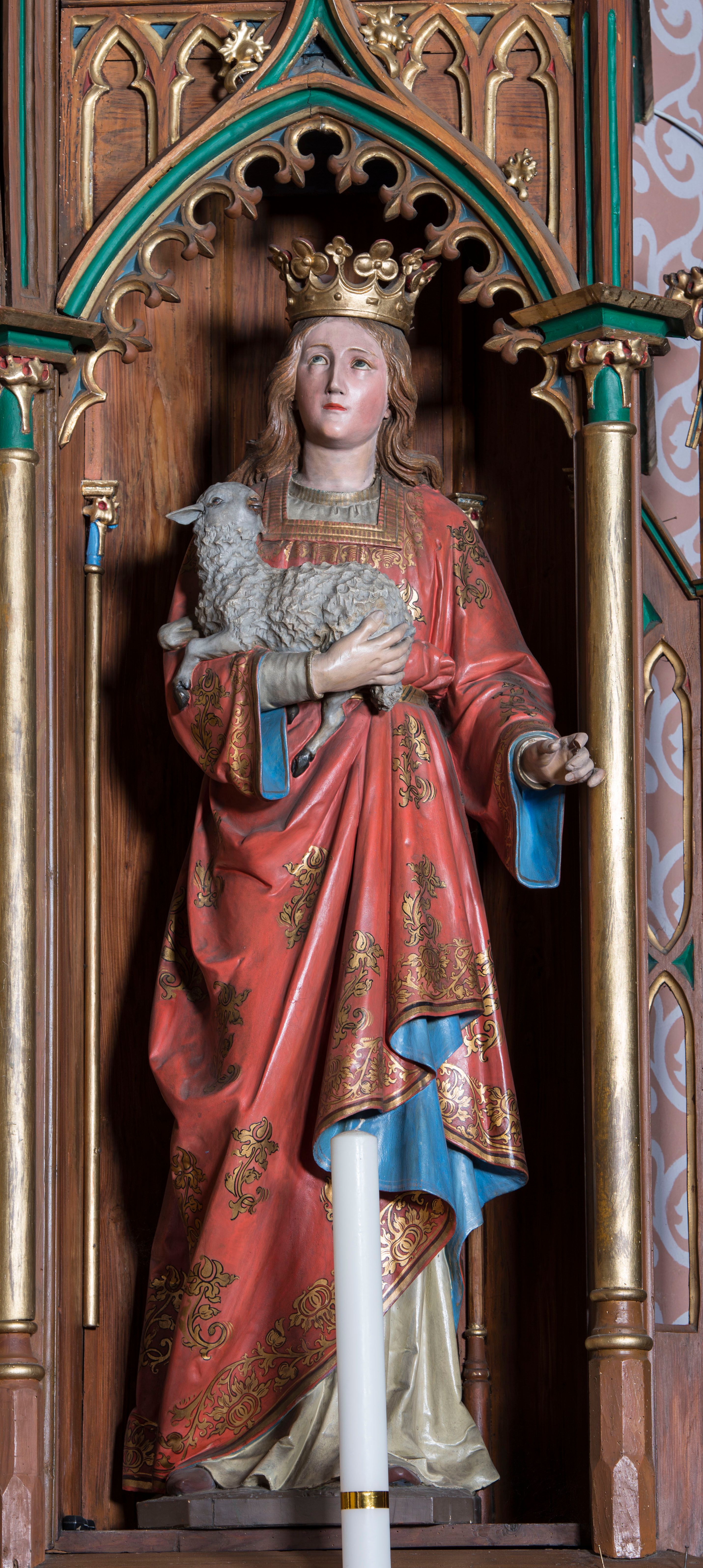 Święta Agnieszka była Rzymianką, która na początku IV wieku poniosła śmierć męczeńską w wieku 12 lat. Trzymany przez nią na rękach baranek nawiązuje do etymologii imienia (agnus – baranek) oraz jest symbolem czystości. Jest również odwołaniem do opowieści, według której św. Agnieszka miała w ósmym dniu po śmierci pokazać się swoim rodzicom, trzymając baranka. W legendach o świętej przekazano również inną wersję genezy jej atrybutu. Agnieszka miała ofiarować papieżowi wełnę, z której został utkany paliusz. Widoczna na jej głowie korona może być symbolem dziewictwa oraz męczeństwa.