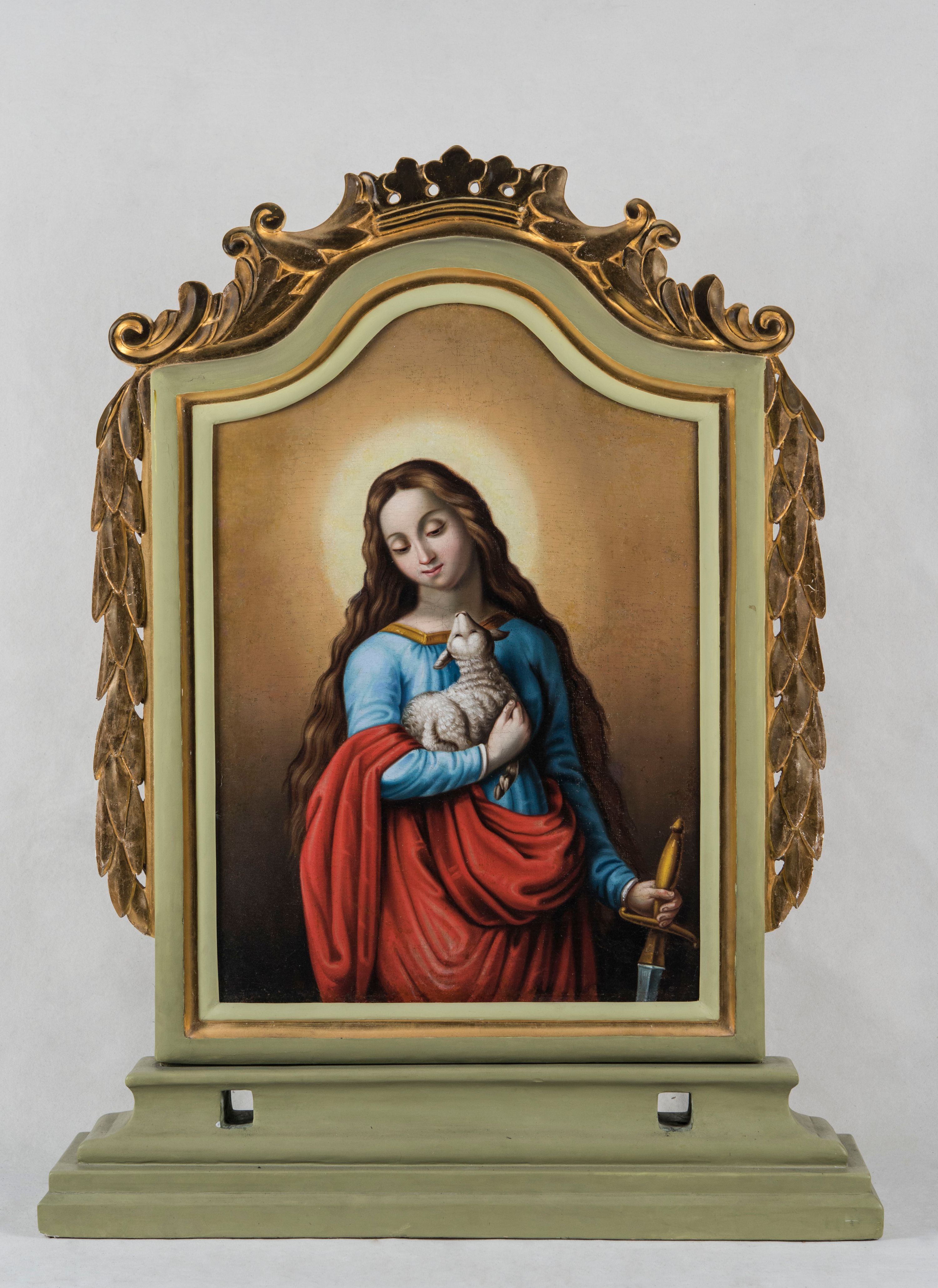 Awers feretronu zajmuje półpostaciowy wizerunek św. Agnieszki. Należała ona do grona pierwszych męczenników za wiarę żyjących na przełomie III i IV wieku. Wywodziła się z rzymskiej arystokracji, niezainteresowana licznymi propozycjami małżeństwa twierdziła, iż swoje serce oddała już pewnemu wybrankowi. Gdy odrzuciła syna prefekta Semproniusza wydano na nią wyrok śmierci, który został zmieniony na umieszczenie w domu publicznym. Agnieszka zrażała jednak mężczyzn swą nieprzystępnością i uporem. W końcu miała zginąć na stosie, który jednak nie zapłonął. Ostatecznie dwunastoletnia Agnieszka została ścięta mieczem 21 stycznia na stadionie Domicjana. Kult św. Agnieszki istniał już w IV wieku, w miejscu jej męczeństwa wzniesiono kościół Sant’Agnese in Agone. Obecnie miejsce, w którym znajduje się ta przebudowana przez znakomitego architekta barokowego Francesca Borrominiego świątynia, nosi nazwę Piazza Navona. Święta Agnieszka bywa ukazywana z mieczem w dłoni, odnoszącym się do jej śmierci męczeńskiej, jednak głównym atrybutem świętej jest symbolizująca czystość owieczka lub nawiązujący do jej imienia (łac. agnus) baranek. Poświęcone w dniu wspomnienia św. Agnieszki 21 stycznia w Rzymie dwa baranki ofiarowywane są papieżowi, z ich wełny tkane są paliusze.