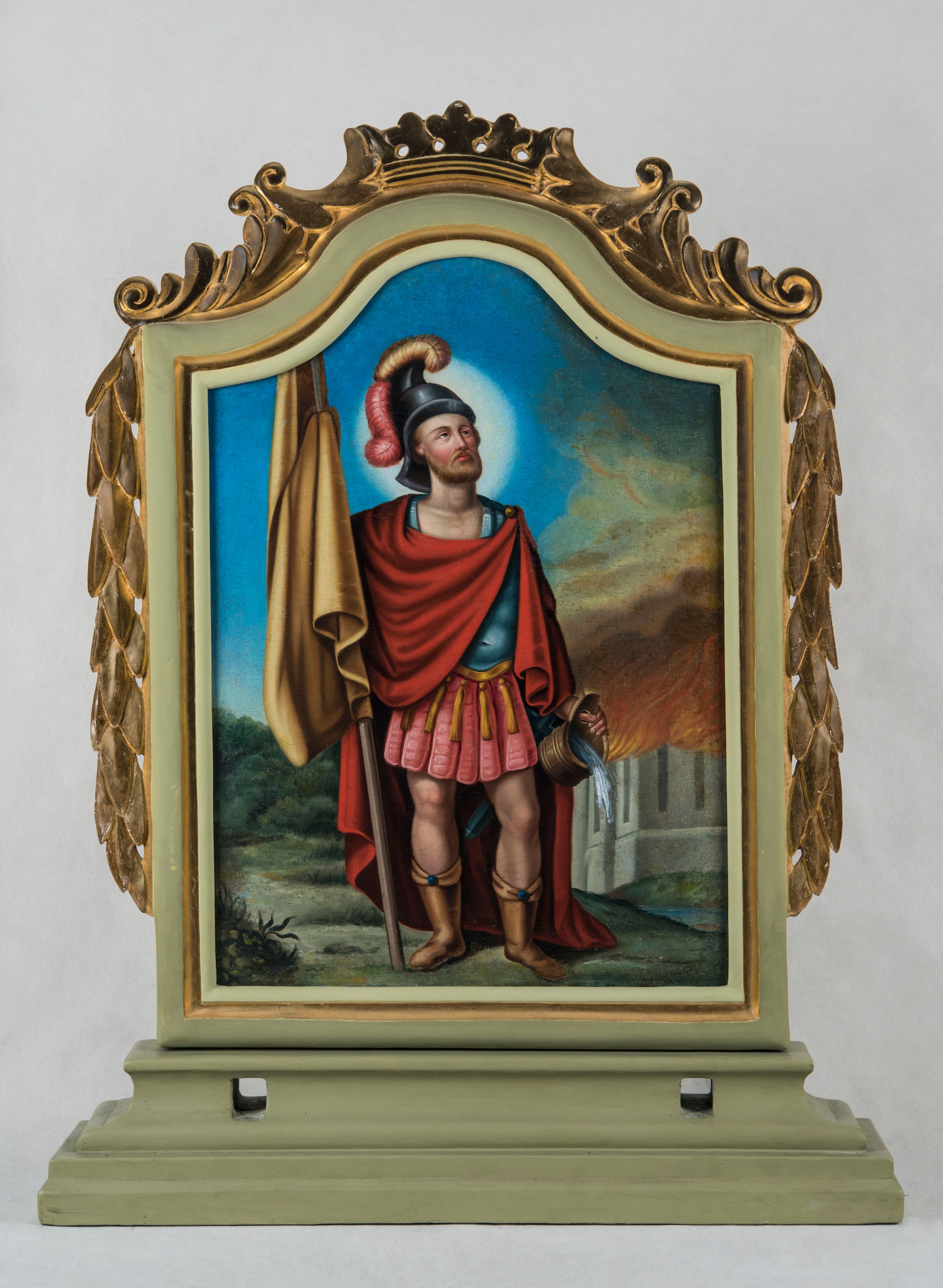 Na rewersie feretronu znajduje się wizerunek św. Floriana żyjącego na przełomie III i IV wieku w Ceti (obecnie Dolna Austria). Jako młodzieniec został powołany do rzymskiej armii dowodzonej przez cesarza Dioklecjana, wielkiego prześladowcy chrześcijan. W 304 roku Florian miał wstawić się za ciemiężonymi legionistami chrześcijańskimi, za co poniósł męczeńską śmierć utopiony w rzece Enns. Ukazany pośród obłoków, w zbroi rzymskiego legionisty, święty w lewej dłoni trzyma niewielki cebrzyk, z którego wylewa wodę na płonący dom. Atrybut ten odnosi się do legendy, wedle której miał jednym wiadrem ugasić pożar płonącej wsi. Święty Florian patronuje zawodom związanym z ogniem - strażakom, hutnikom, kominiarzom, piekarzom czy garncarzom. W 1436 roku ustanowiono go jednym czterech głównych patronów Królestwa Polskiego.