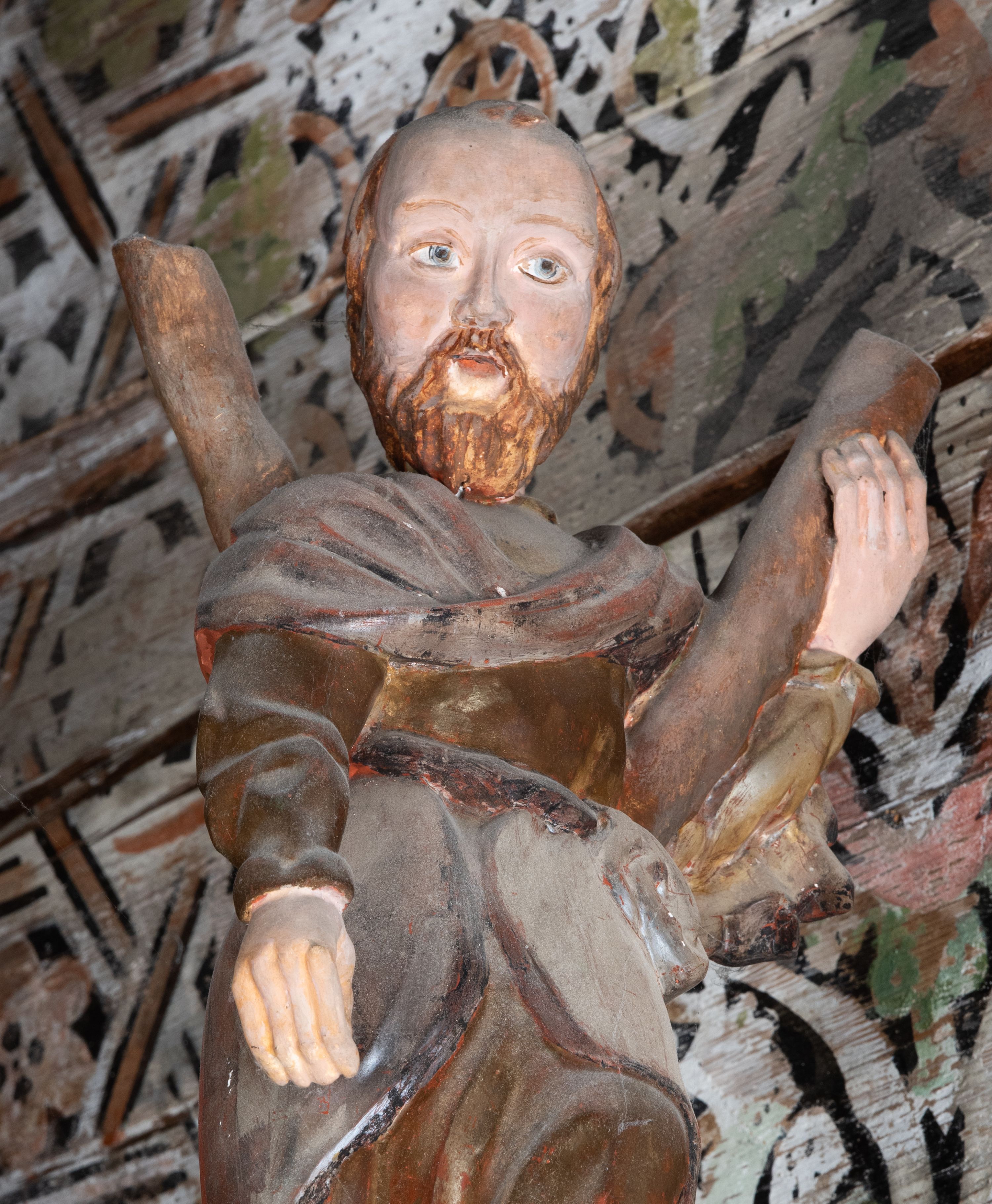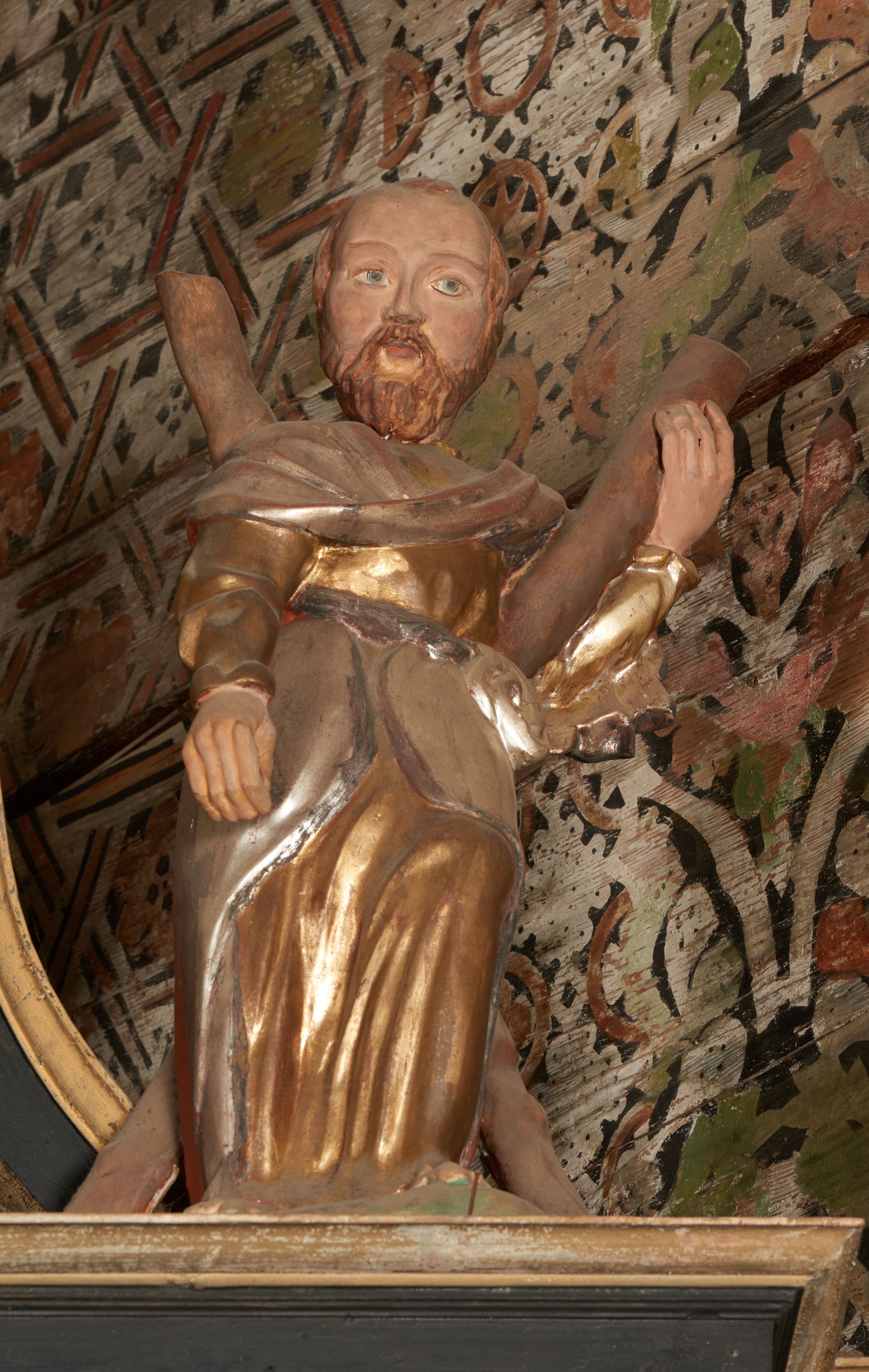 Całopostaciowe przedstawienie św. Andrzeja Apostoła, opierającego się o krzyż w kształcie litery x (narzędzie męczeńskiej śmierci). Święty ubrany w złoconą tunikę i srebrny płaszcz.