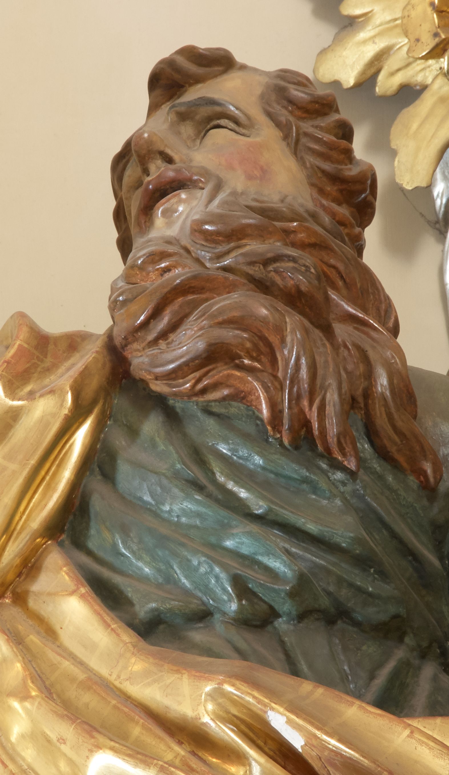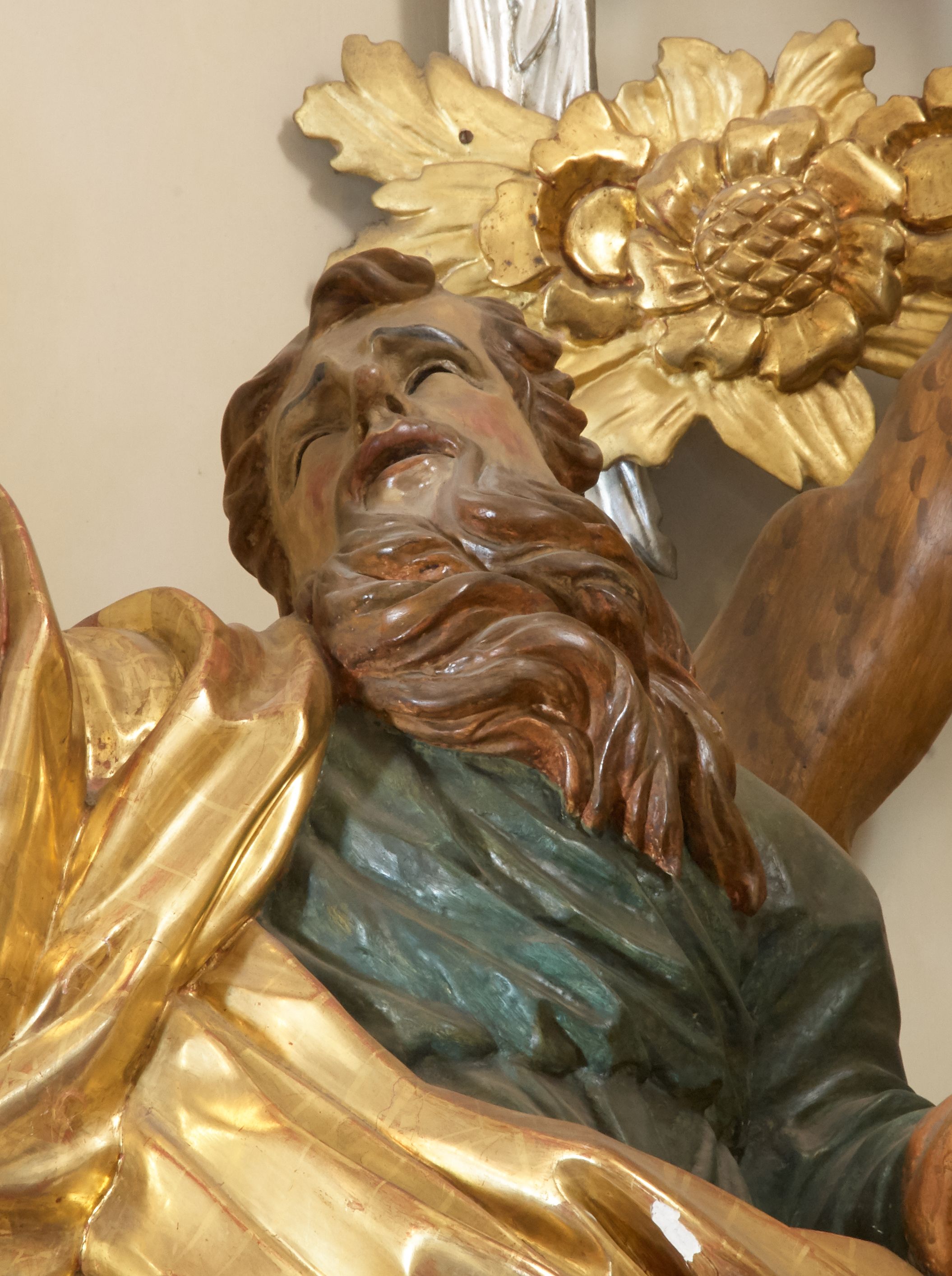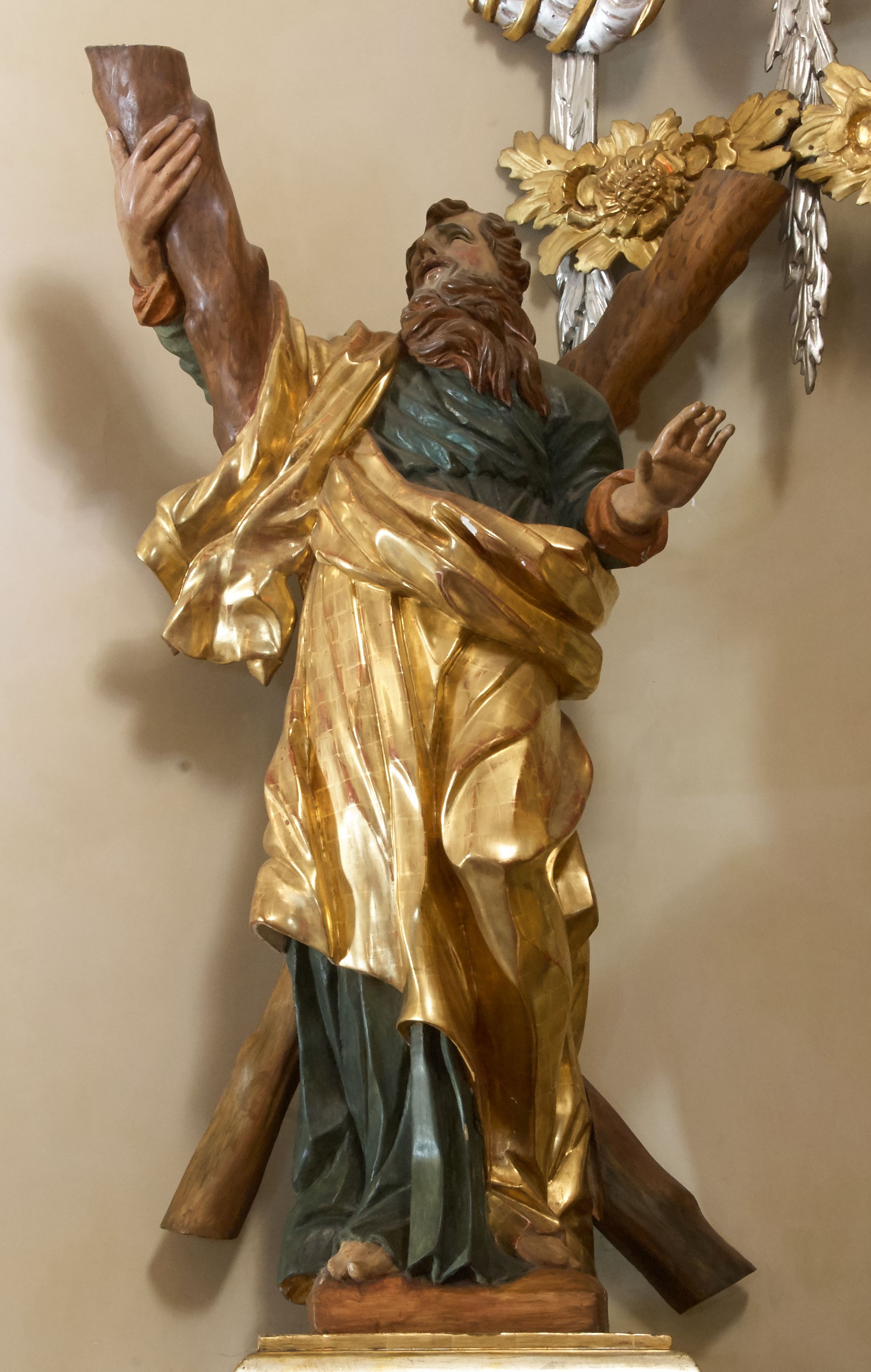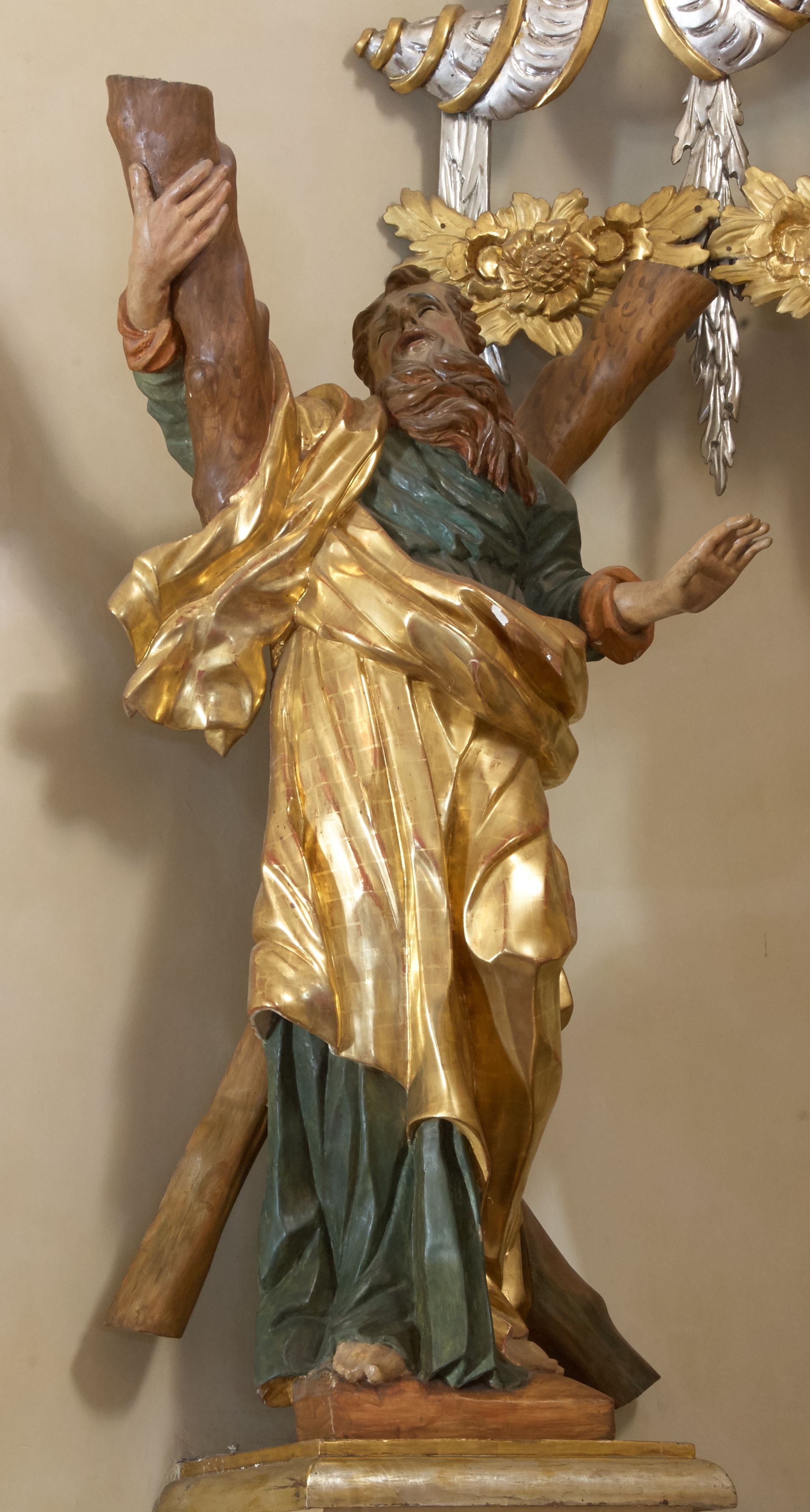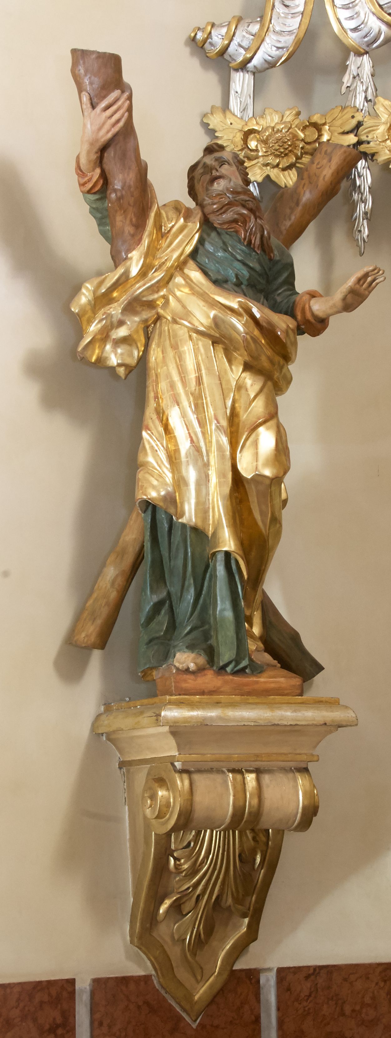 Święty został ukazany całopostaciowo, frontalnie, w kontrapoście, prawą ręką obejmuje belkę swojego krzyża. Jest ubrany w zieloną suknię sięgającą stóp i złoty płaszcz przerzucony przez prawe ramię i osłaniający do kolan korpus świętego. Głowę ma wzniesioną ku górze, okoloną długą, falującą brodą, z wydatnymi zakolami, otwartymi oczami i ustami.