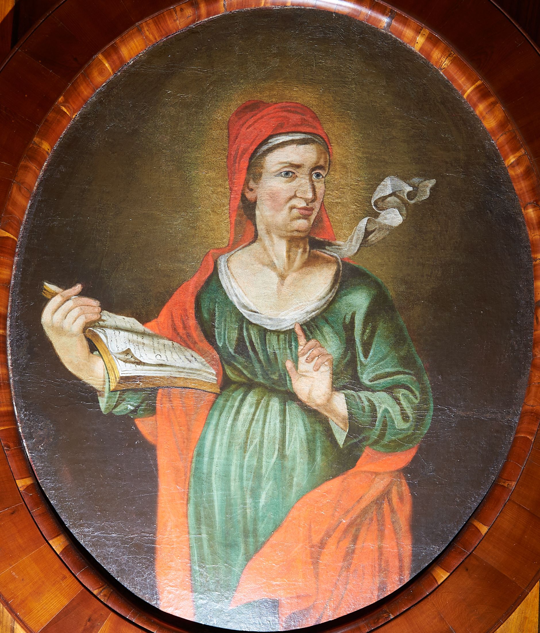 Obraz w kształcie stojącego owalu, przedstawiający św. Annę. Święta ukazana w centrum kompozycji, do wysokości kolan, z głową skierowaną w lewą stronę. W prawej dłoni trzyma otwartą księgę, a lewą rękę unosi z wyprostowanym palcem wskazującym, czyniąc gest nauczania. Twarz o długim, prostym nosie, wąskich ustach z silnie podkreśloną linią szyi. Oczy migdałowe, niebieskie, nad nimi proste ciemne brwi. Święta ubrana jest w z zieloną suknię, przewiązaną pod biustem, białą chustę oraz czerwony płaszcz założony na głowę. Tło ciemnobrązowe, rozświetlone wokół głowy świętej. Rama drewniana, fornirowana, politurowana.