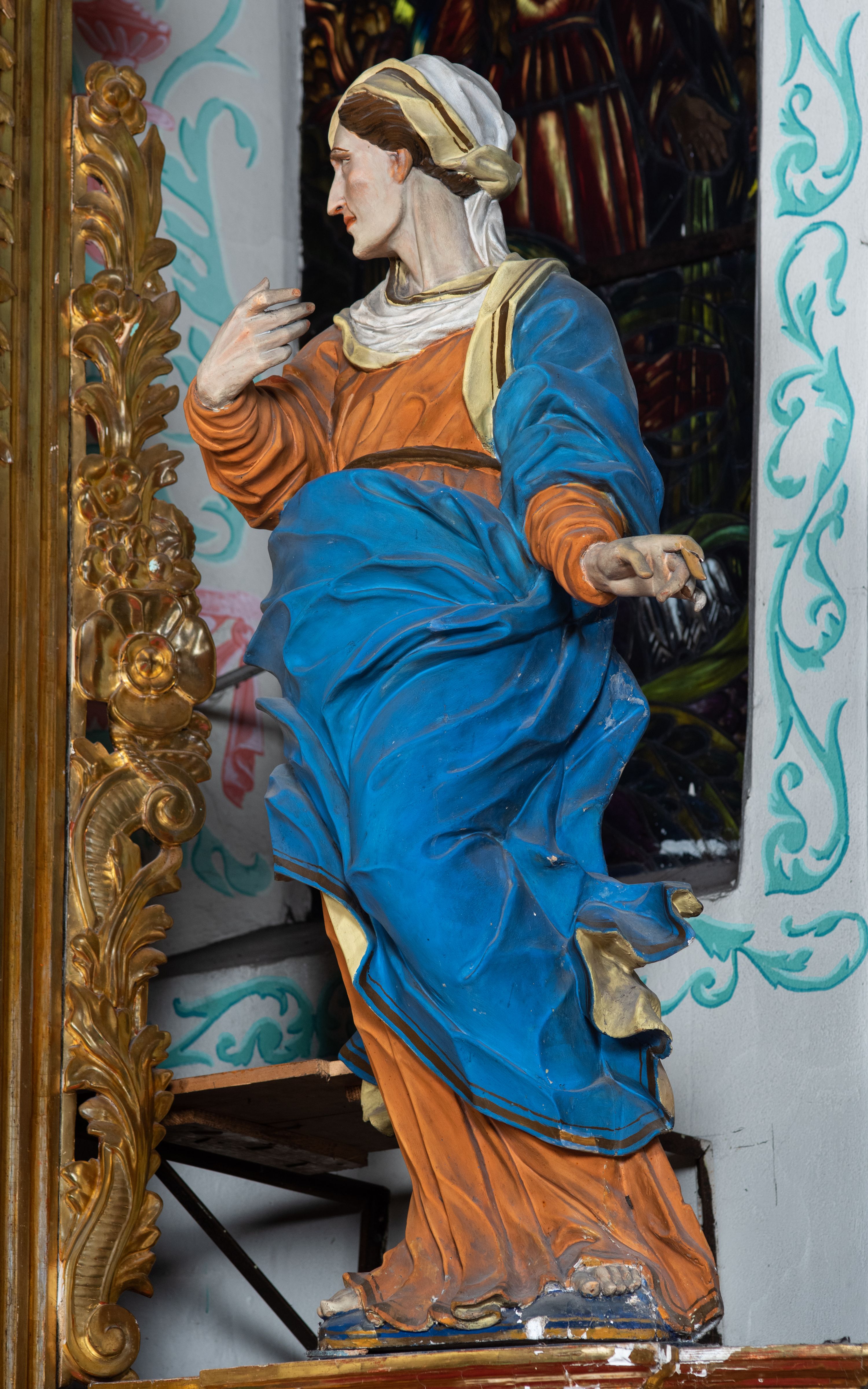 Rzeźba ścięta z tyłu i drążona. Święta zwrócona w trzech czwartych w prawo, w kontrapoście, na bosych stopach. Prawą, ugiętą rękę unosi na tle piersi, lewą wyciąga w bok. Twarz ma szczupłą, o migdałowatych oczach skierowanych w górę, ostrym profilu nosa i wąskich ustach, okoloną brązowymi, falowanymi włosami, ukrytymi pod welonem. Ubrana jest w jasnoróżową, silnie drapowaną suknię przepasaną w biodrze oraz niebieski płaszcz z czerwoną lamówką zawinięty wokół lewego ramienia i ciała świętej, silnie drapowany, ekspresyjnie rozwiany od dołu. Na głowie ma biały welon, odsłaniający profil twarzy, zawinięty wokół u szyi. Polichromia ciała naturalistyczna.