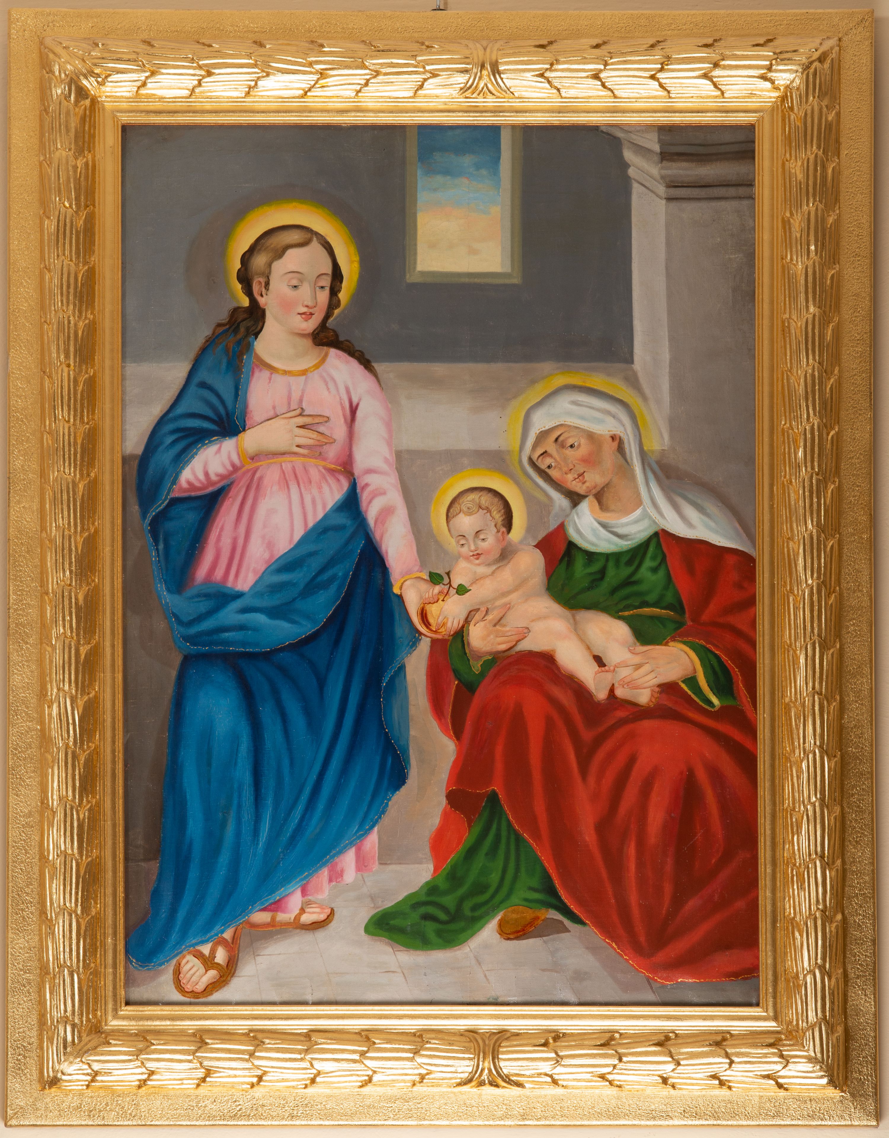 Obraz przedstawia siedzącą frontalnie św. Annę z Jezusem na kolanach i stojącą obok Matką Boską. Św. Anna ubrana w zieloną suknię i czerwony płaszcz, na głowie biały welon. Twarz św. Anny o wyostrzonych rysach, z niskim czołem, długim prostym nosem i wąskimi, drobnymi ustami, z silnie zaznaczonymi brwiami i rumieńcami na policzkach. Nagie Dzieciątko o okrągłej twarzy z krótkimi brązowymi włosami, przytrzymuje z lewą ręką jabłko podawane przez Marię. Matka Boska ukazana frontalnie, w całej postaci w kontrapoście, z prawą nogą wysuniętą do przodu i prawą ręką opartą na piersi, z lewą opuszczoną. Maria ubrana w różową, plisowaną suknię przepasaną na biodrach i niebieski płaszcz okrywający prawe ramię i dolną część ciała. Twarz oddana szkicowo z prostym nosem, delikatnymi oczami, wąskimi pełnymi wargami, włosy brązowe, długie opadające na ramiona. Wokół głów postaci świetliste nimby. Postacie ukazane wewnątrz nieokreślonego pomieszczenia z perspektywicznie oddaną posadzką, z oknem na osi. Rama drewniana, profilowana, z nałożonym motywem wieńca z liści laurowych z masy gipsowej, złocona.