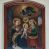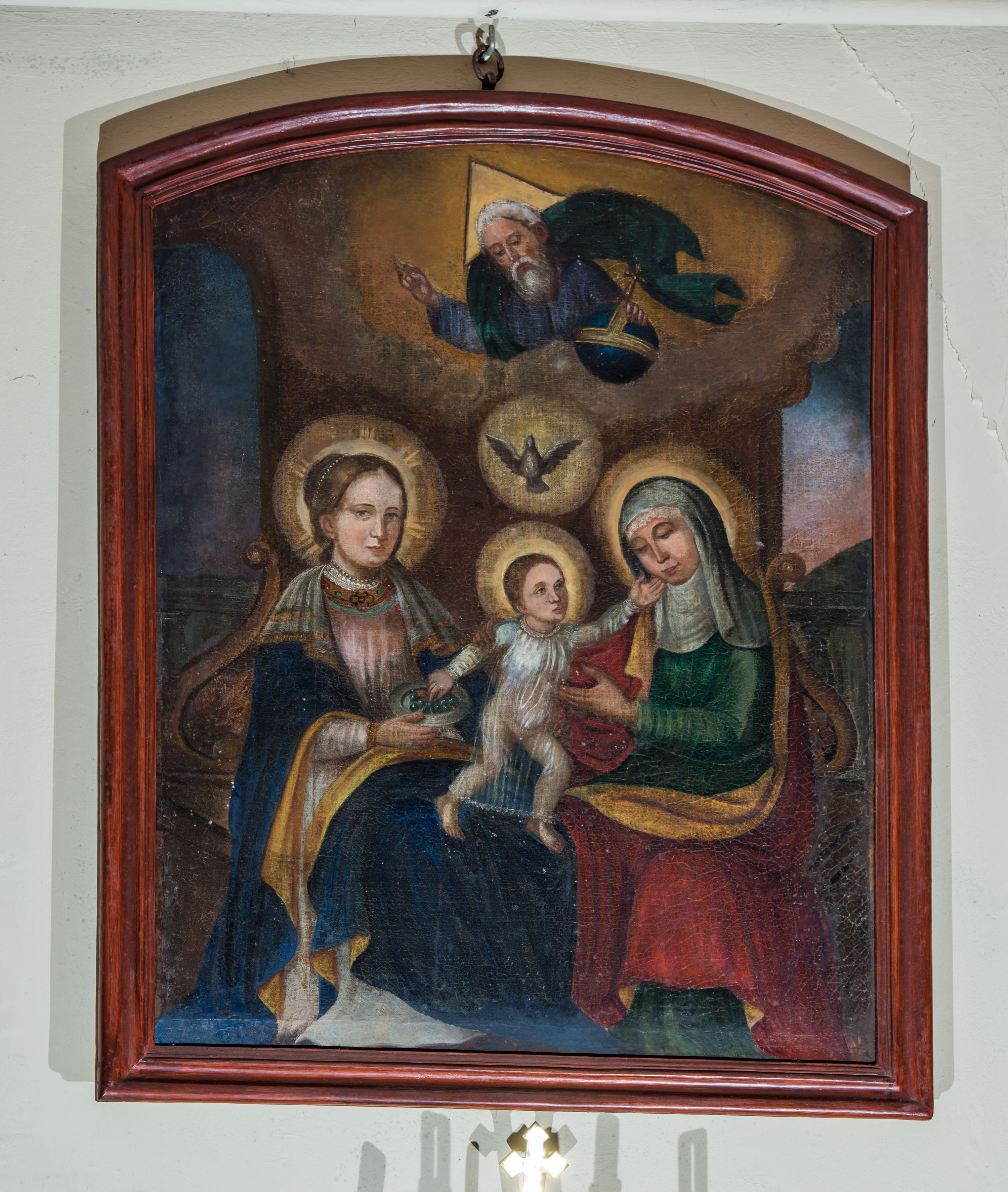 Obraz uzyskał kształt stojącego prostokąta zamkniętego od góry łukiem odcinkowym, ujęty w profilowaną, bejcowaną ramę. W centrum kompozycji wyobrażono siedzące na wspólnej ławie Matkę Boską i św. Annę, pomiędzy którymi znajduje się Dzieciątko Jezus. Ława została zaopatrzona w dwa wolutowe podłokietniki. Siedzącą Marię ujęto w trzech czwartych w prawo. Madonna prawą ręką trzyma srebrny talerz z winnym gronem. Ma pociągłą twarz z wydatnym nosem i ustami oraz spojrzeniem skierowanym w stronę widza. Brązowe włosy ma upięte w koka oplecionego sznurem pereł. Maria ubrana jest w bladoróżową suknię lamowaną pod szyją taśmą z naśladowaniem kameryzacji. Na szyi widoczny jest sznur pereł. Na ramionach narzucony ma ciemnoniebieski płaszcz podbity jasna ochrą, na którym znajduje się biała chusta dekorowana po bokach złotym obszyciem. Wokół głowy Matki Boskiej widoczny jest świetlisty nimb. Na jej kolanach stoi w rozkroku mały Jezus, który lewą rękę wyciąga w stronę św. Anny, a prawą bierze winne grono z talerza trzymanego przez matkę. Dzieciątko ujęte w trzech czwartych ma nieznacznie podniesioną głowę. Jego twarz jest owalna o jasnej karnacji. Głowę Jezusa okalają krótkie brązowe włosy odsłaniające fragment prawego ucha oraz świetlisty nimb. Zbawiciel ma ubraną na sobie przeźroczystą tunikę odsłaniającą bose stopy. Siedząca obok św. Anna ujęta została w trzech czwartych w lewo. Prawą ręką obejmuje Jezusa za ramię, lewą zaś ma wyciągniętą w jego stronę. Anna ma owalną twarz o jasnej karnacji z wydatnym nosem i wargami. Na głowie ma białą chustę oraz podwikę. Anna ubrana jest w zieloną suknię oraz narzucony na ramiona czerwony płaszcz podbity jasną ochrą. Także jej głowę okala świetlisty nimb. Pomiędzy głowami obu niewiast widnieje gołębica Ducha Świętego w świetlistym otoku. Powyżej z obłoków wyłania się w półpostaci Bóg Ojciec. Prawą ręką udziela błogosławieństwa, natomiast lewą podtrzymuje niebieski glob ze złotym krzyżykiem. Jest to starszy mężczyzna o pociągłej twarzy okolonej siwą brodą i włosami. Jego twarz charakteryzuje się wydatnym nosem i ustami. W głębi widoczne są dwie półkoliste arkady z uproszczonymi sekwencjami pejzażowymi.