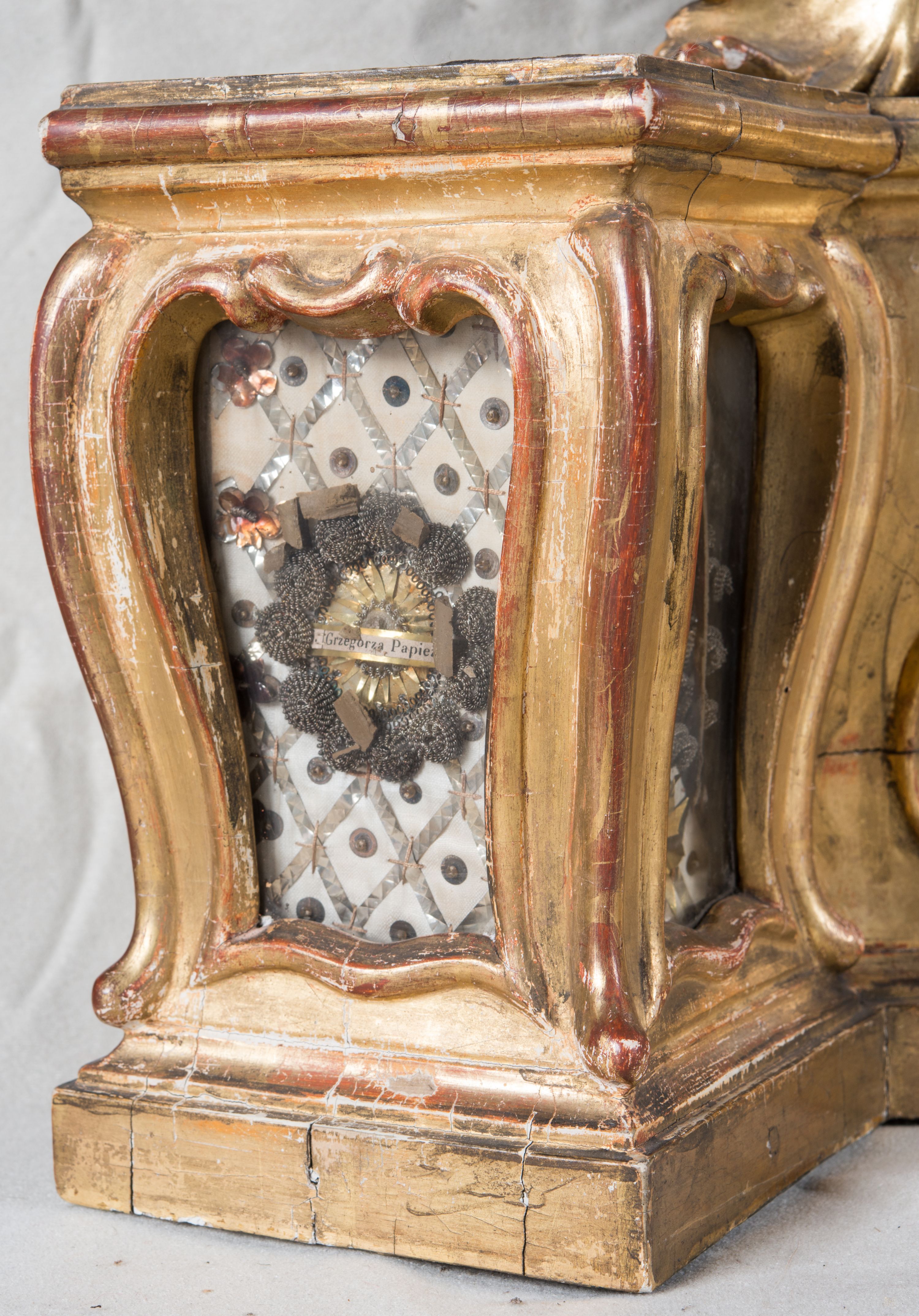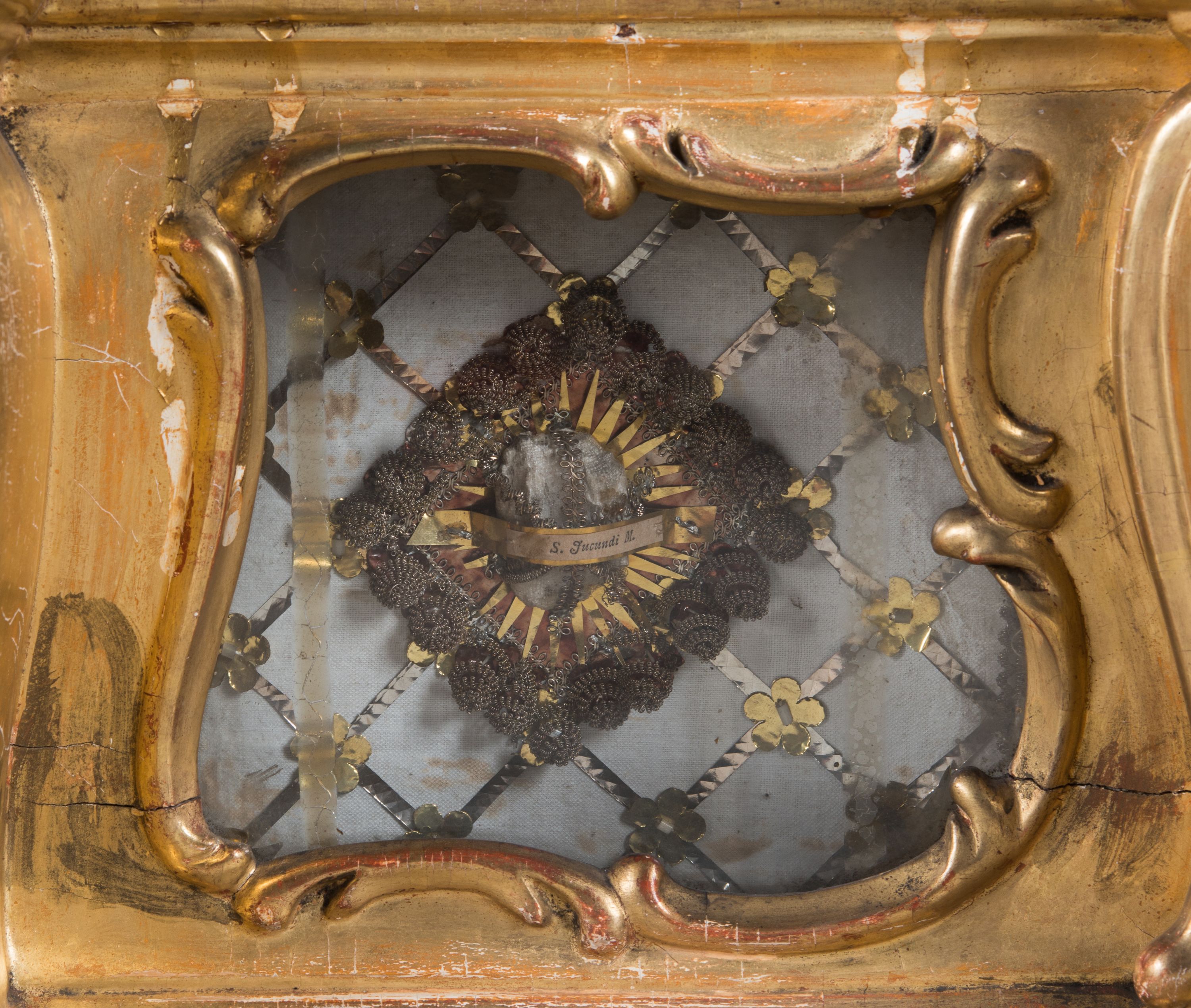 W postumencie dziewięć przeszklonych gablotek mieszczących relikwie świętych, które opisane są na małych karteczkach, otoczone różnego rodzaju kwiatkami