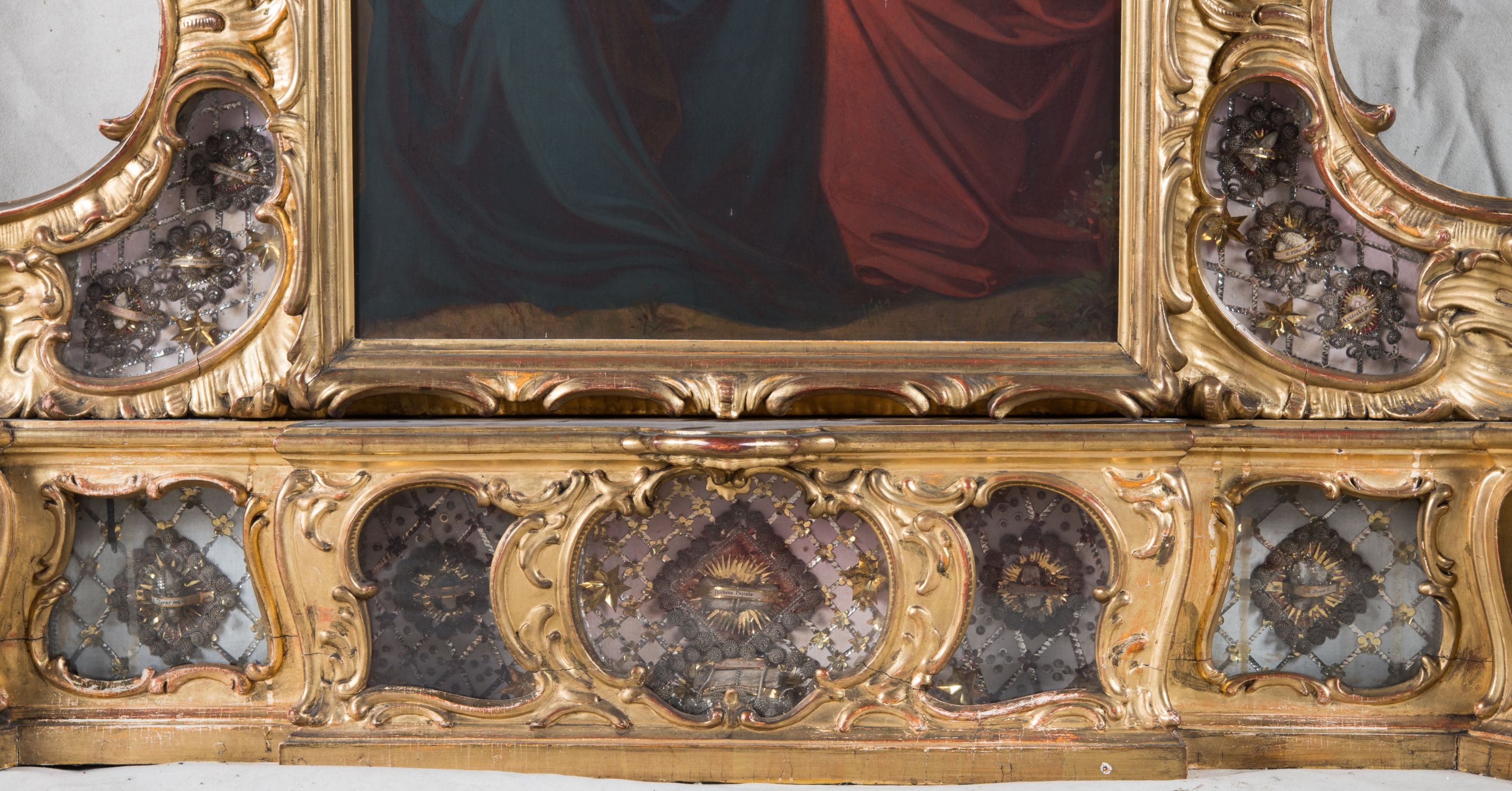 w kształcie stojącego prostokąta, ujęta po każdej stronie trzema gablotkami otoczonymi rzeźbionym ornamentem rocaille'owym. W zwieńczeniu takie same, mniejsze gablotki, pośrodku zamiast relikwii ażurowa, rzeźbiona wić roślinna. Na rewersie struktura feretronu o takim samym kształcie. Podstawa zdobiona siedmioma ramkami