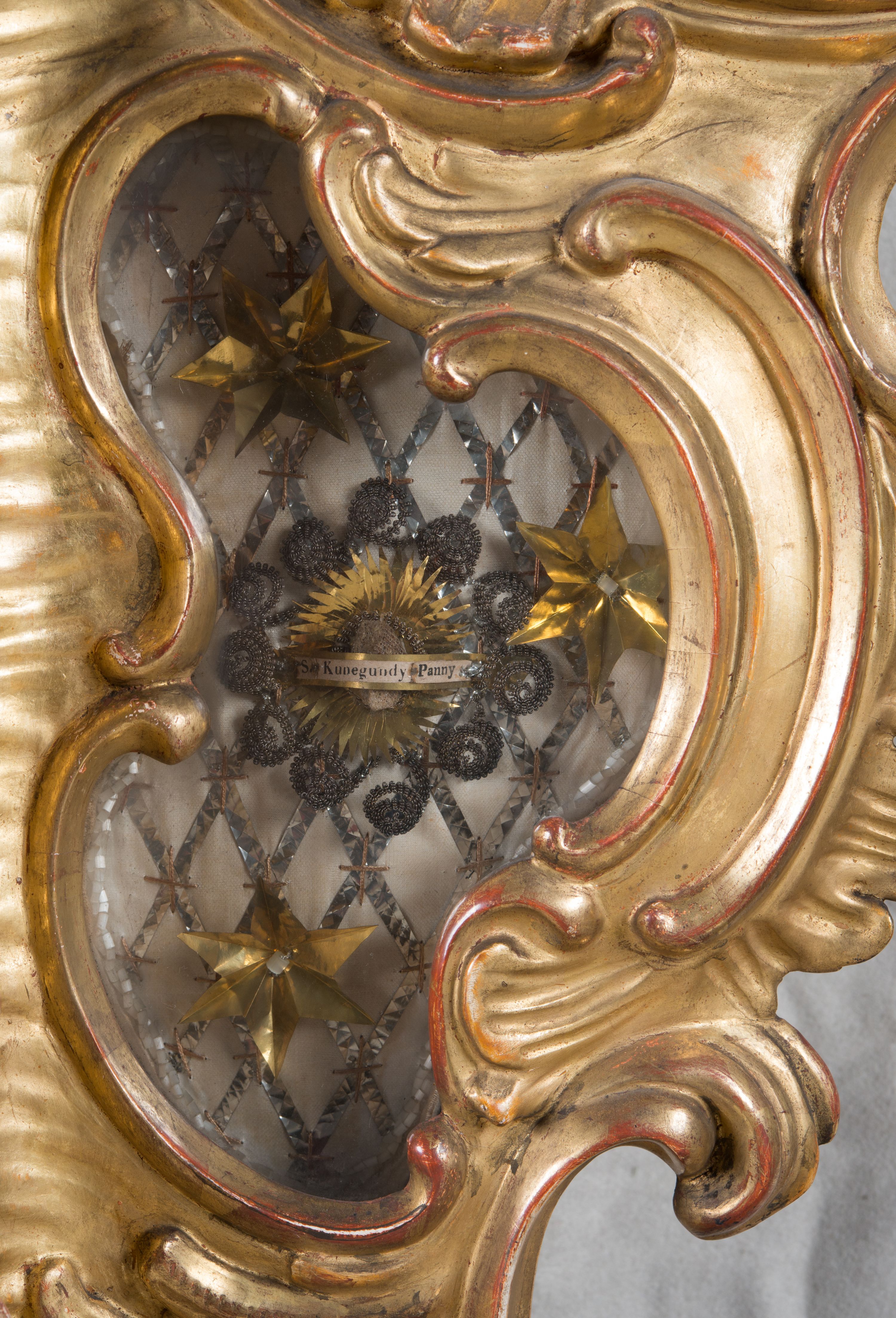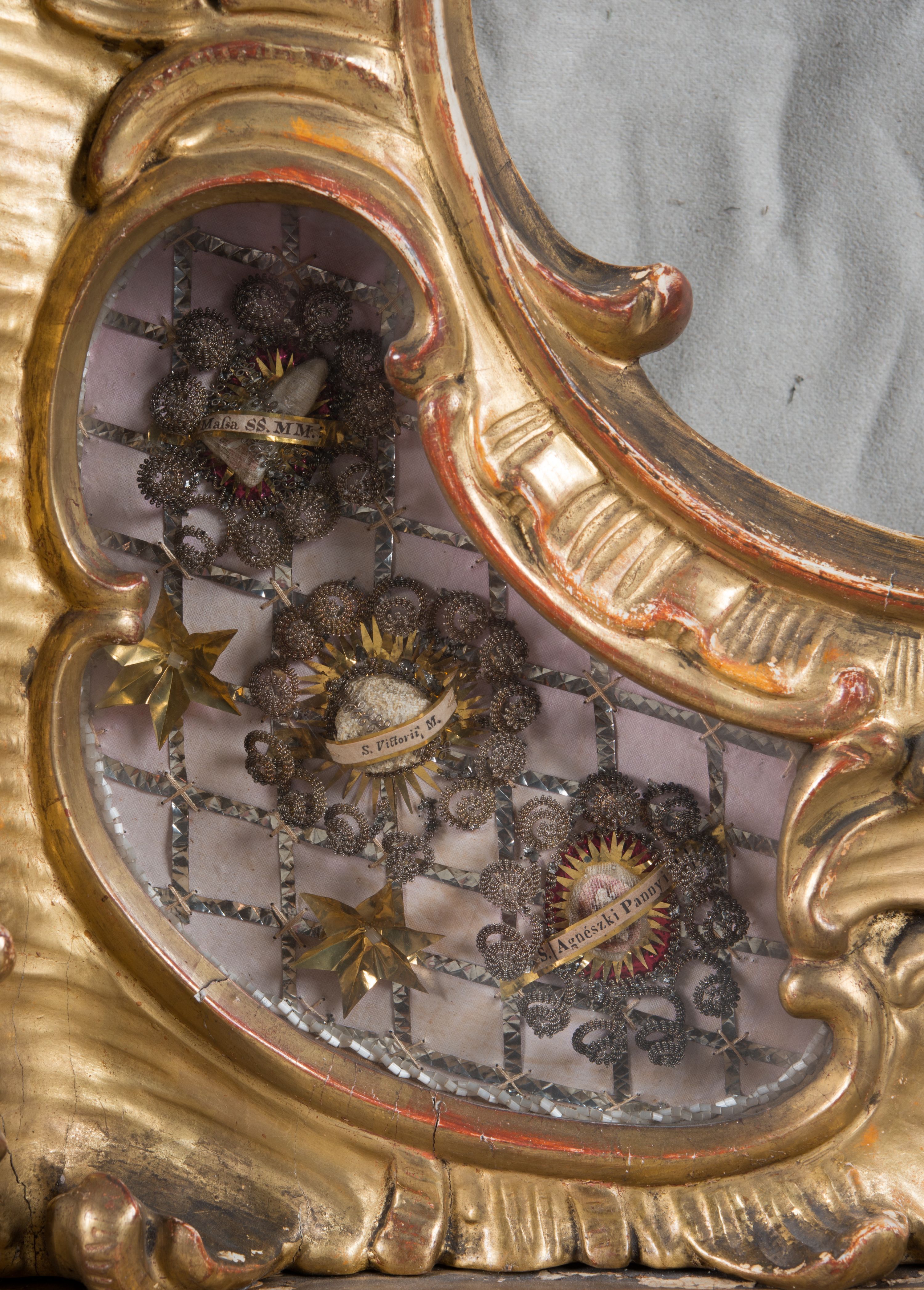 „Sanctae Kunegundy Panny”; relikwie „Mafsa SS. MM.”, „Sanctae Victorii Martyr”, „Sanctae Agnészki Panny i [...]”. Podstawa feretronu, od lewej: relikwie „Sancti Grzegorza Papieża”; relikwie „Sanctae Katarzyny”; relikwie „sanctus Clarus martyr”; relikwie „Sanctae Theogeni Martyr”; relikwie