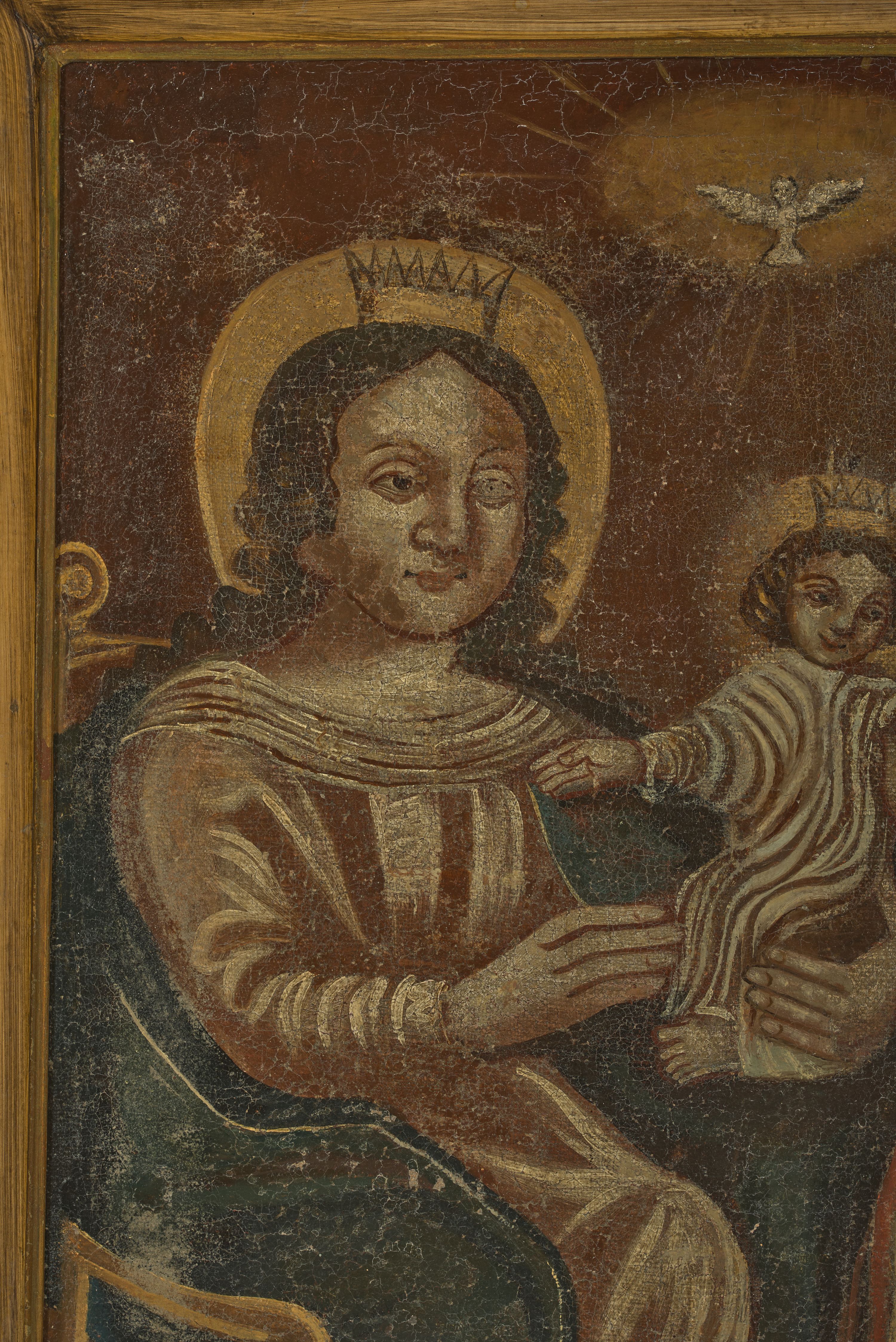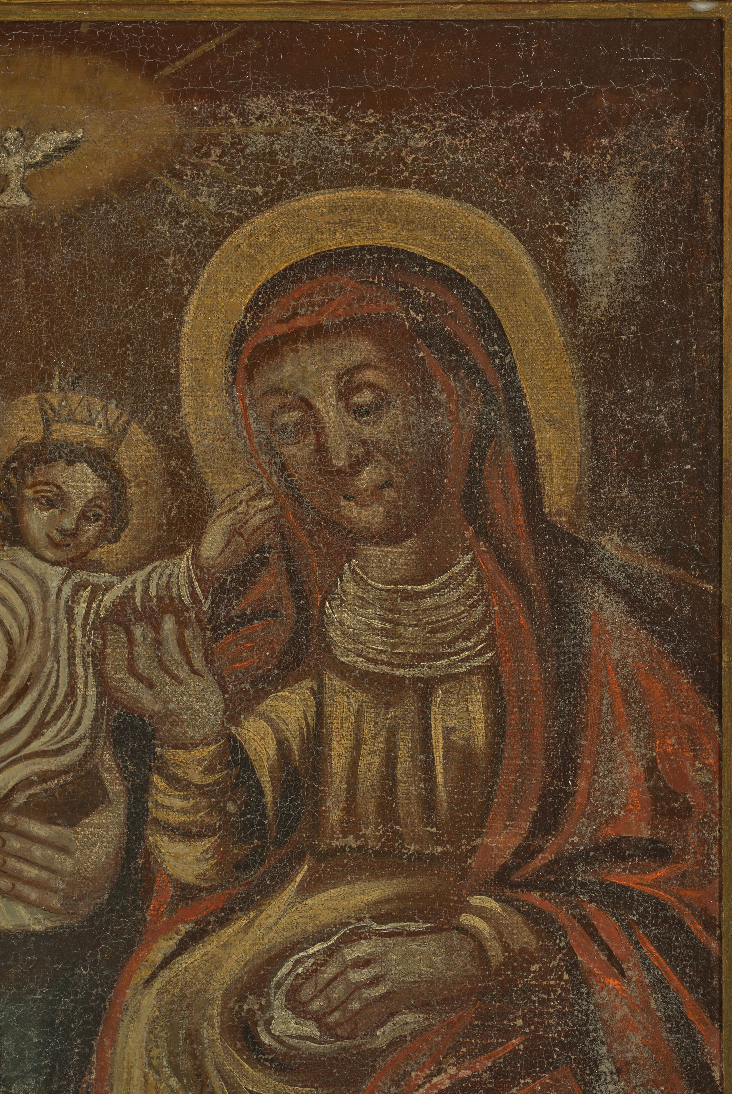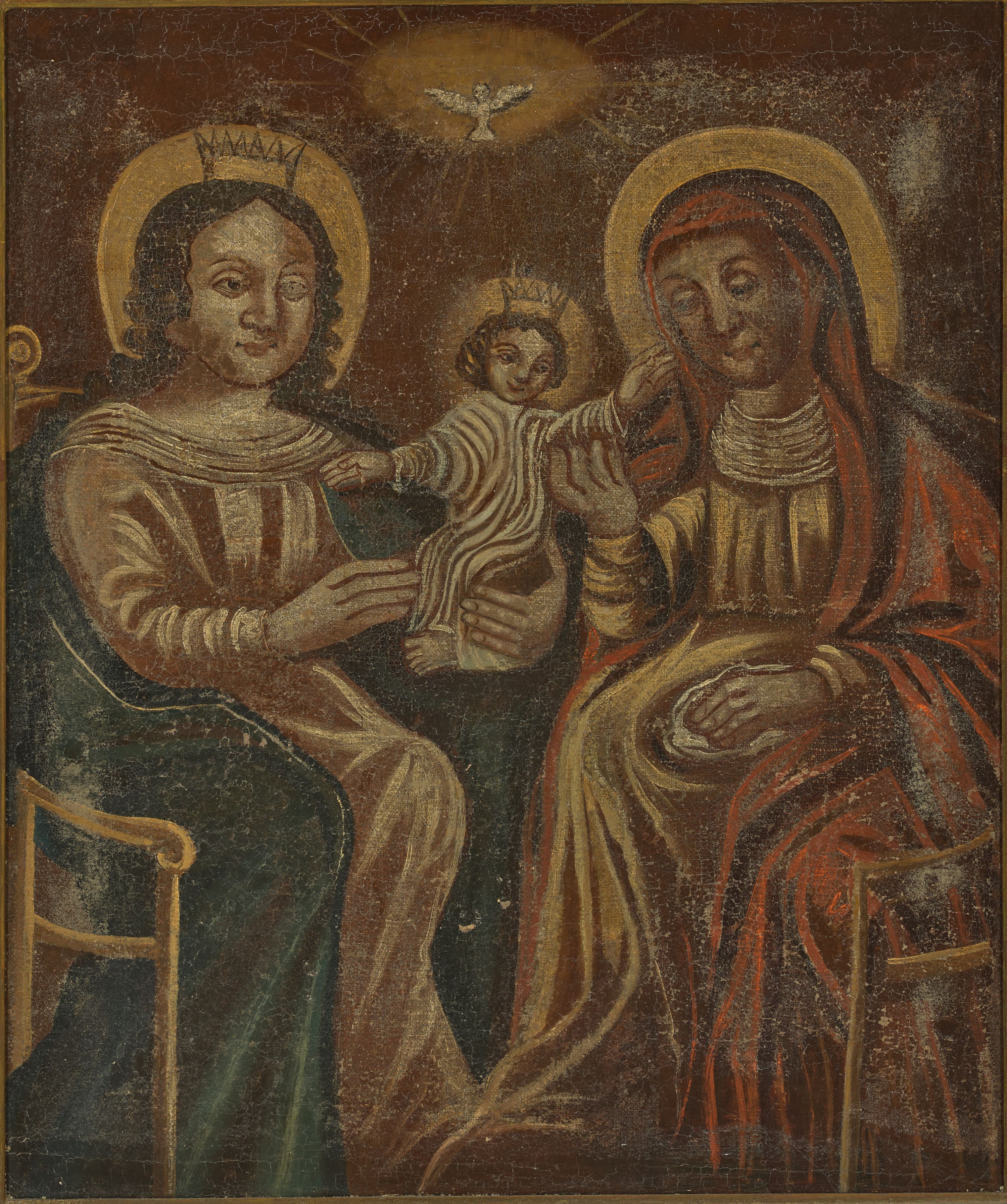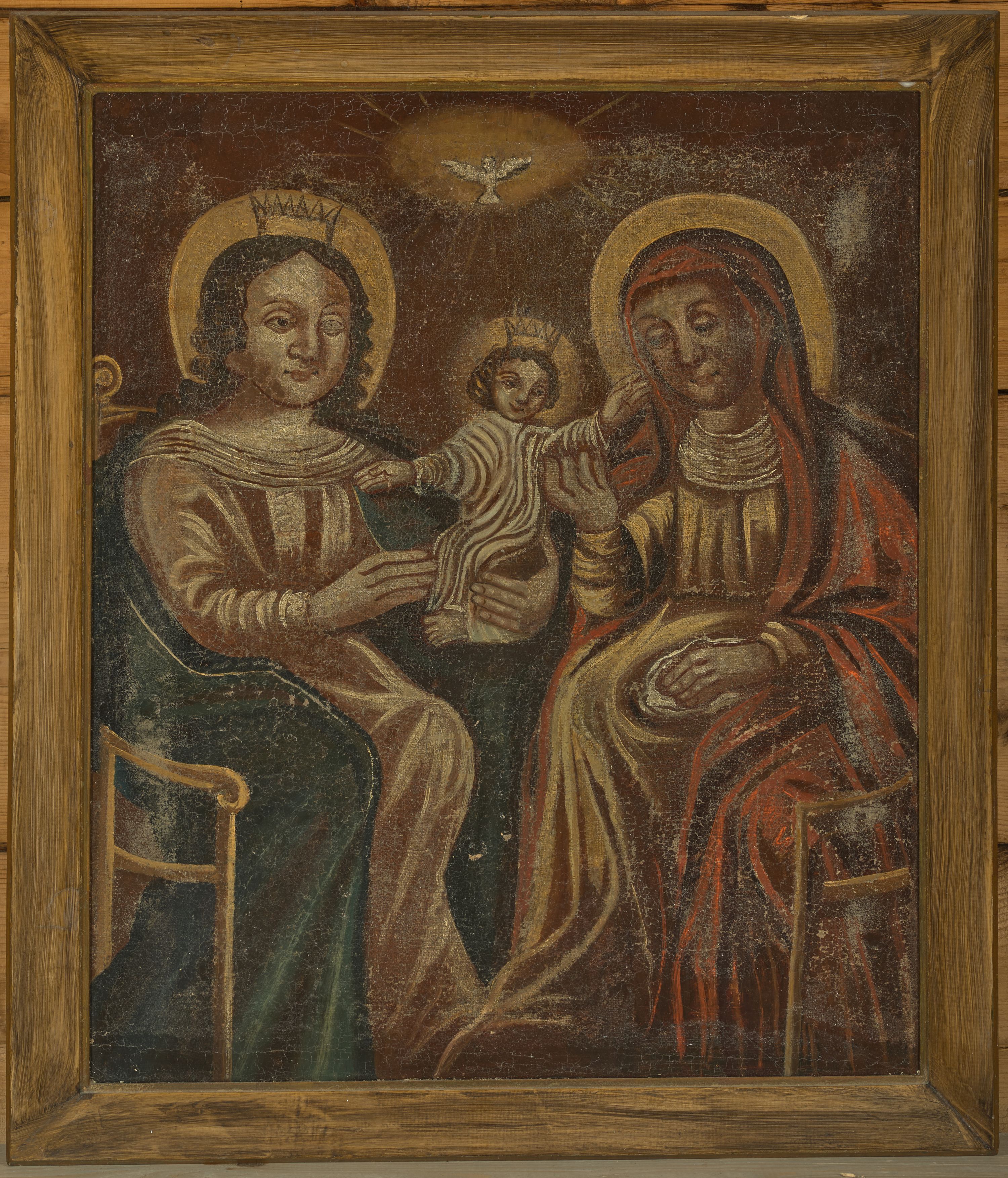 Obraz w kształcie stojącego prostokąta ujęty prostą, drewnianą ramą z przedstawieniem św. Anny Samotrzeć. Na obrazie zostały ukazane: po prawej stronie św. Anna, a po lewej Matka Boska, obie zwrócone ku sobie, siedzące na drewnianych krzesłach z podłokietnikami. Pośrodku znajduje się Dzieciątko Jezus siedzące na ręku Matki Boskiej. Święta Anna jest delikatnie pochylona w stronę Dzieciątka, lewą rękę ma położoną na kolanach na białej chusteczce, a prawą ujmuje Jezusa za rączkę. Ubrana jest w jasnobrązową suknię przepasaną w talii oraz czerwony płaszcz założony na głowę i spływający na plecy oraz ramiona; wokół szyi ma drapowaną, białą chustę. Święta ma owalną twarz o delikatnych rysach z niedużymi oczami, długim nosem i wąskimi ustami. Po lewej stronie obrazu Maria podtrzymuje obiema rękami Dzieciątko Jezus. Ubrana jest w długą, jasnoróżową suknię z długimi rękawami oraz ciemnoniebieski płaszcz założony na plecy i spływający na kolana, na głowie ma założoną złotą, otwartą koronę. Ma pełną twarz, głęboko osadzone oczy, które są okolone wąskimi łukami brwiowymi, długi i szeroki nos oraz małe usta. Włosy długie, kręcone, ciemnobrązowe z przedziałkiem pośrodku, spływające na ramiona i plecy. Dzieciątko z rozłożonymi szeroko na boki rączkami ukazane jest frontalnie w pozycji siedzącej z nóżkami skierowanymi w prawo. Ma okrągłą twarz o dziecięcych rysach, włosy krótkie i kędzierzawe, a na głowie ma założoną otwartą koronę. Ubrane jest w długą, białą sukienkę silnie marszczoną w pionowe fałdy. Wokół głów Matka Boska, św. Anna i Dzieciątko mają koliste i złocone nimby. W górnej części obrazu na tle złocistej glorii znajduje się biała gołębica Ducha Świętego z rozpostartymi szeroko skrzydłami. Tło obrazu ciemnobrunatne. Rama prosta, drewniana.