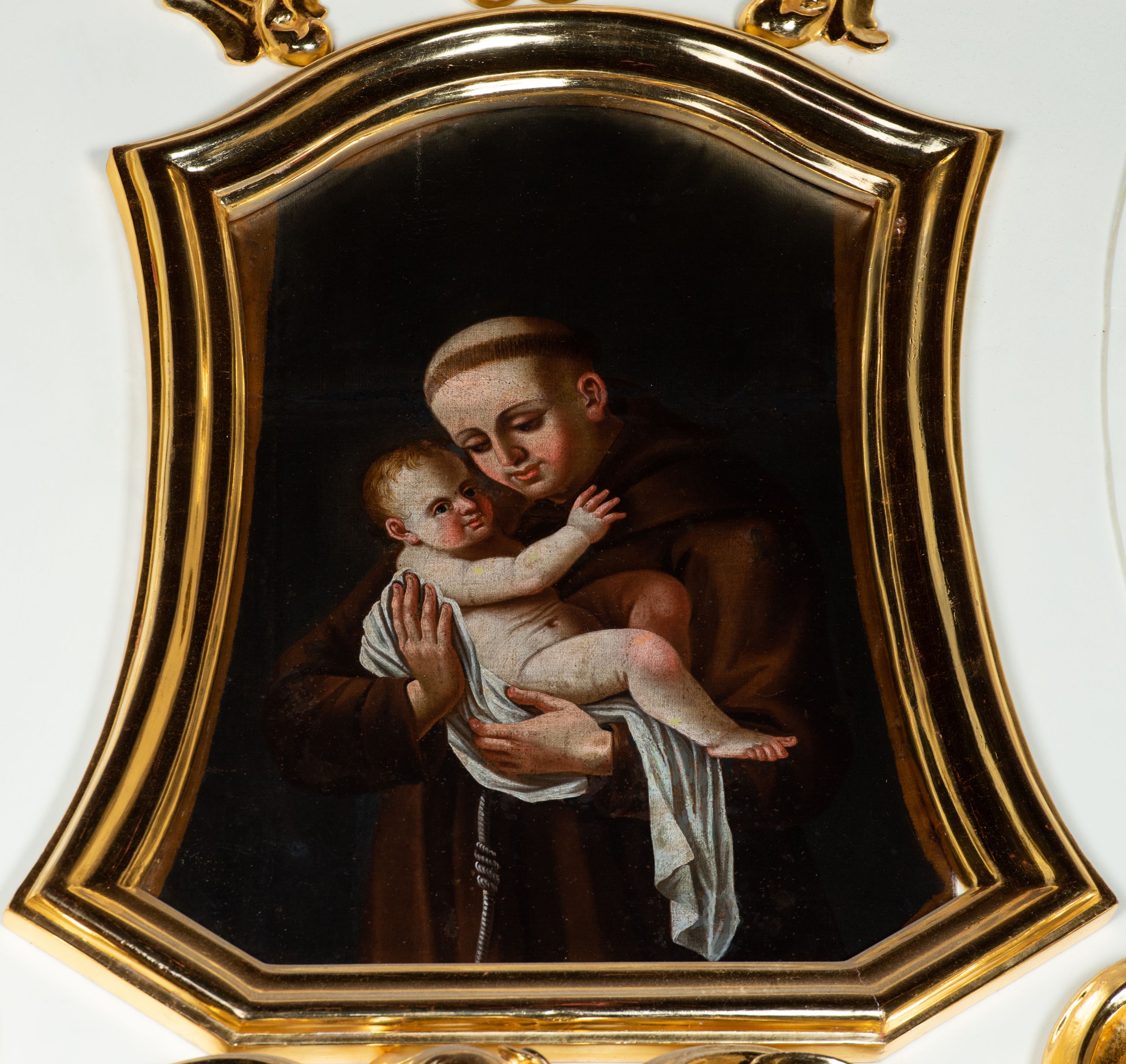 Obraz w kształcie stojącego prostokąta, zamkniętego łukiem nadwieszonym o delikatnie wklęsłych bokach przedstawiający św. Antoniego Padewskiego z Dzieciątkiem. W centrum ukazany święty w postawie stojącej, w półpostaci, zwrócony trzy czwarte w prawo z Dzieciątkiem Jezus na rękach. Twarz okrągła z wyraźnie zaznaczonym podbródkiem, drobnymi ustami, długim nosem i silnie zarumienionymi policzkami. Ubrany jest w habit franciszkański, przewiązany sznurem, a na głowie ma tonsurę. Dzieciątko zwrócone jest trzy czwarte w lewo, odchylone do tyłu z rączkami sięgającymi w stronę świętego, ułożone na białej pieluszce spływającej jednym końcem w dół. Twarz o delikatnych, dziecięcych rysach o zarumienionych policzkach, dłoniach, kolanach i stopach. Włosy krótkie, kędzierzawe i jasne. Tło jednolite, czarne. Rama drewniana, profilowana i złocona w kształcie stojącego prostokąta, o ściętych dolnych narożach, bokach wklęsłych i zakończona łukiem wklęsło-wypukłym.