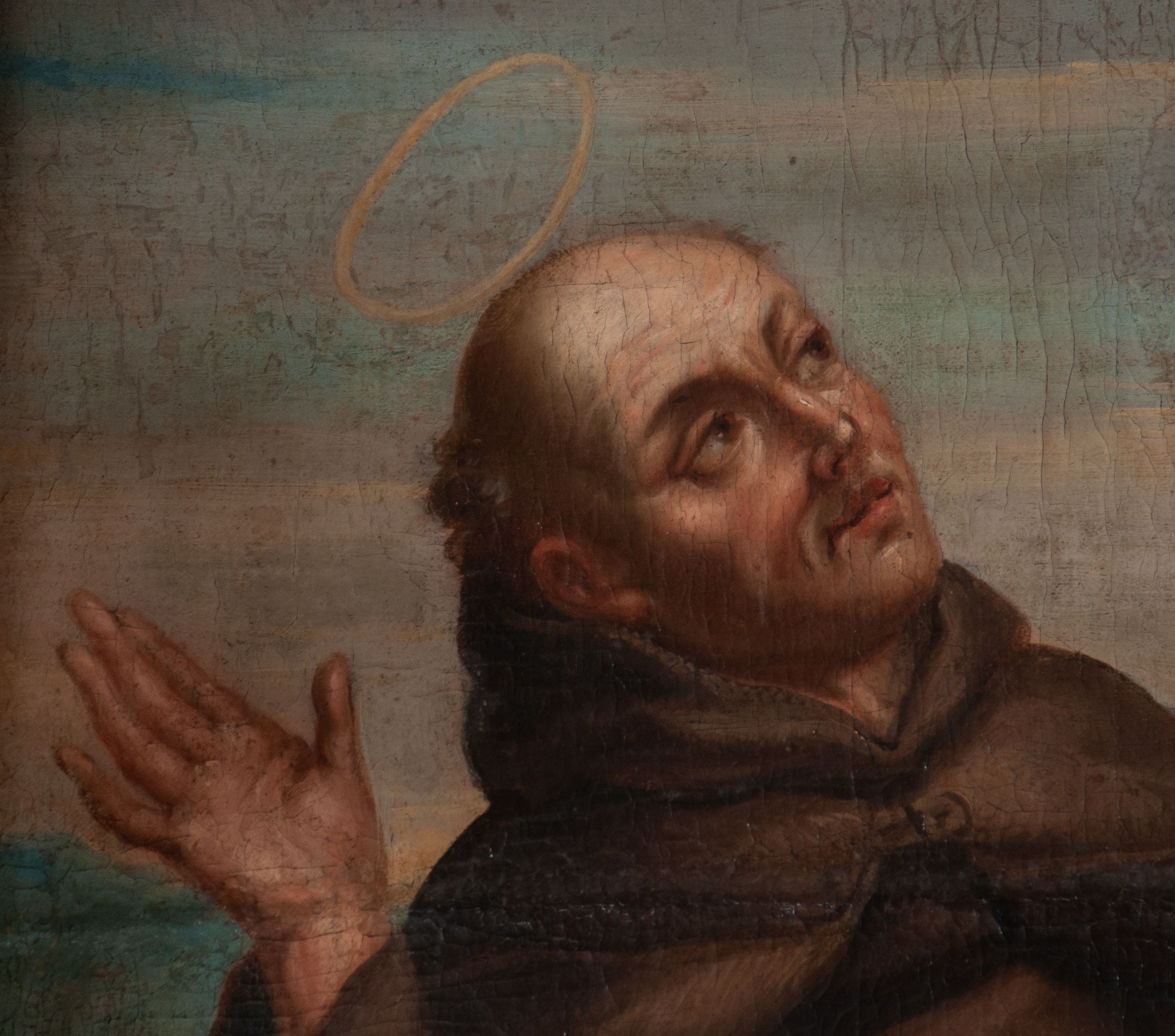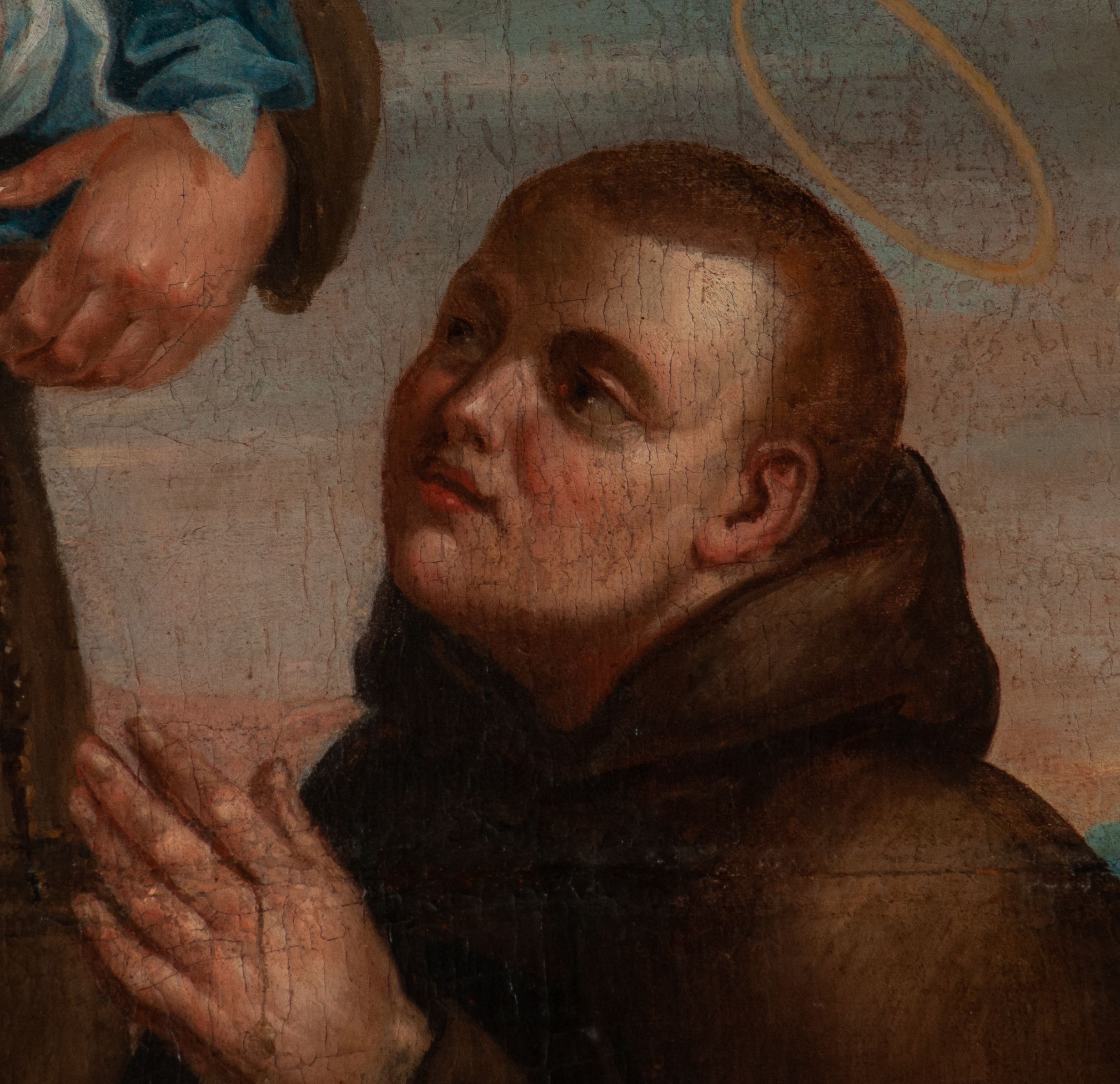 Obraz znajduje się w ołtarzu bocznym przytęczowym, który powstał po 1718 roku z fundacji rodziny Grabowskich z Wieliczki oraz innych mieszczan i górników wielickich. Obraz św. Antoniego Padewskiego jest osiemnastowieczną kopią obrazu, który spłonął wraz poprzednim ołtarzem w 1718 roku. Spalony obraz według tradycji franciszkańskiej był starszy od samego założenia klasztornego i pochodził z kapliczki, która znajdowała się na gruncie wójtostwa. Z kapliczki do kościoła przeniesiono wizerunek Matki Boskiej Łaskawej (obecnie w kaplicy bocznej) oraz wspominany obraz św. Antoniego Padewskiego i umieszczono je w ołtarzach bocznych nowo wybudowanego kościoła. Natomiast samą kapliczkę – zburzono. Św. Antoni, czyli Fernando Bullone urodził się około 1195 roku w Lizbonie w Portugalii. W wieku około 15 lat wstąpił do zakonu kanoników regularnych św. Augustyna, przyjmując imię Antoni, a następnie w 1220 roku do zakonu braci mniejszych. Zmarł w 1231 roku. Święty jest czczony przez górników jako patron zagubionych i zaginionych. Uciekano się do niego w przypadku zabłądzenia w wyrobiskach, czy w przypadku zawału i konieczności poszukiwania drogi wyjścia z zawaliska, a także podczas prób lokalizacji zasypanych górników.