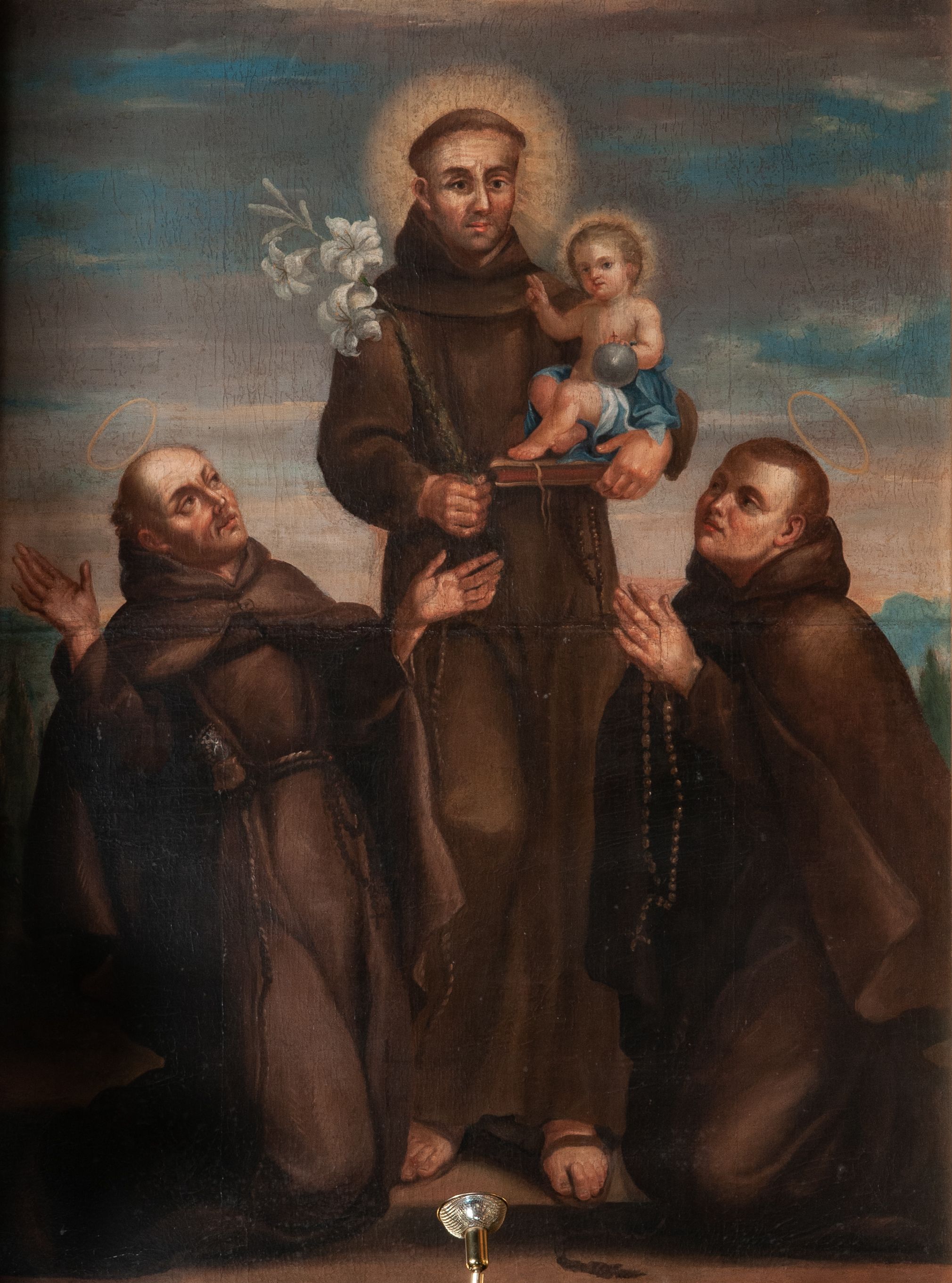 Obraz w kształcie stojącego prostokąta przedstawiający św. Antoniego Padewskiego i dwóch świętych franciszkańskich. W centrum kompozycji ukazany św. Antoni w postawie stojącej, z gałązką białej lilii w prawej dłoni i różańcem, z Dzieciątkiem Jezus siedzącym na księdze, na lewej dłoni świętego. Twarz podłużna, z długim i szerokim na końcu nosem, wzrokiem skierowanym na wprost. Święty ubrany w habit franciszkański, z tonsurą na głowie i złocistym nimbem wokół niej; na stopach sandały. Dzieciątko Jezus zwrócone trzy czwarte w prawo, prawą rączką czyniące gest błogosławieństwa, w lewej trzymające jabłko królewskie. Ubrane jest w białą pieluszkę, opasającą biodra. Wokół głowy ma złoty, świetlisty nimb. Po bokach obrazu ukazani dwaj franciszkanie w pozycji klęczącej, ubrani w habity i płaszcze franciszkańskie z okrągłymi nimbami nad głowami. Zakonnik po lewej stronie obrazu z szeroko rozłożonymi na boki i uniesionymi do góry rękami, zakonnik po prawej z rękami złożonymi w geście modlitwy. W oddali widoczny pejzaż górski. W górnej części kompozycji rózowo-błękitne, pochmurne niebo. Rama drewniana, profilowana, złocona.