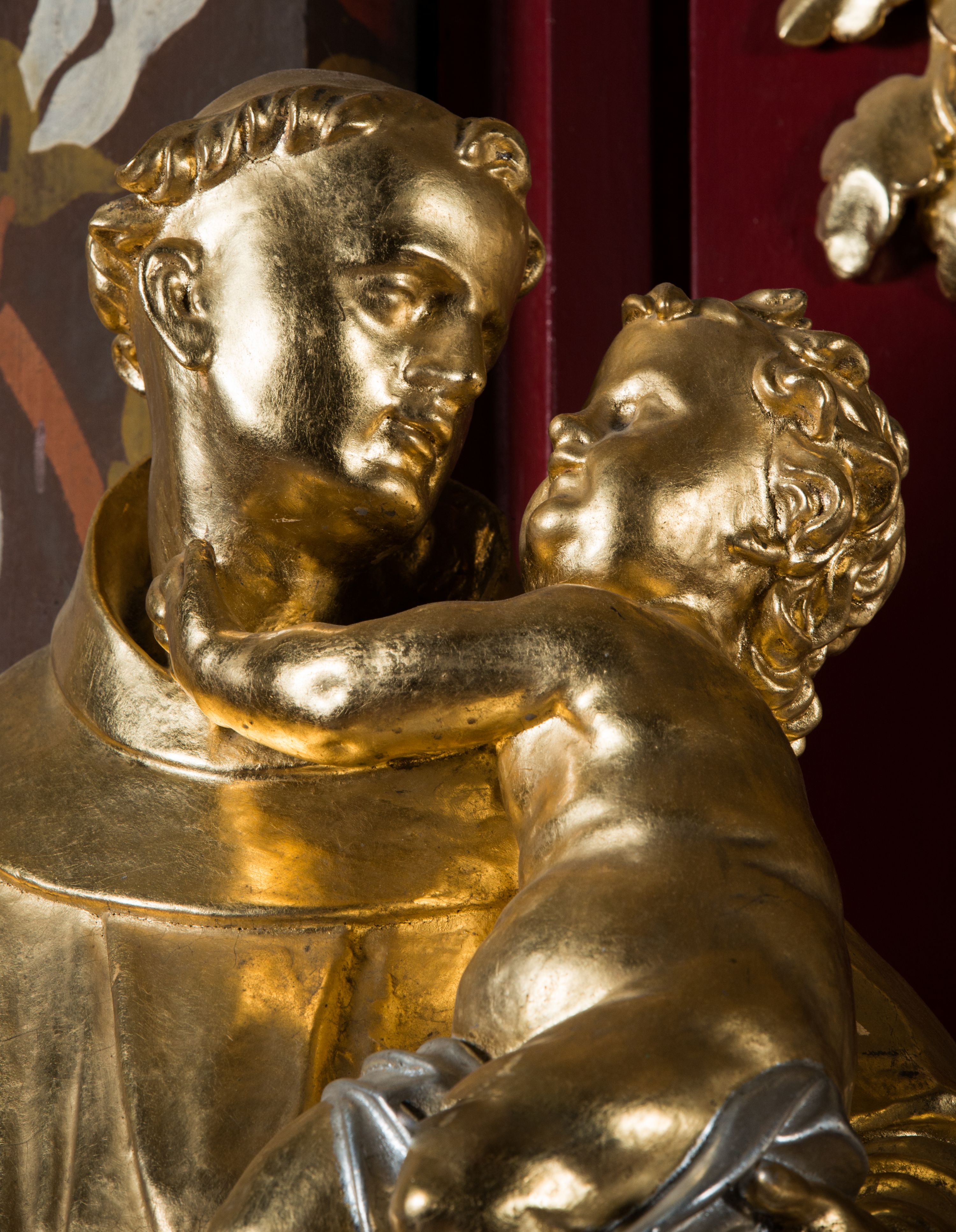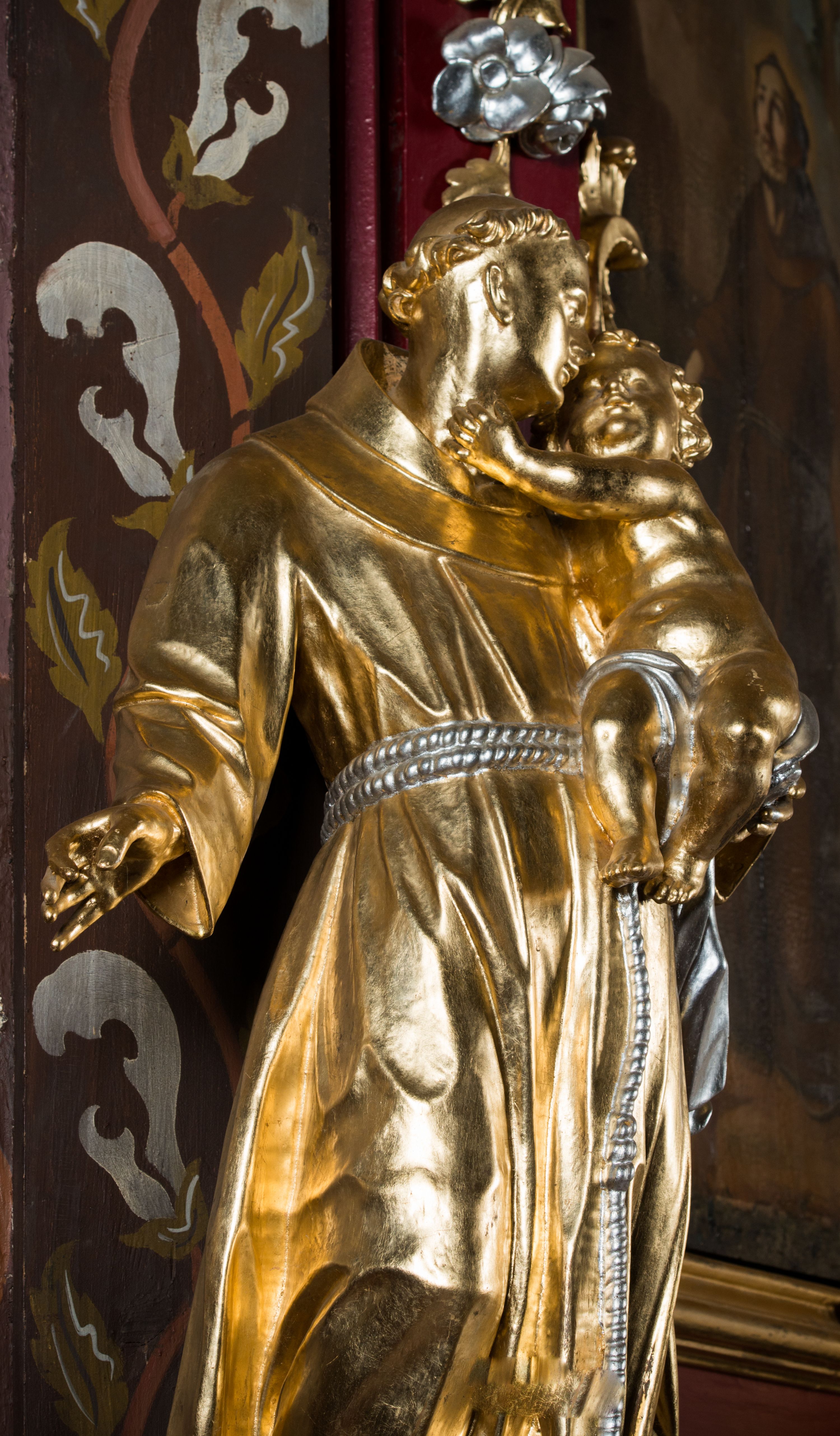 Święty Antoni w młodym wieku wstąpił do zakonu kanoników regularnych, dopiero później do franciszkanów. Prowadził działalność kaznodziejską, jak również był wykładowcą na uniwersytecie w Bolonii. Pozostawił po sobie liczne teksty kazań. Święty Antoni otrzymał tytuł doktora Kościoła. W ikonografii przedstawiany jest w habicie franciszkańskim z tonsurą na głowie. Często trzyma bądź adoruje Dzieciątko, gdyż według legendy świętemu ukazał się Jezus. Jego atrybutem jest również lilia, która zapewne pierwotnie znajdowała się w prawej dłoni figury świętego.